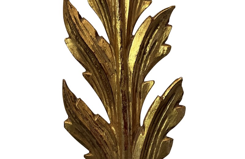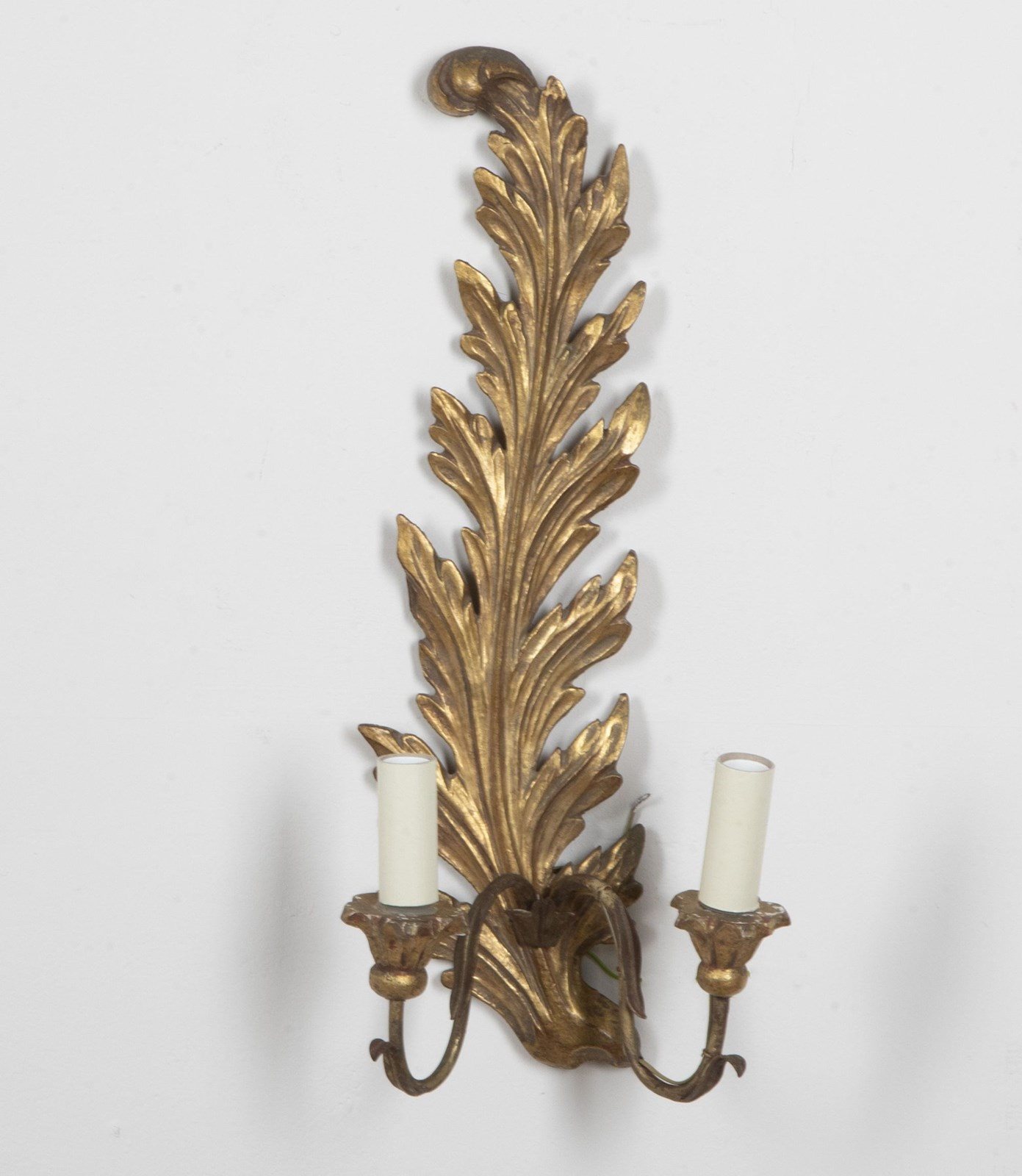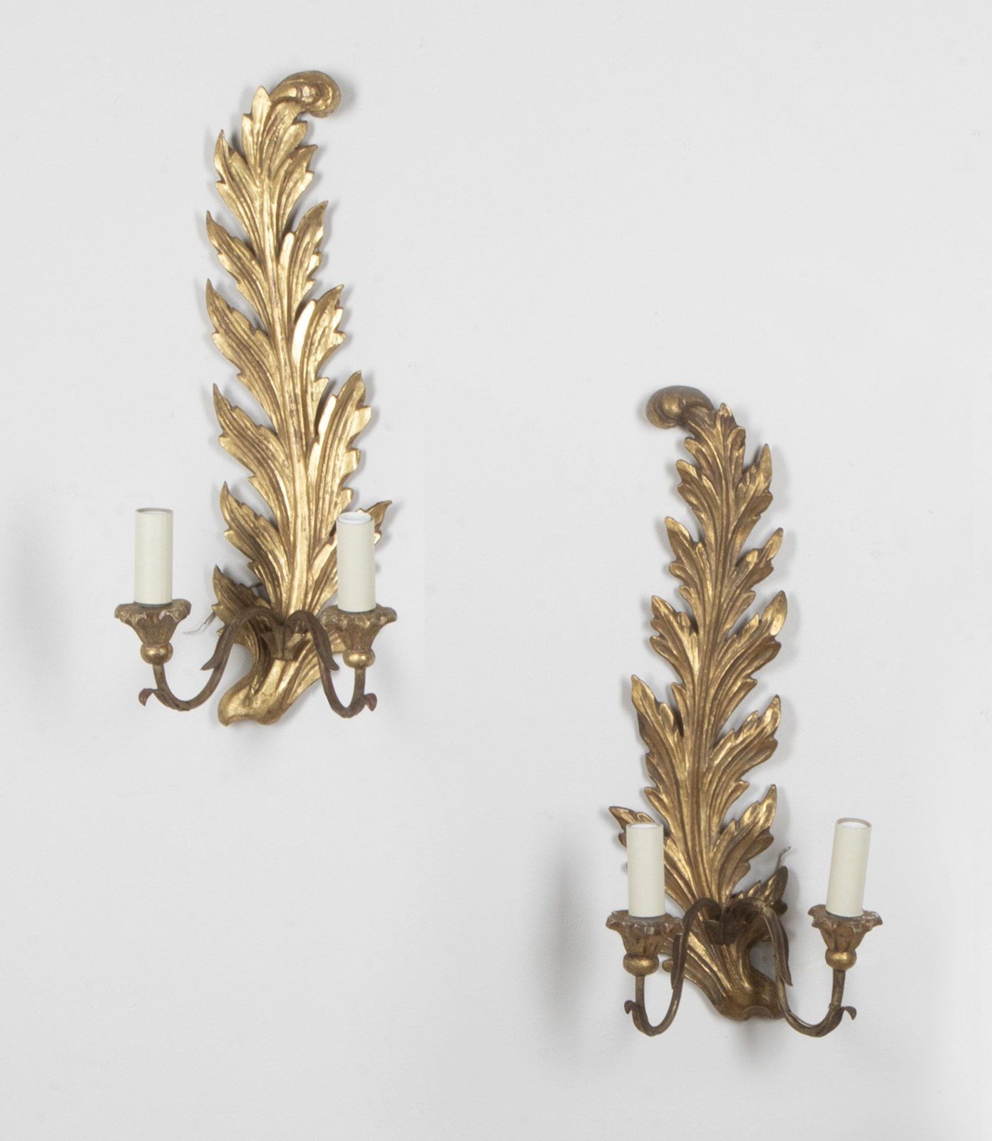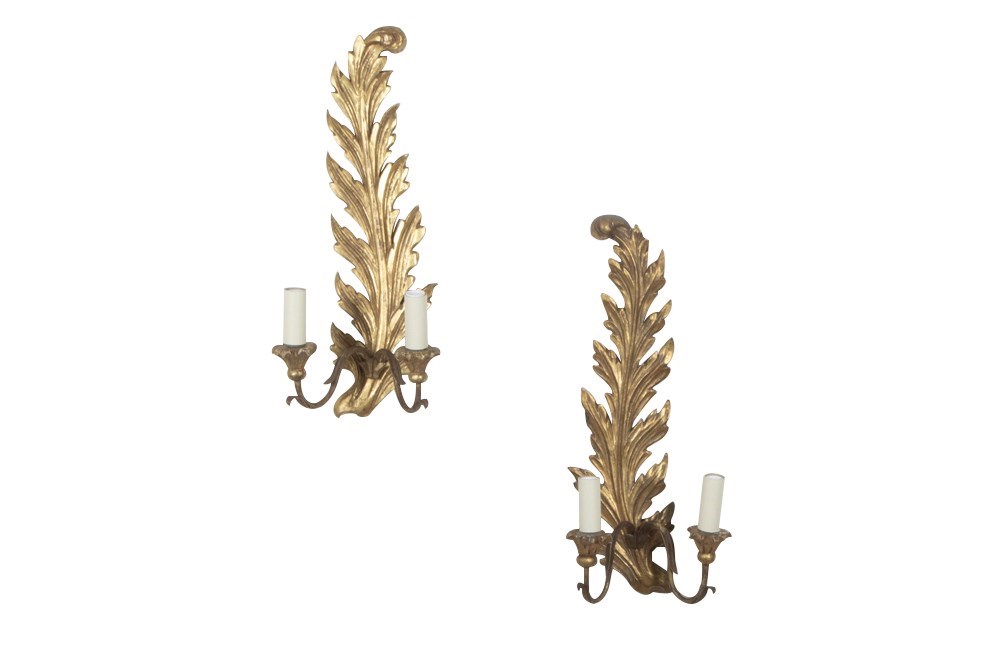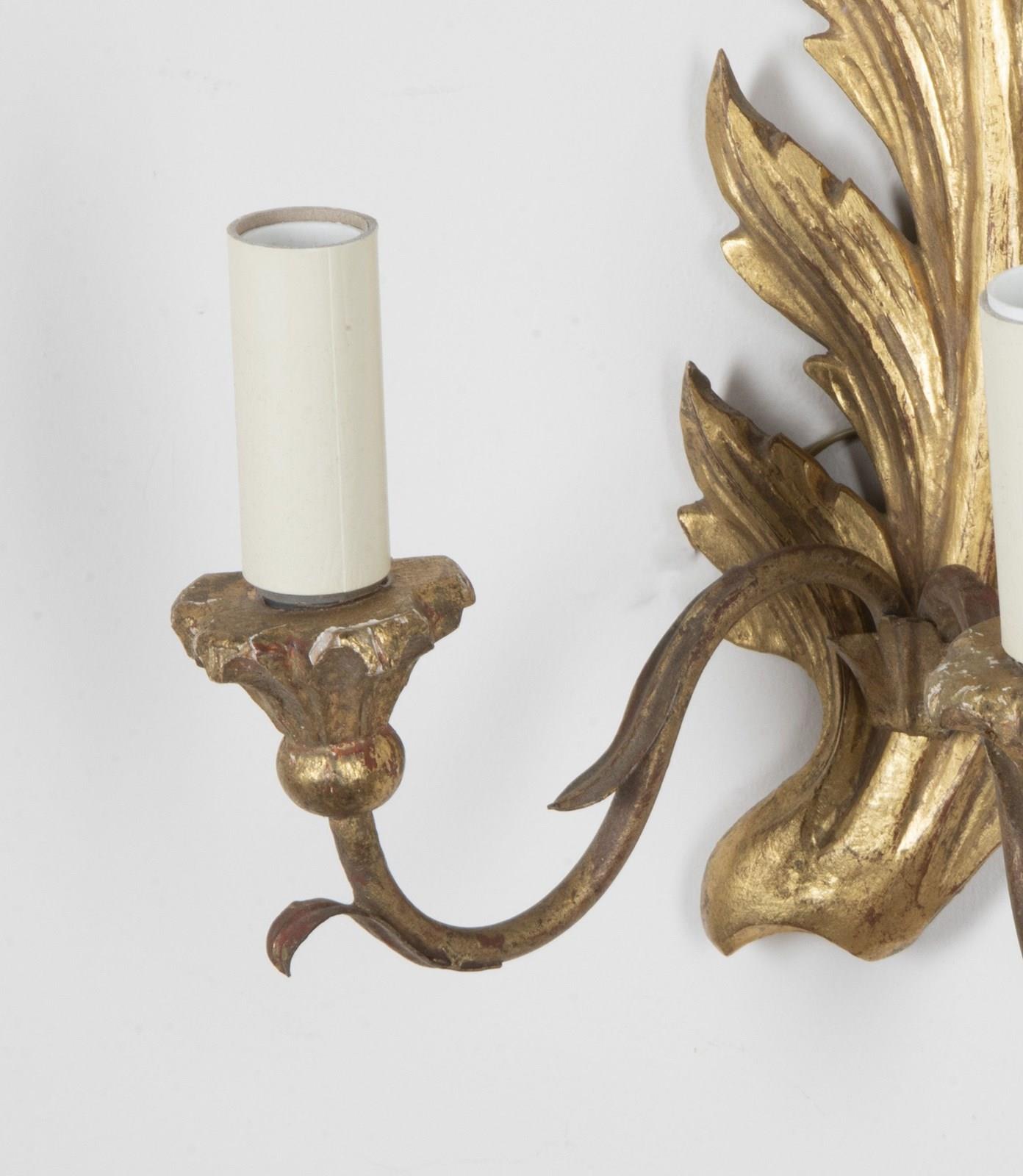 Pair of carved gilt wood appliques in the form of feather plumes. Each wall sconce has two curved iron arms terminating in giltwood candle/bulb holders.