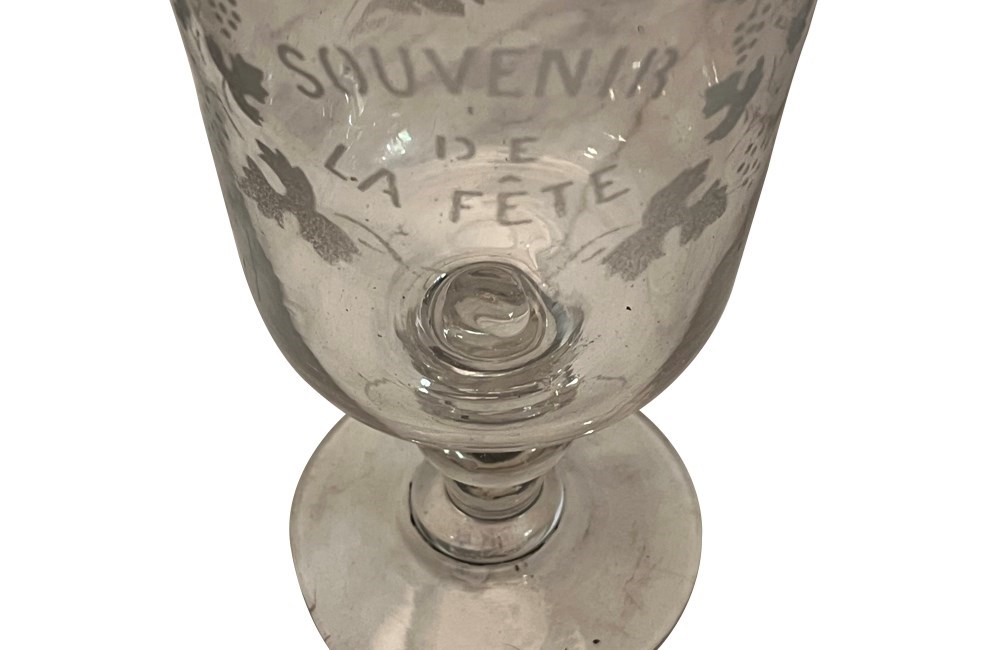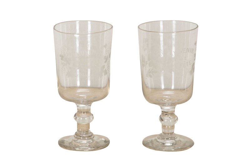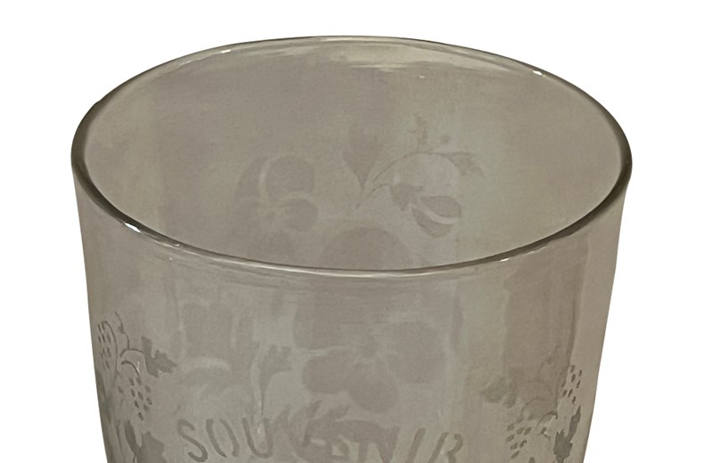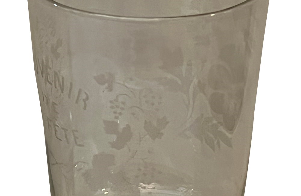 One side of each glass etched with the inscription 'Souvenir De La Fete' (Translation: Souvenir of the Celebration). Surrounded with a fruiting grape vine. The other side is etched with a floral motif of pansies, symbolic of loving thoughts and memories.