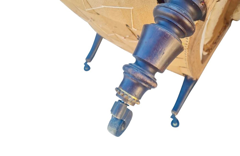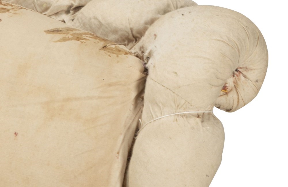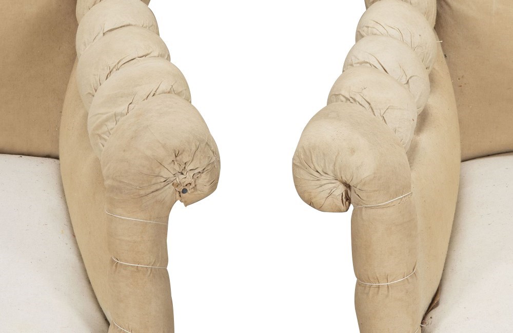 Lovely scrolled arms and ebonised turned feet terminating on casters. Ready for recovering.