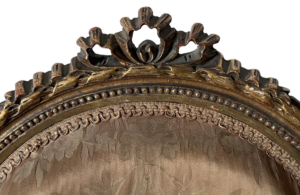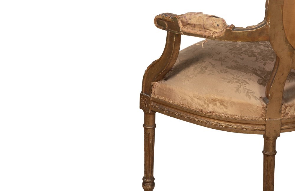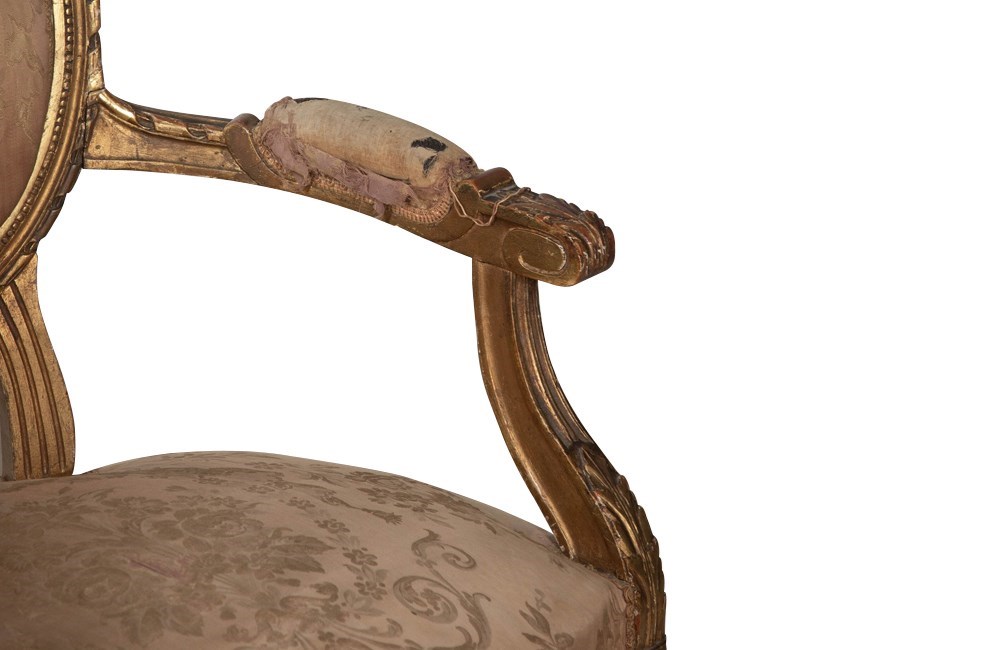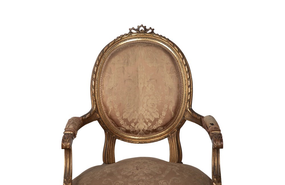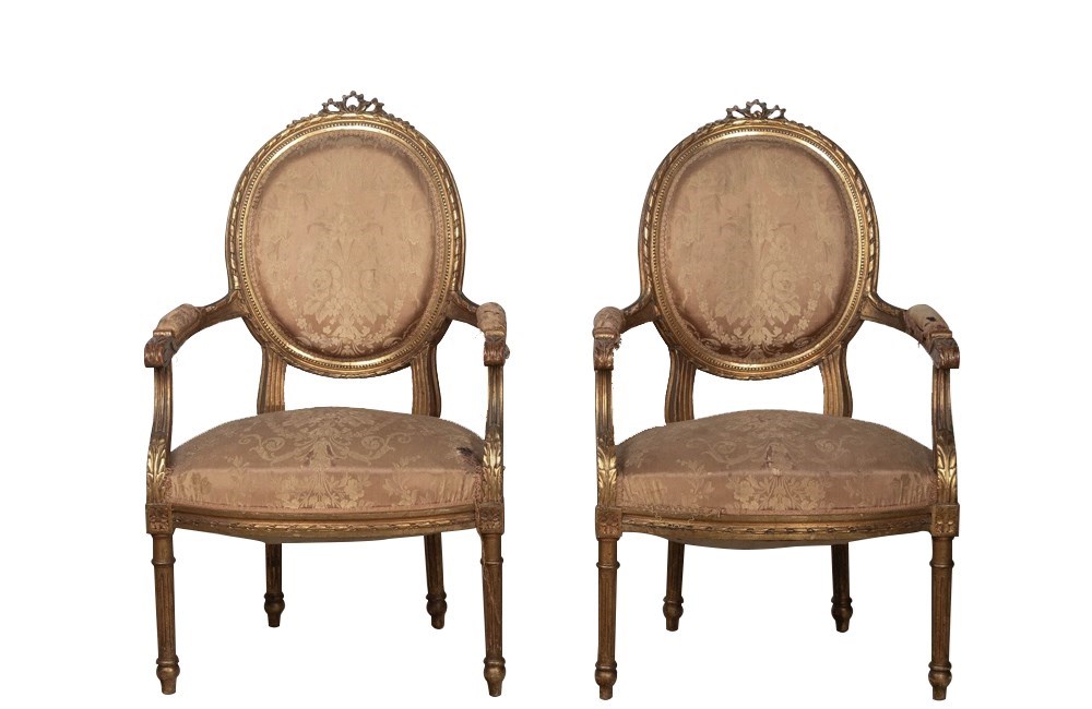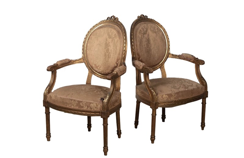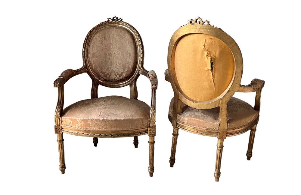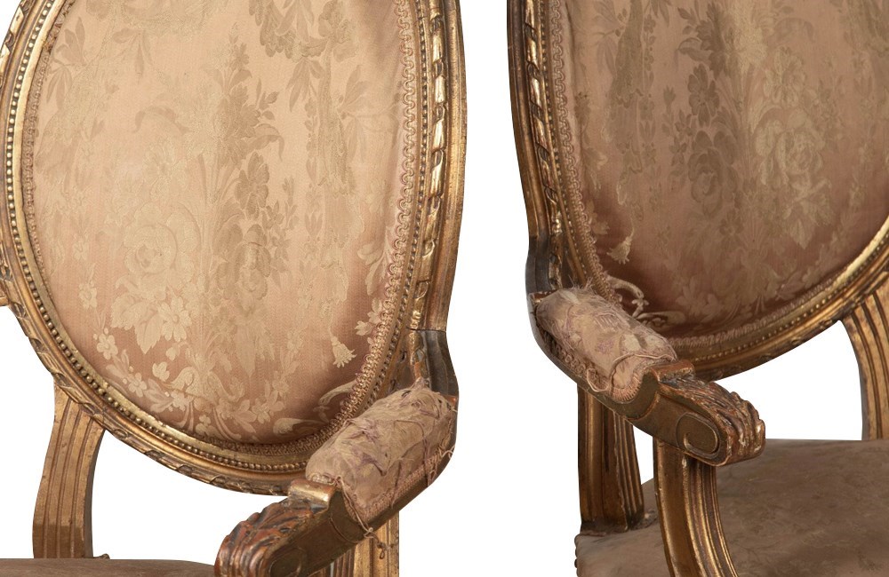 These beautiful medallion back armchairs retain their worn silk fabric.