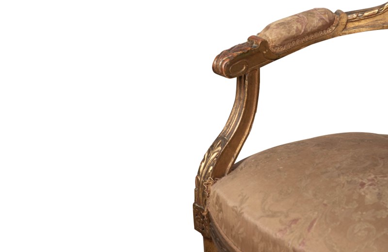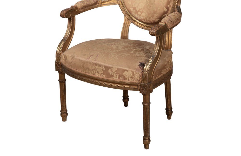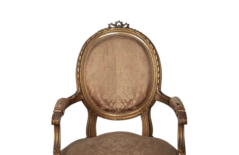 Pair of 19th century, French giltwood fauteuils in the Louis XVI style. Each open armchair is carved with scolled ribbons, acanthus leaves, rosettes, beading and a bow to the top