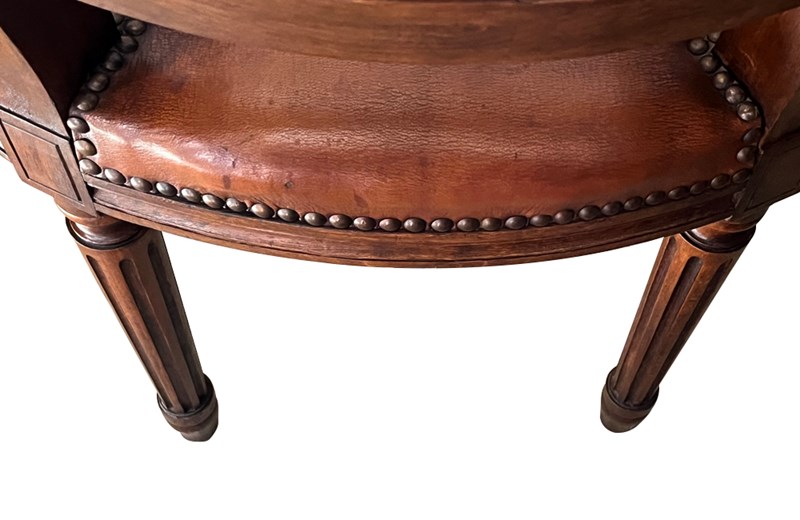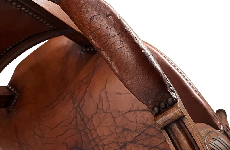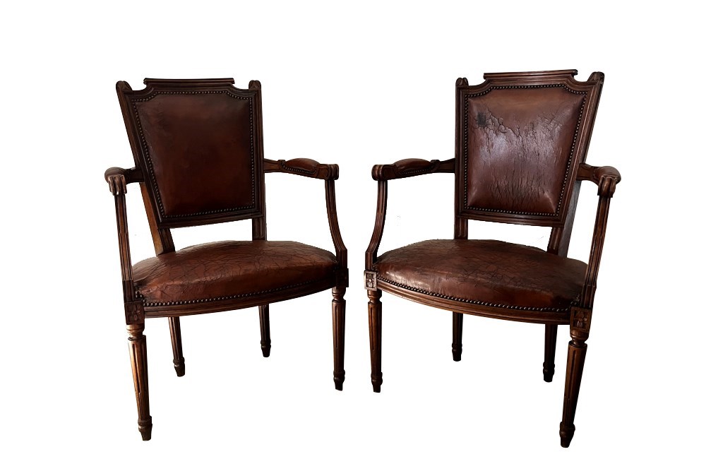 Elegant pair of 20th Century French comfortable worn leather armchairs in the Louis XVI style.