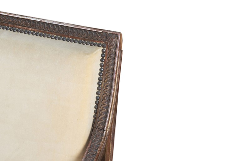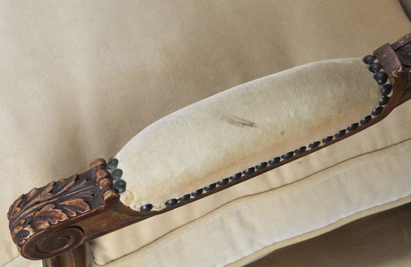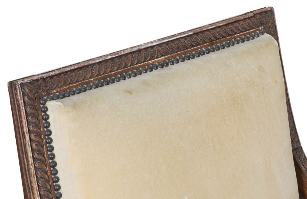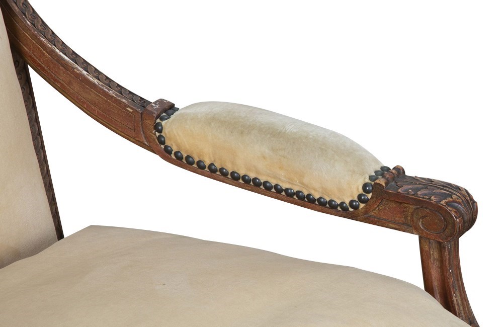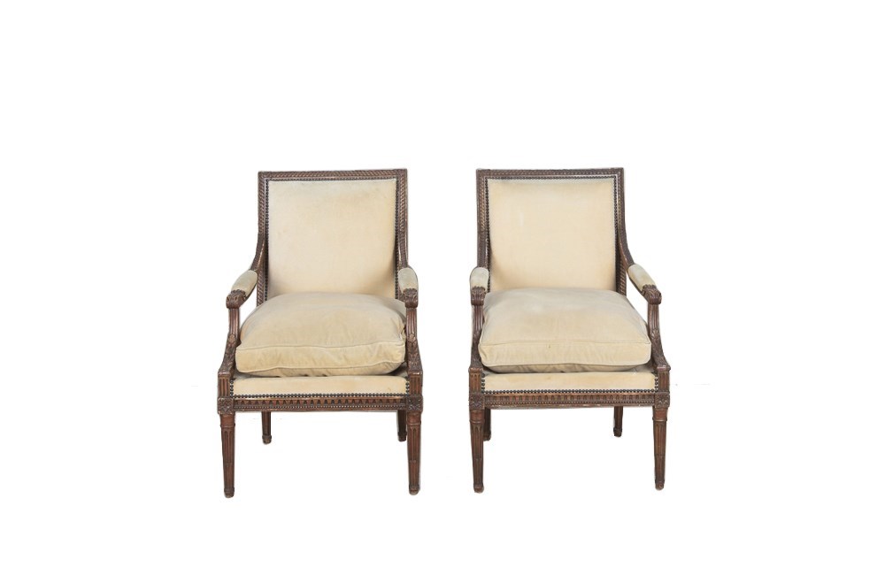 These elegant 'Fauteuils a la Reine' with their upright square backs bear beautiful carved scrolling to the back frame and arms. The apron features reeded carving and beading. Reeded legs with rosettes to the top. They are upholstered in creamy soft velvet with separate seat cushions.