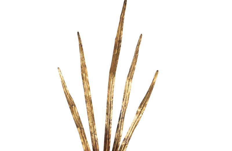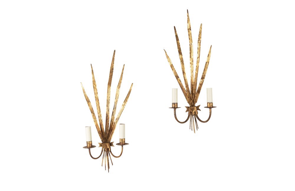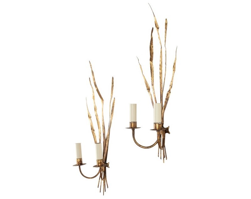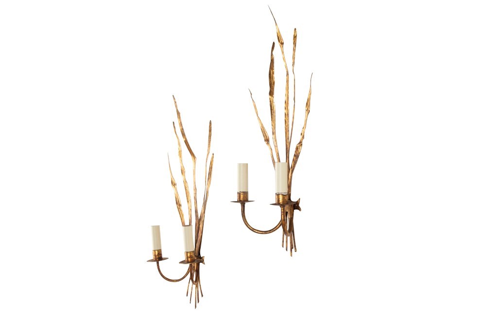 Pair of mid-20th Century Spanish gilt metal wall sconces or wall lights in the form of reeds.