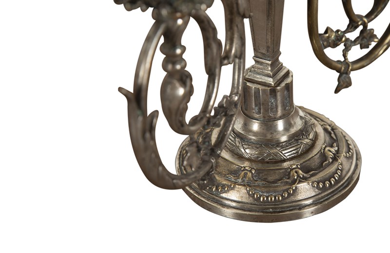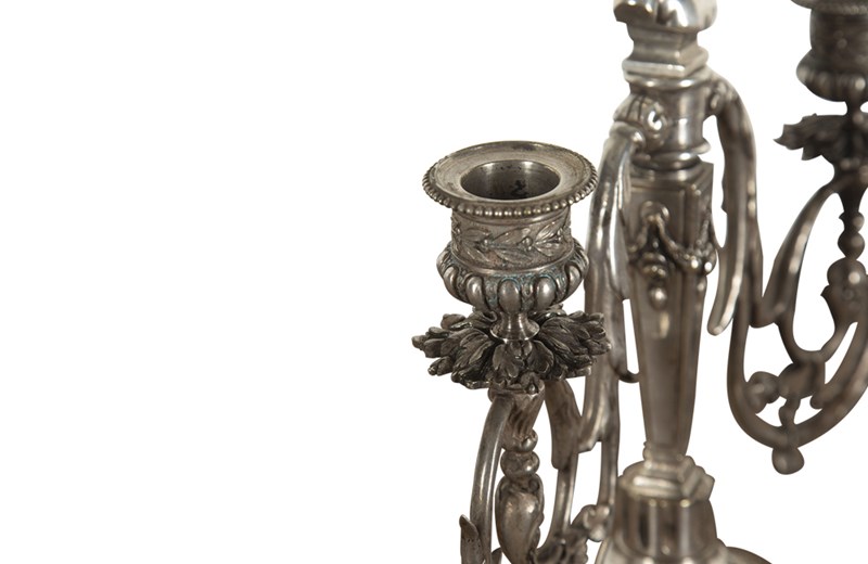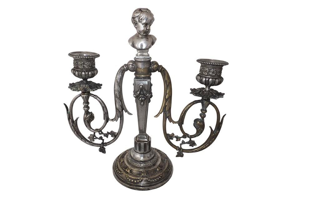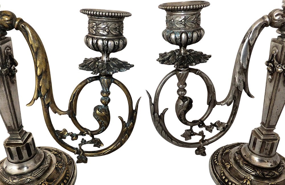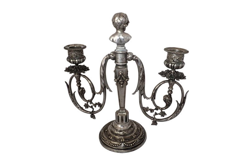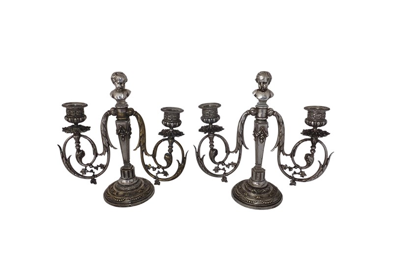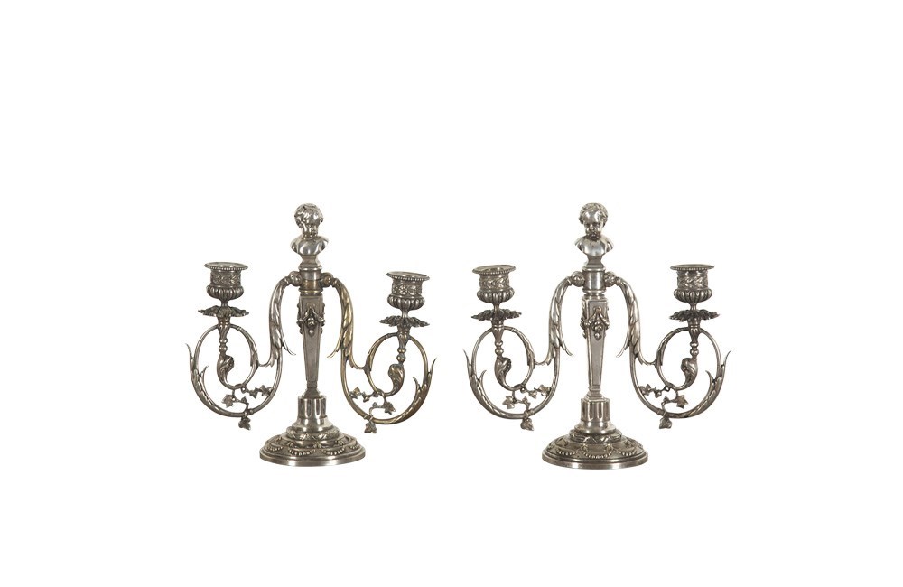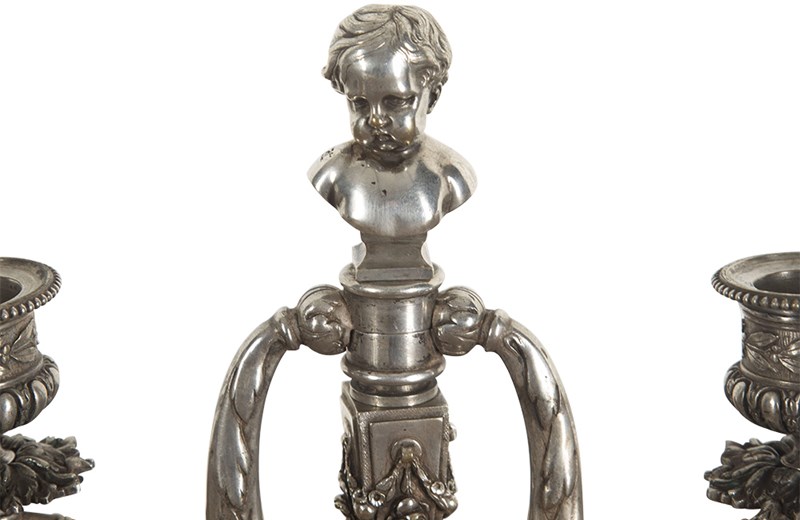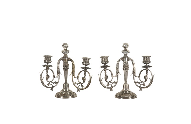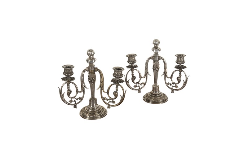 Beautiful pair of silverplated bronze candleabras in the Neo-Classique style with charming cherub head finials. 19th century.