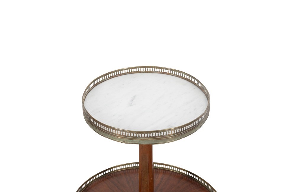 In the Louis XVI style, they each feature two graduated shelves, surrounded with pierced brass galleries, the upper one topped with white marble. The table is supported by a chamfered central column, over four tapering straight legs terminating in brass sabot feet.