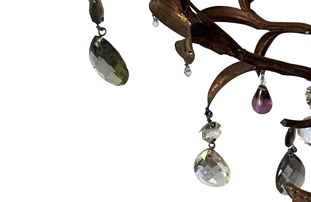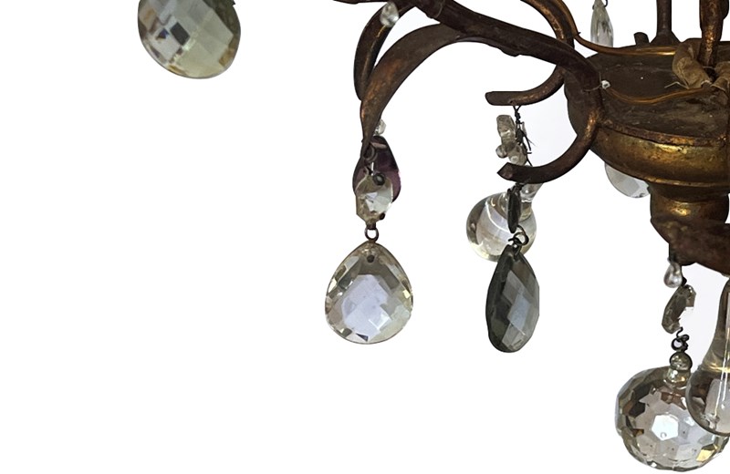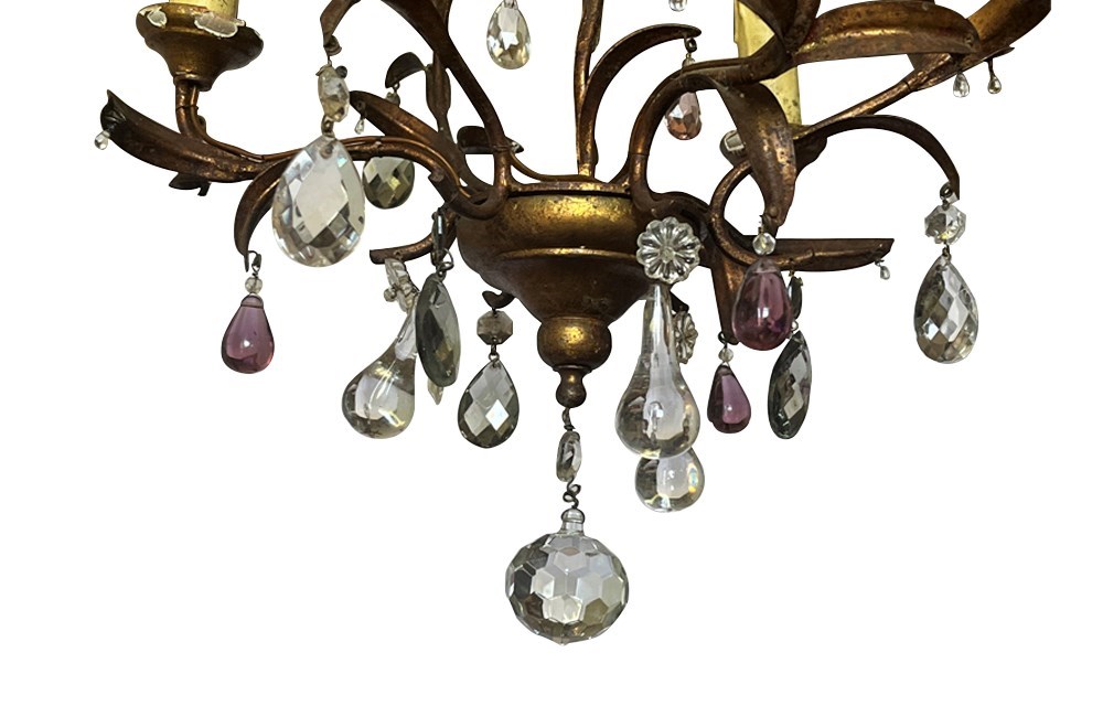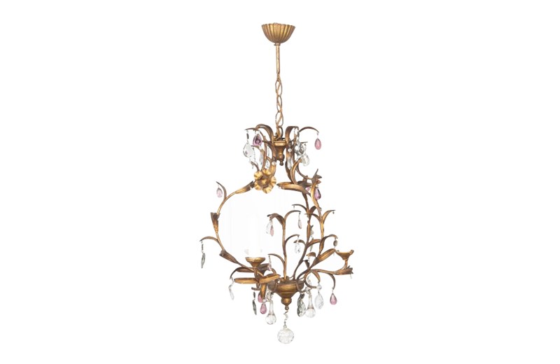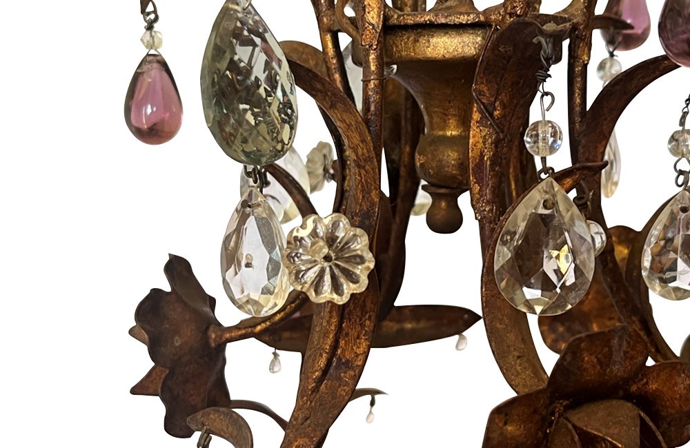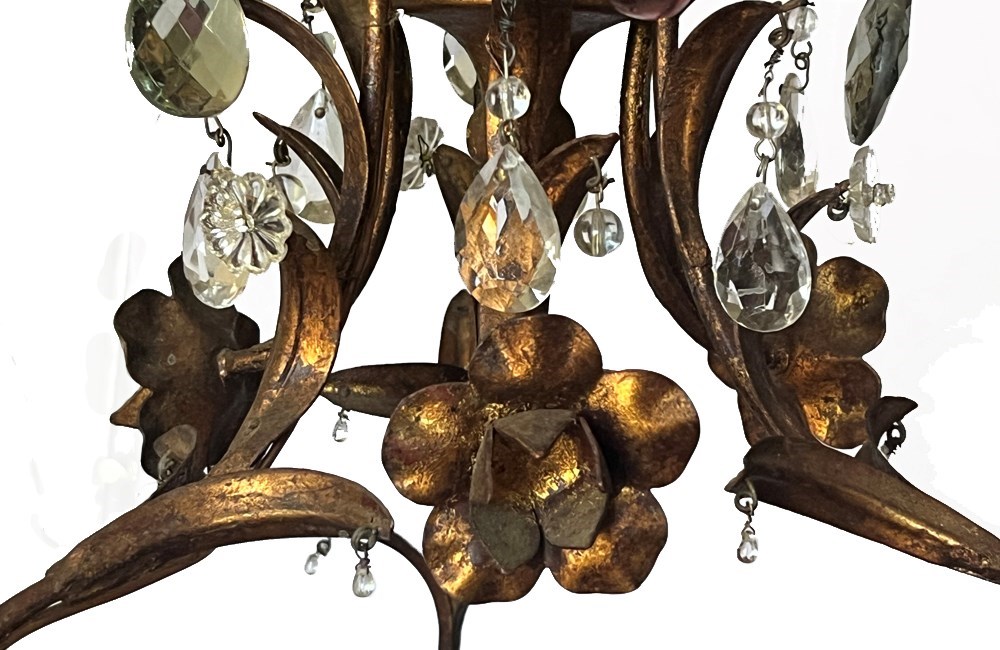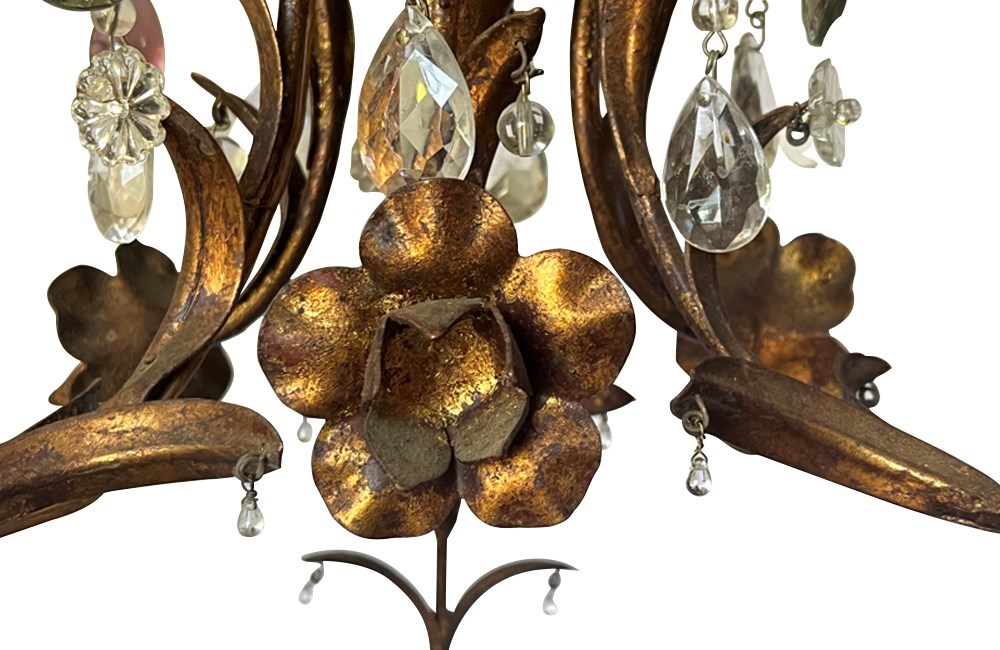 20th century pretty gilt metal and wood chandelier with floral and foliate decoration.