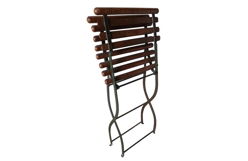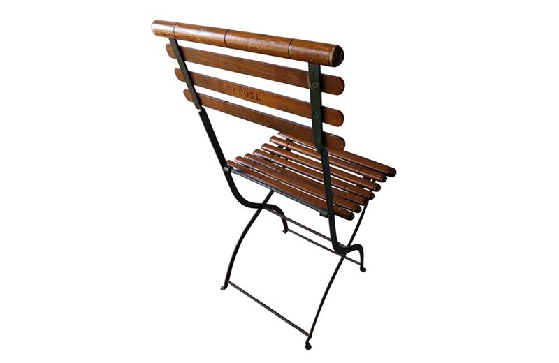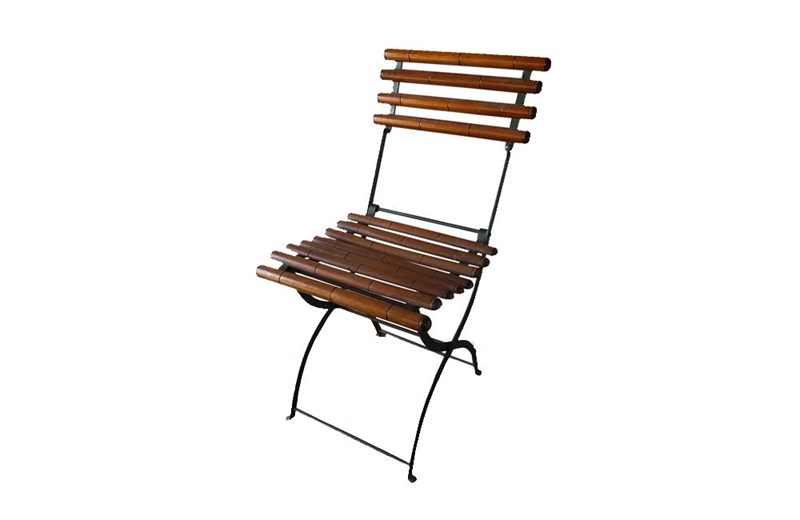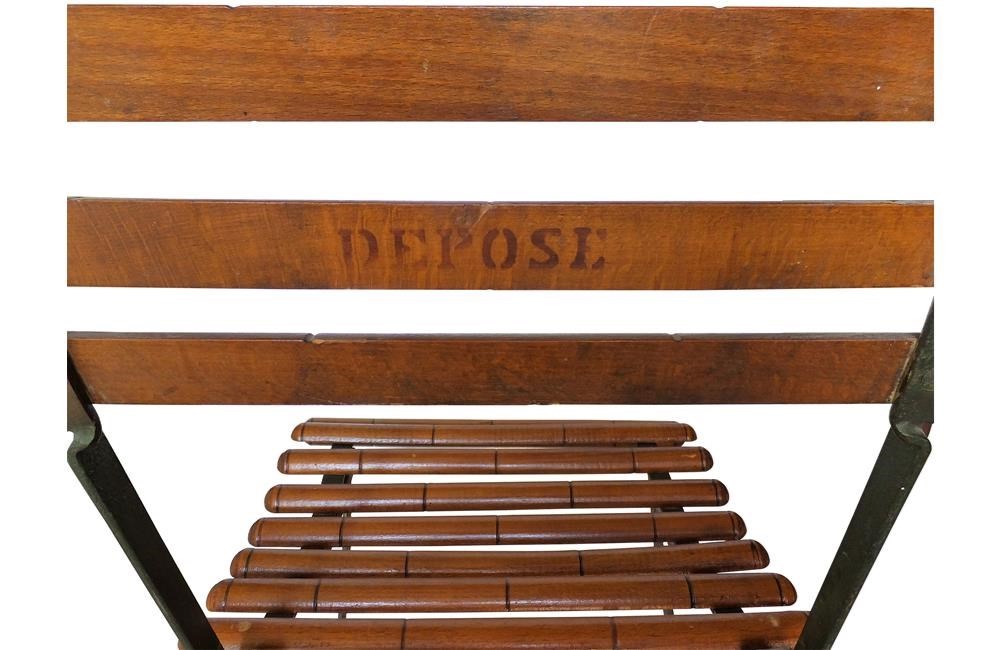 French folding iron and faux bamboo café chair. Stamped Deposée.