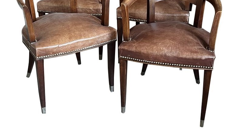 The tapered front and curved back legs terminate on metal sabots, typical of the Ruhlmann style. They are beautifully made and offer great comfort and back support. Seats with later leather upholstery.