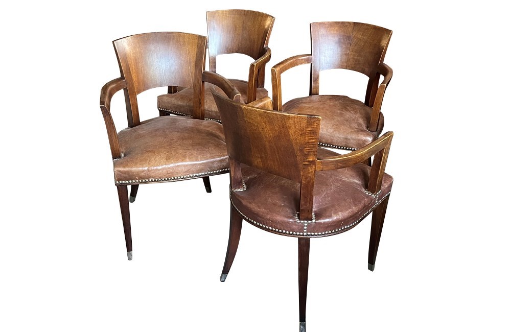 Set of four 20th Century French Art Deco walnut bridge style armchairs in the manner of Ruhlmann. Circa 1930