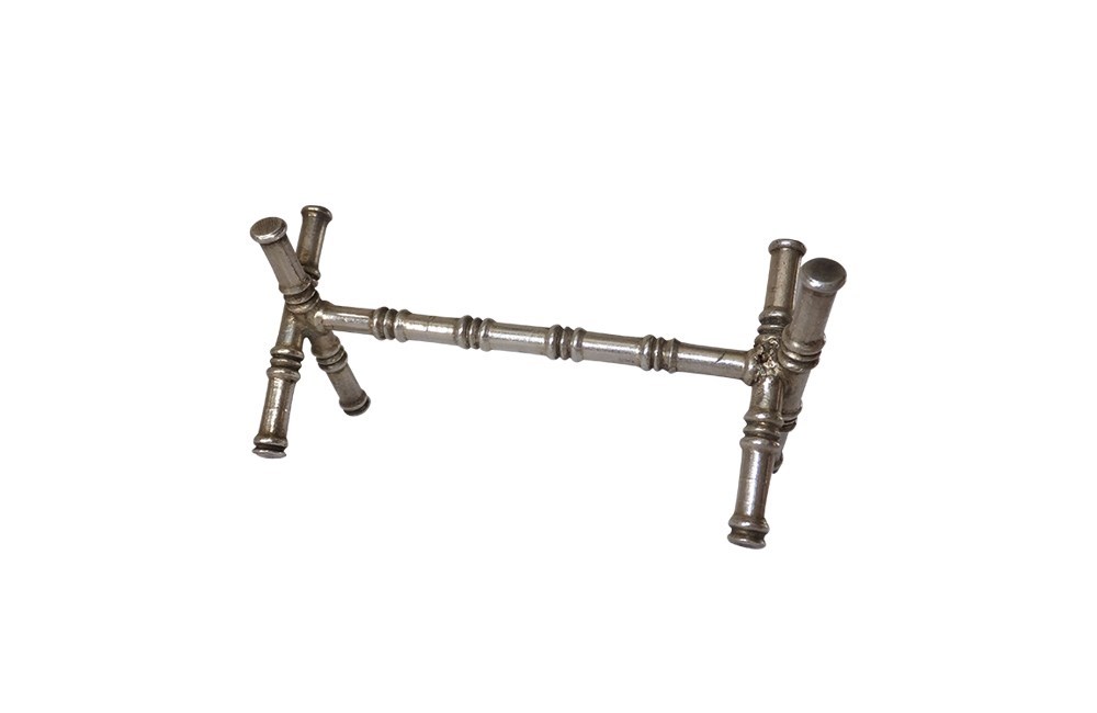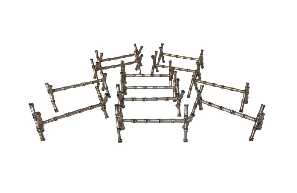 A stylish set of French twelve silver plate knife rests in the form of crossed bamboo stems.