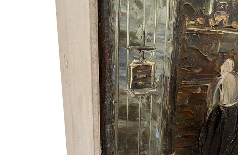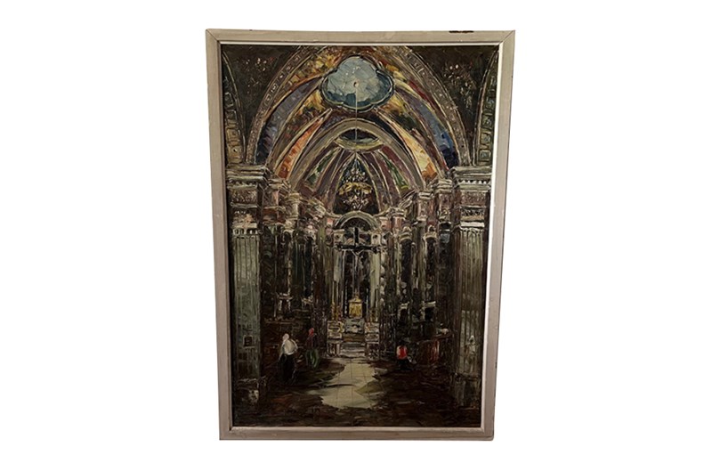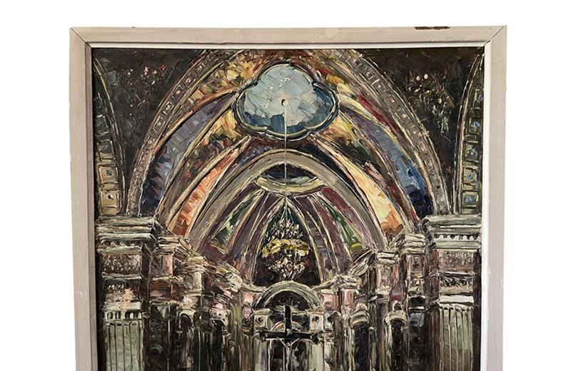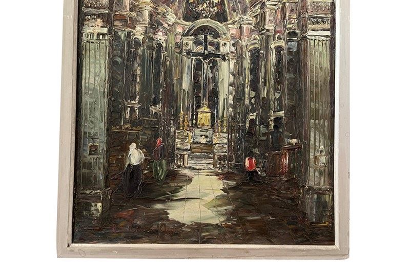French 20th Century oil on canvas of the interior of a church signed by the artist André Salomon , known as Le Tropézien. Wonderful rendition of the stained glass and evocative atmosphere of the interior with church goers.