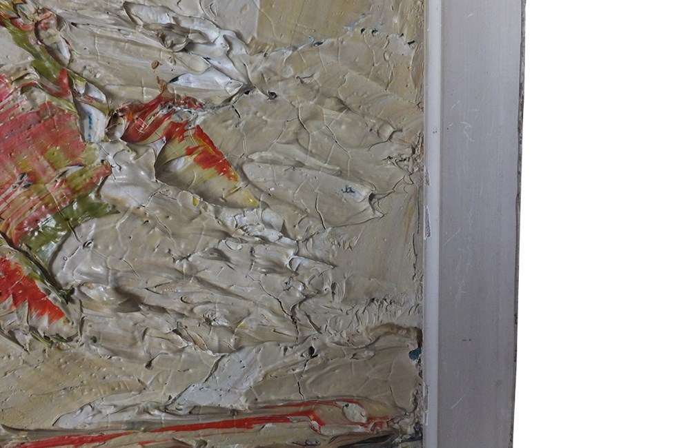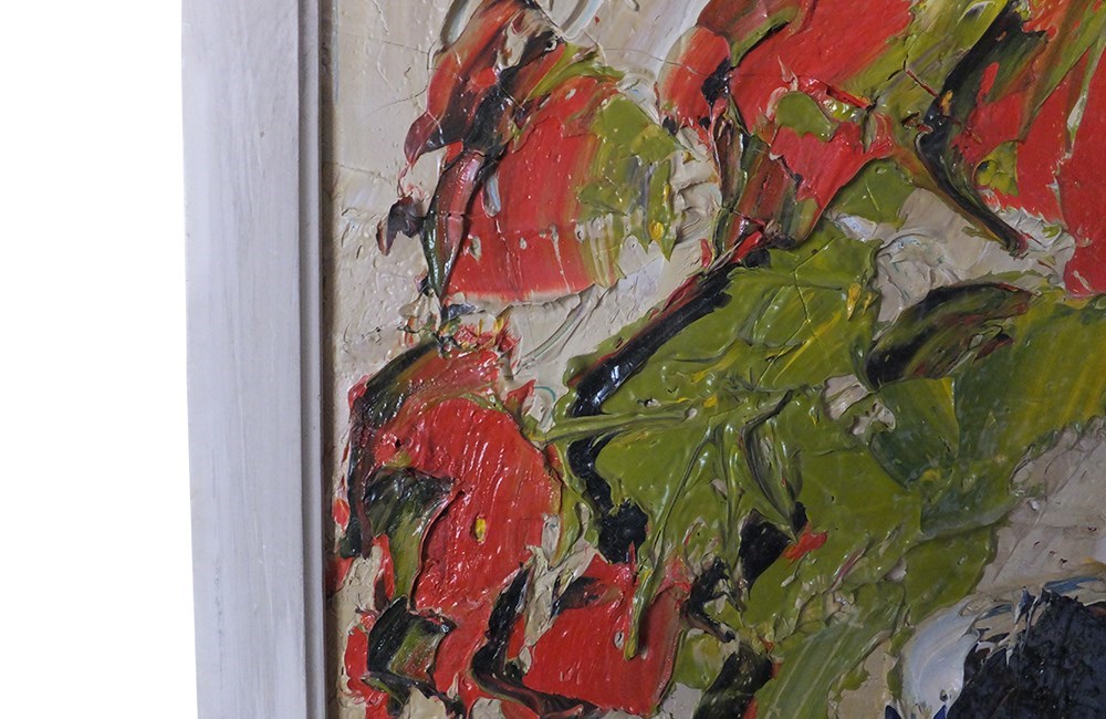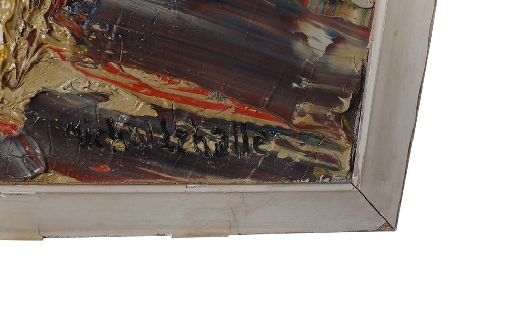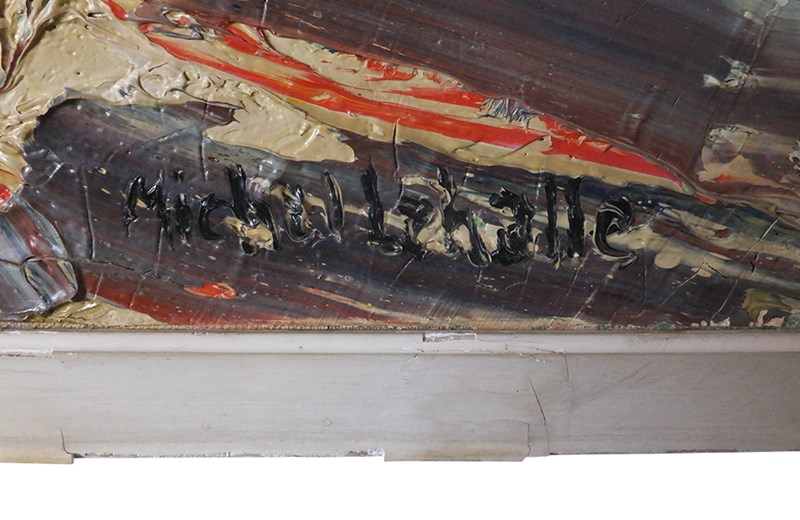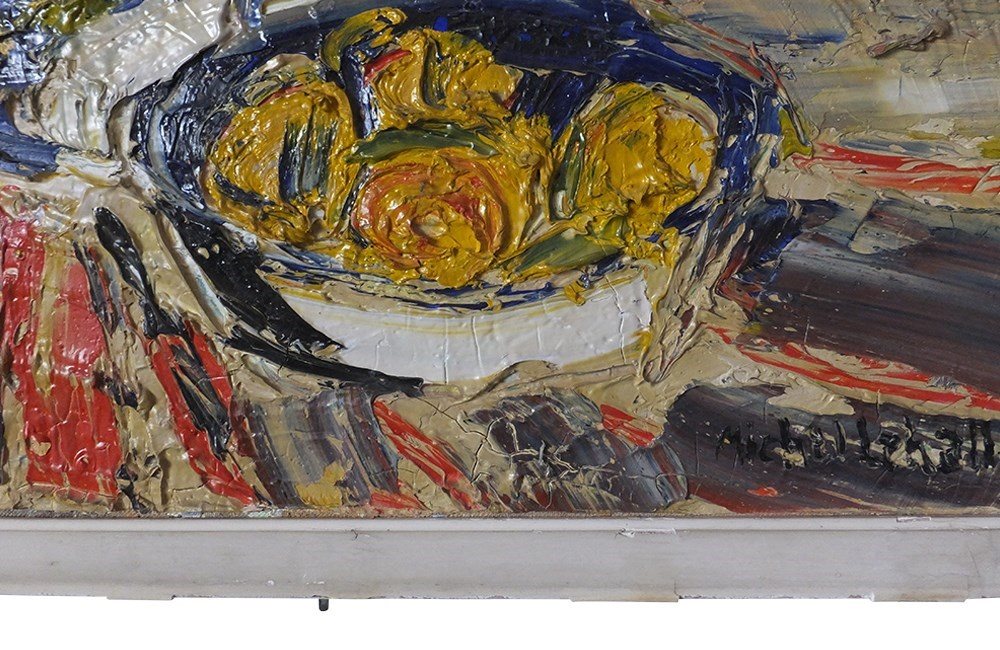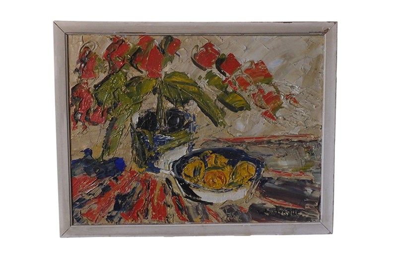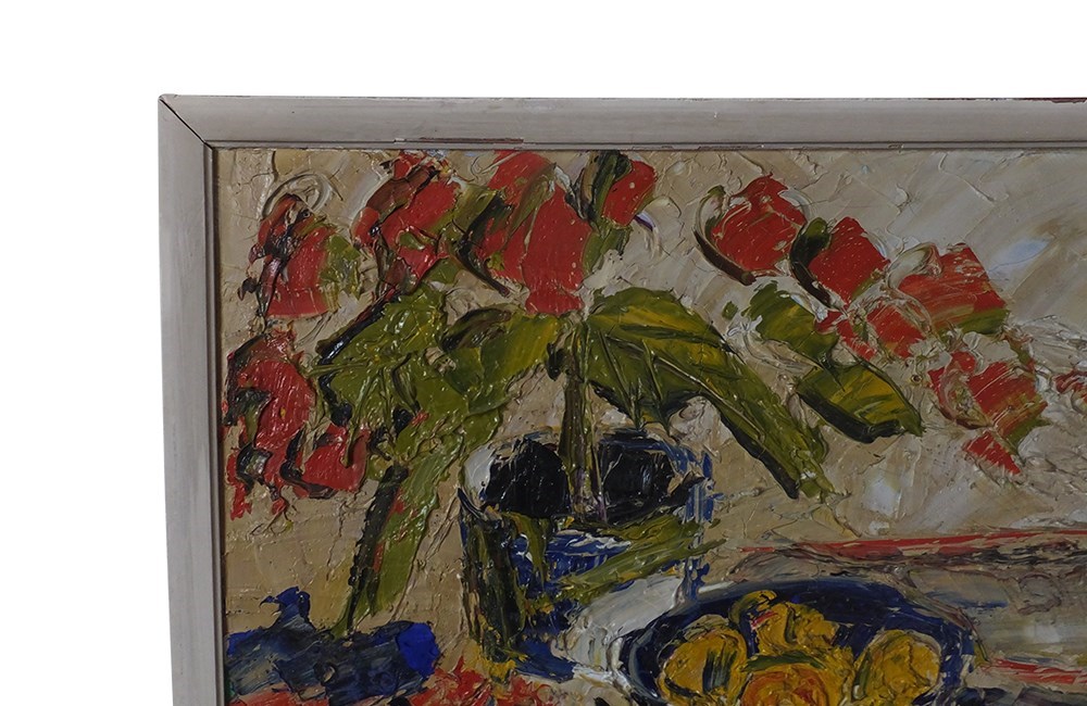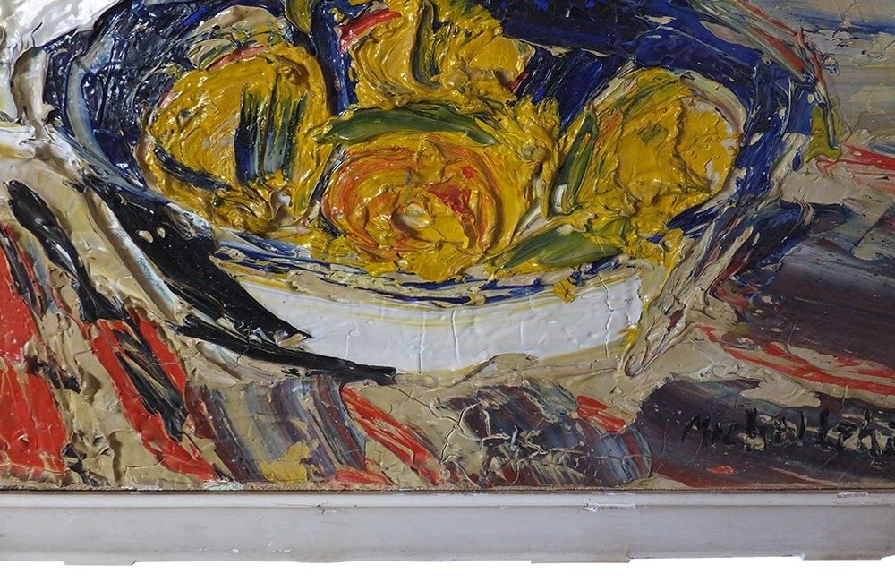 Vibrant still life painting by the French artist, Michel Lehalle. This colourful painting of a tropical potted plant and a bowl of lemons is full of energy and expression with thickly applied oil on canvas. Signed to lower right.