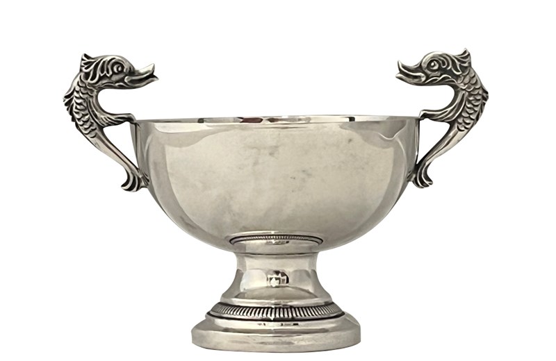 Decorative silver plate bowl with dolphin handles on raised foot. Stamped with makers mark B.R.