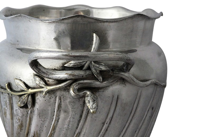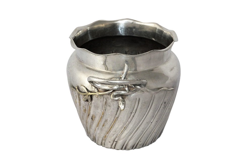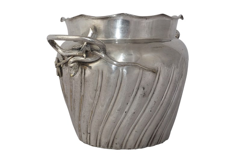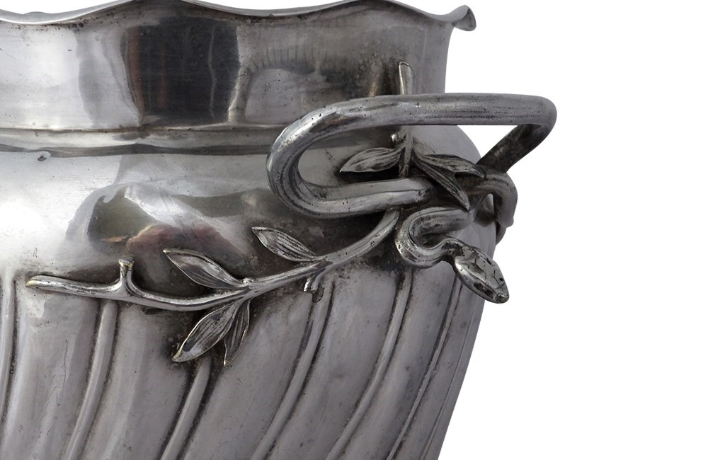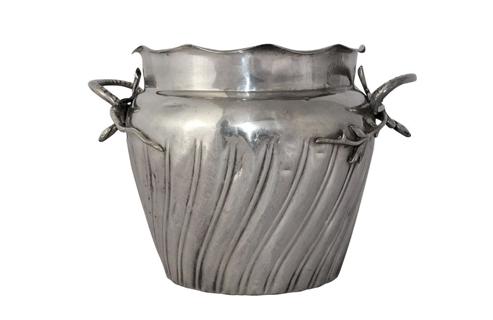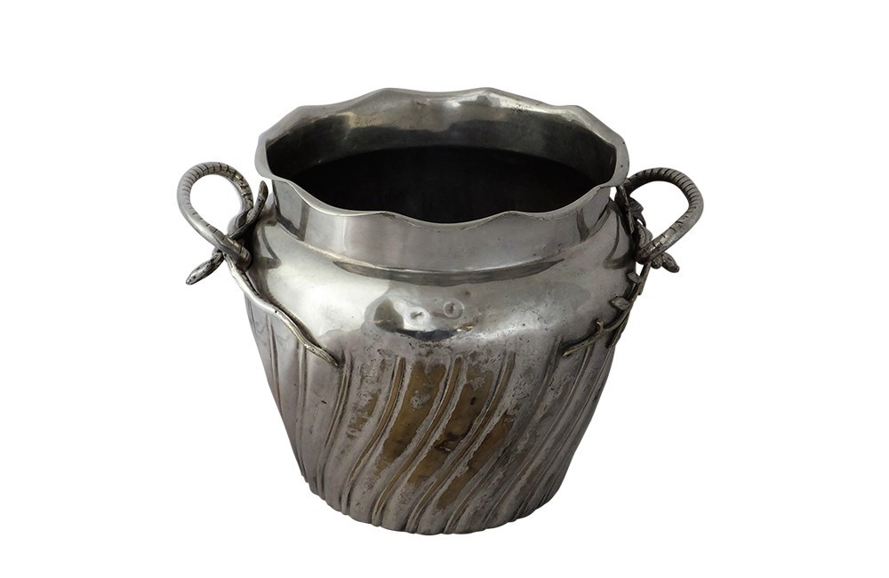 Beautifully worn, silver plate wine cooler or cachepot with serpent entwined in branch handles.