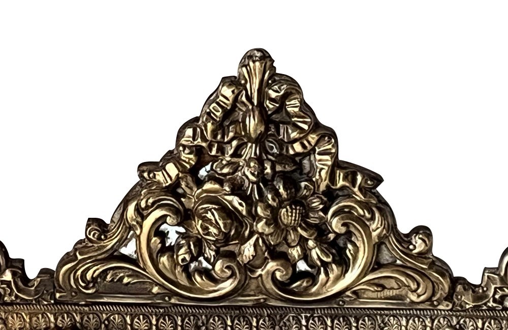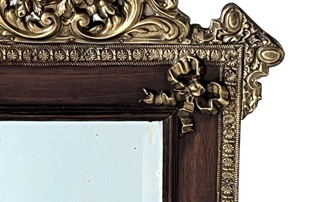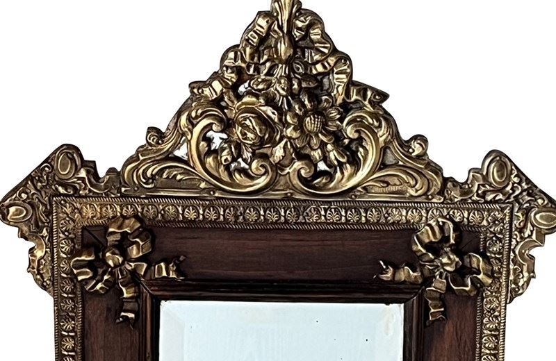 With brass and glass floral ornamented pediment. Highly decorative brass surround and bows to each corner and bevelled glass mirror