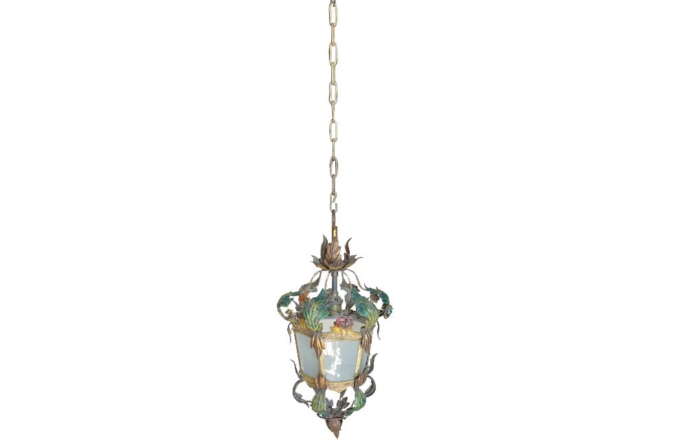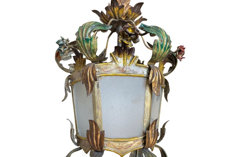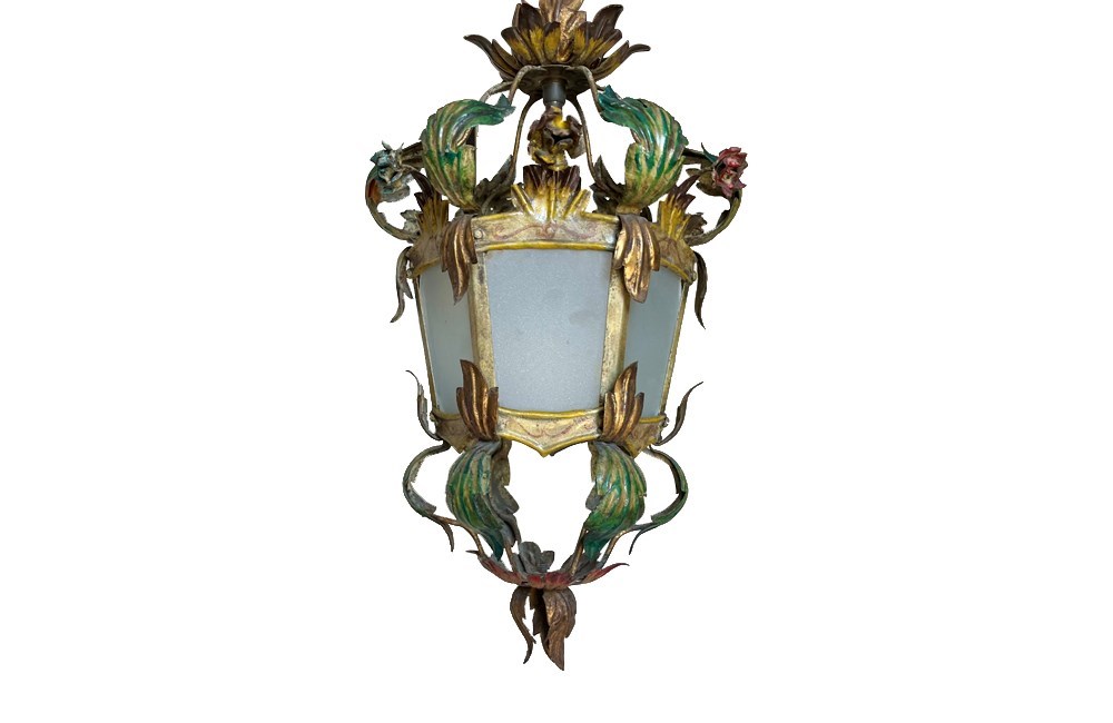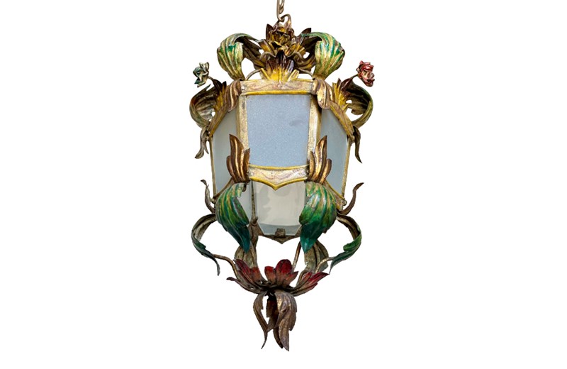 Pretty, polychrome hanging lantern with tole floral and foliate ornamentation and opaque glass panels.