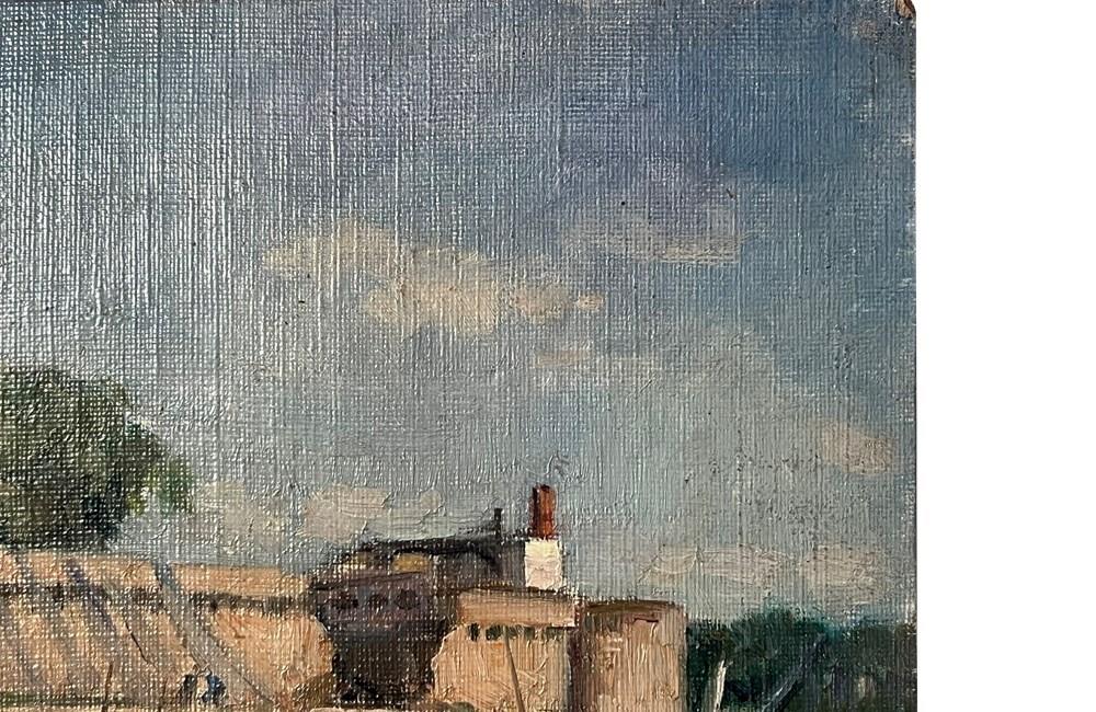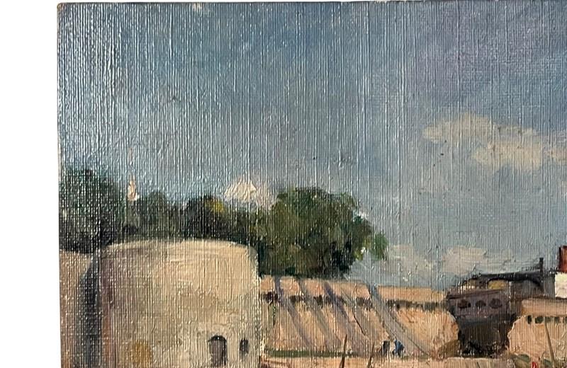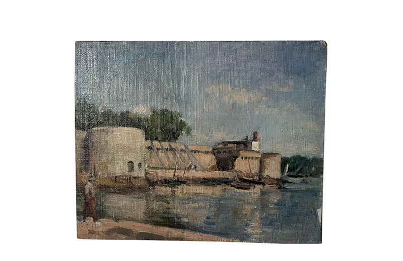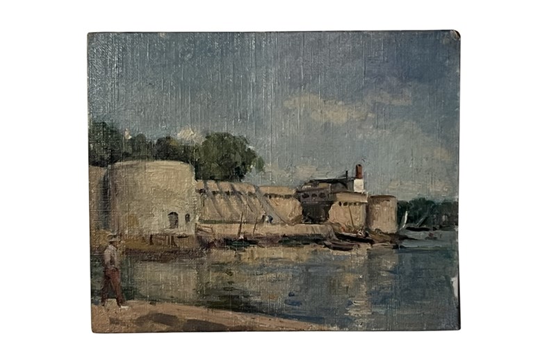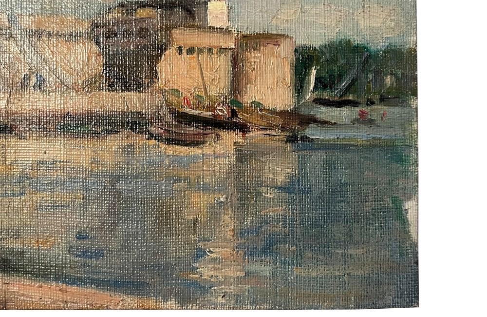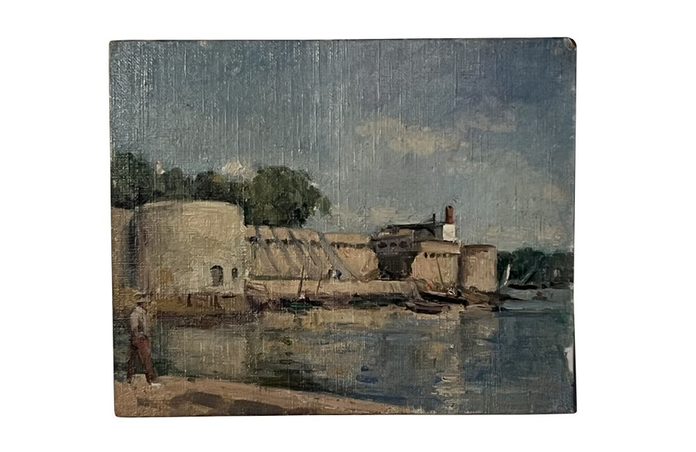20th century charming, small painting of a scene by the port of Concarneau, Finistere, Brittany.