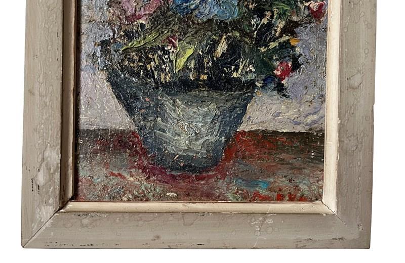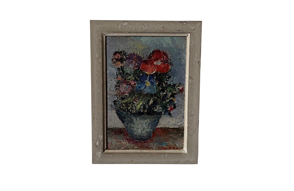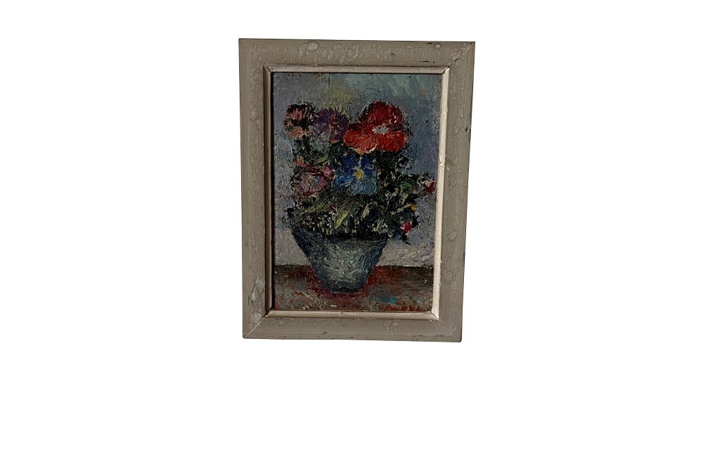 Charming little still life oil on wood painting of flowering anemones in a blue pot.