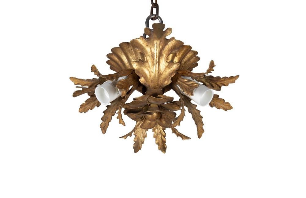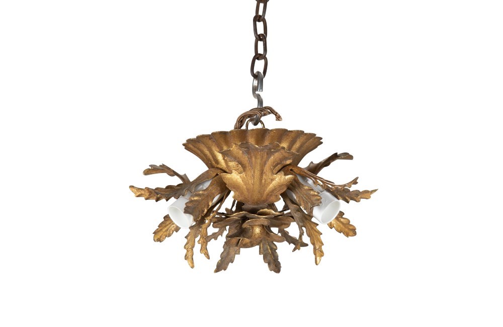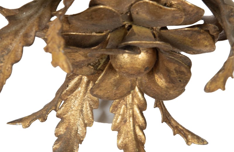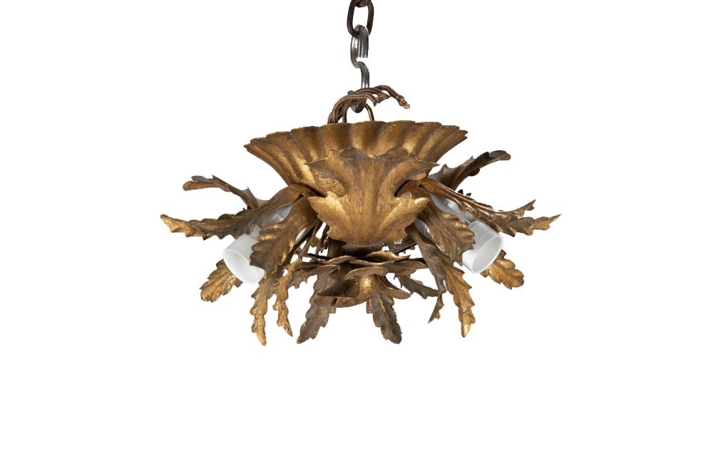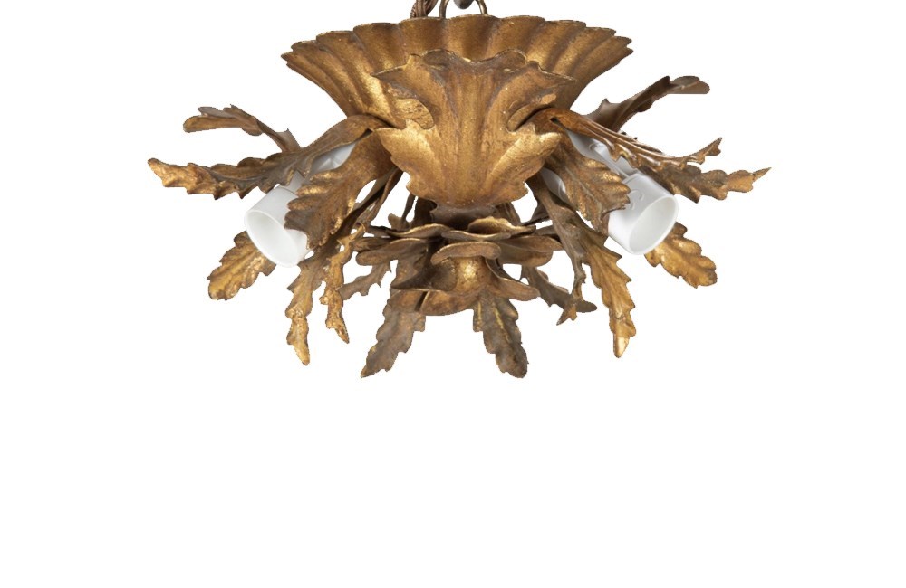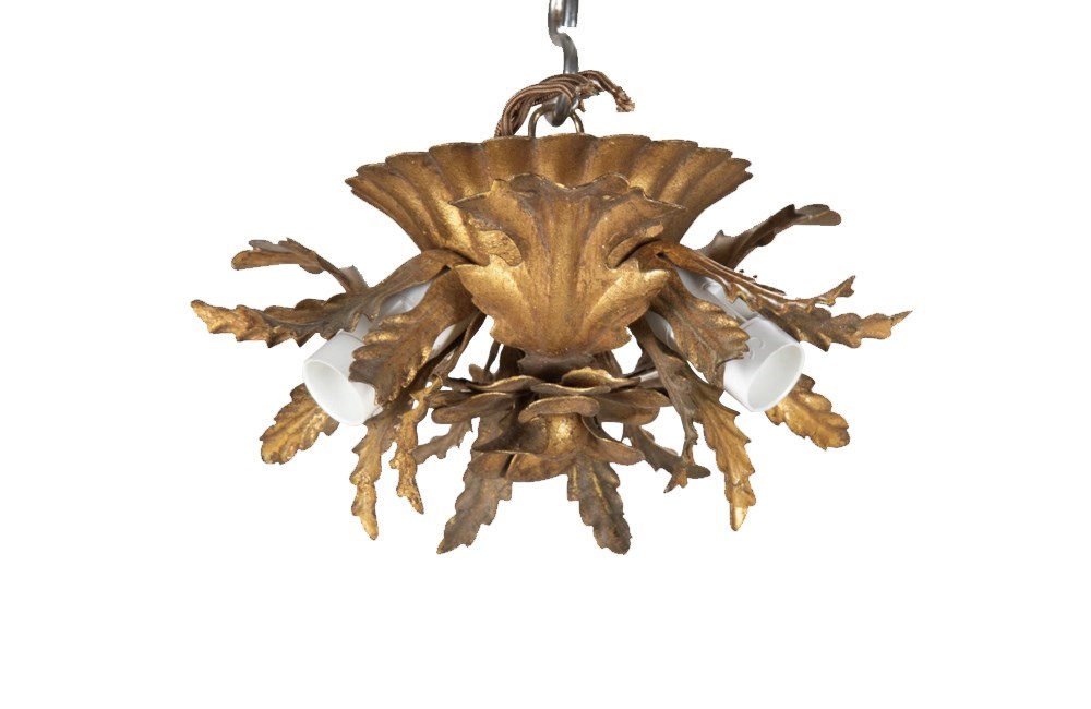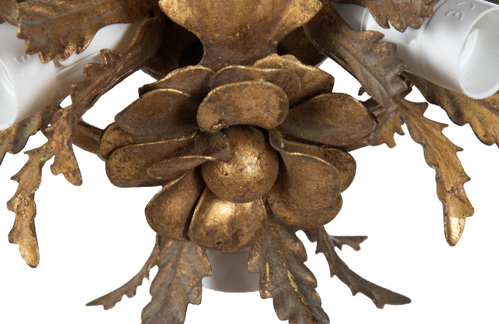 Small Mid-Century Italian gilt-metal ceiling light with central flower, three leaves and three foliate bulb holders.