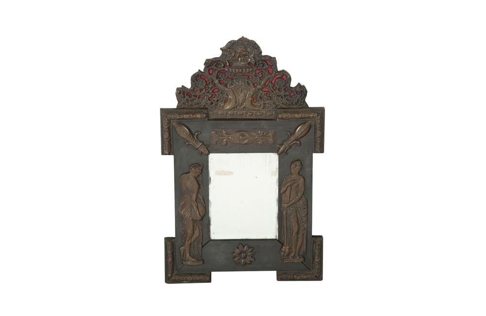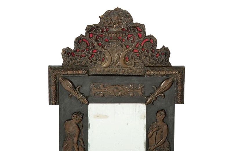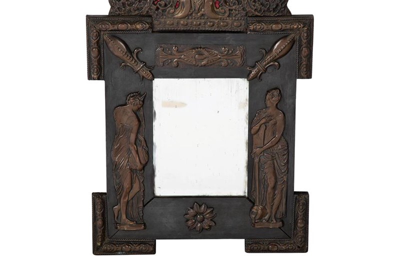 19th century, French, repousse copper on ebonised baltic pine framed mirror. Decorated with two nymph figures and classical motifs.