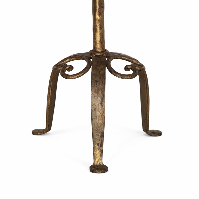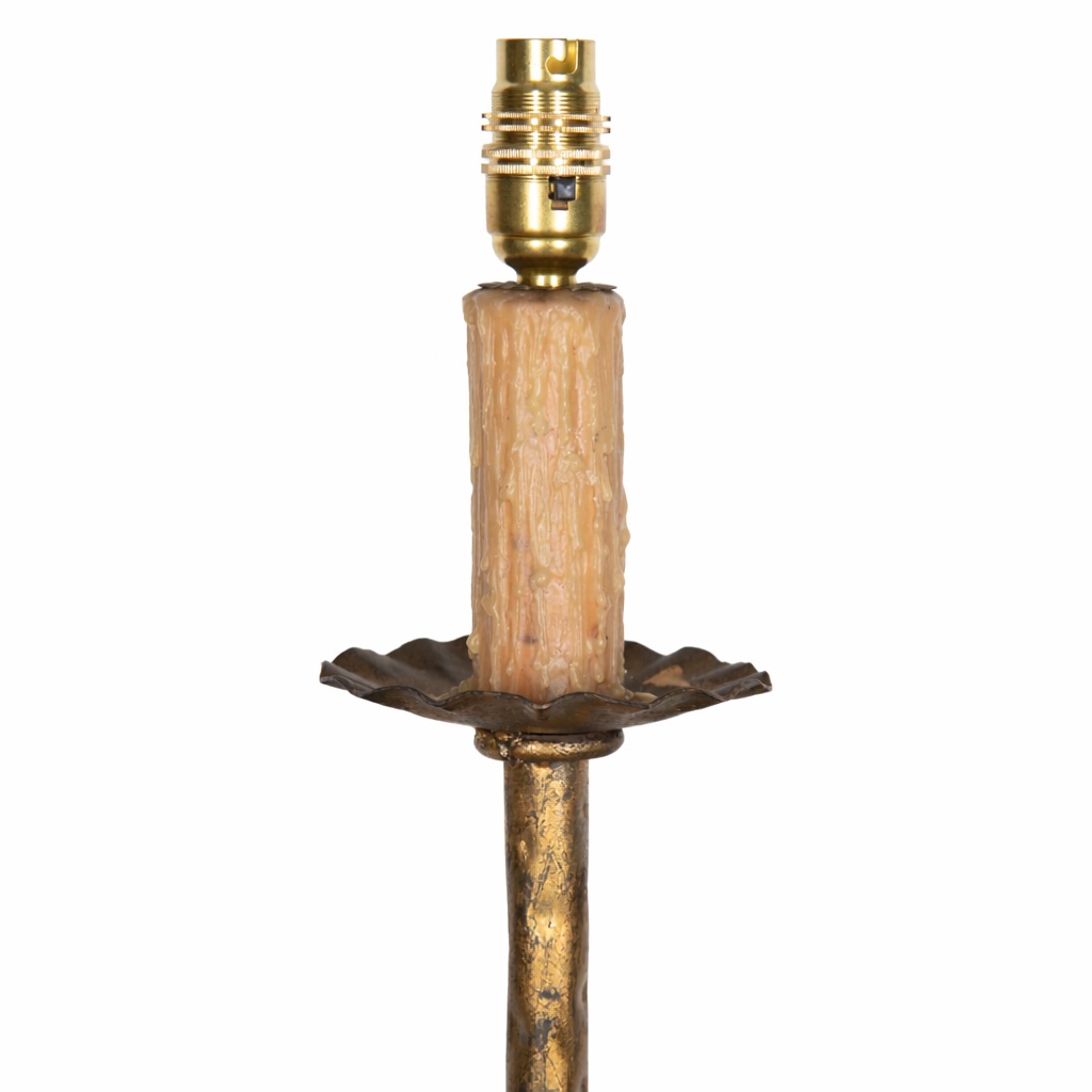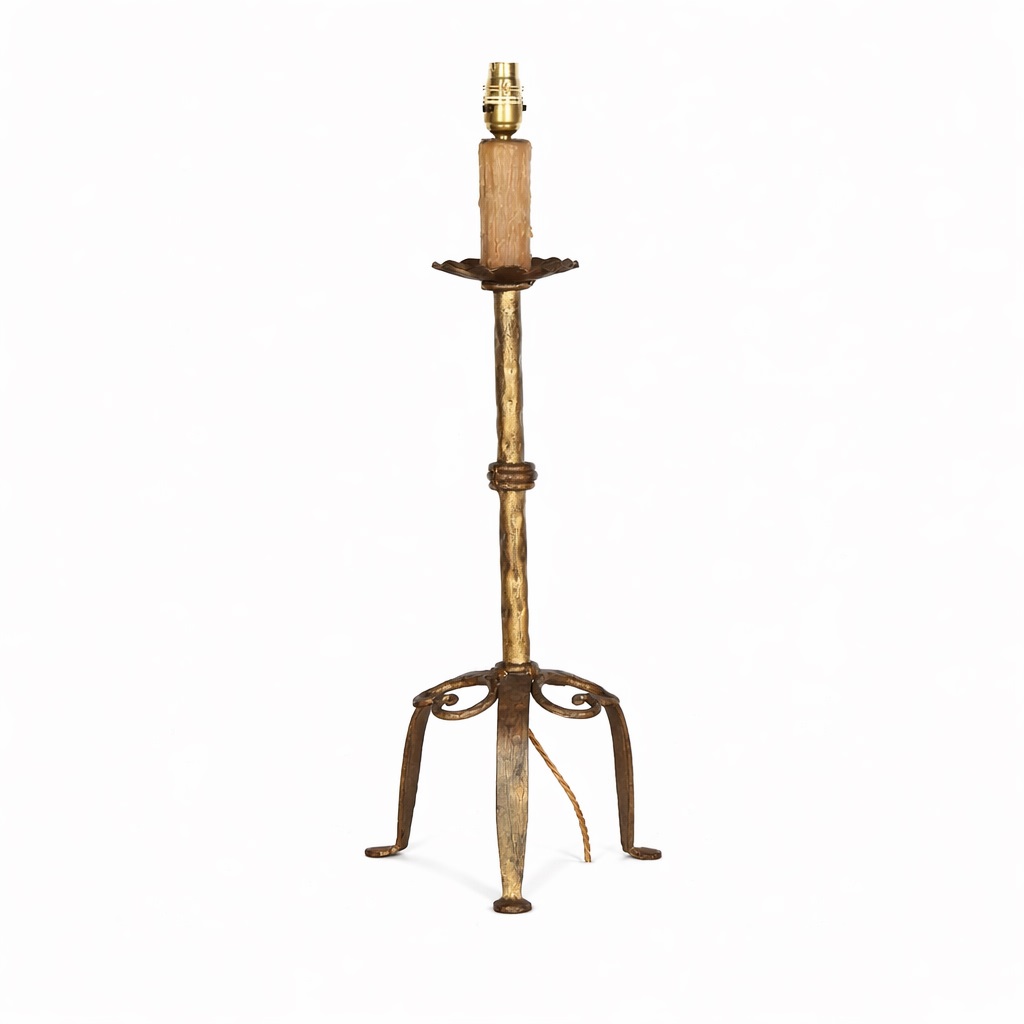 Mid Century Spanish gilt iron table lamp with fluted cup, hammered ringed stem terminating on tripod base with scrolled iron work. Atop sits a wax & wood faux candle fitting holder.