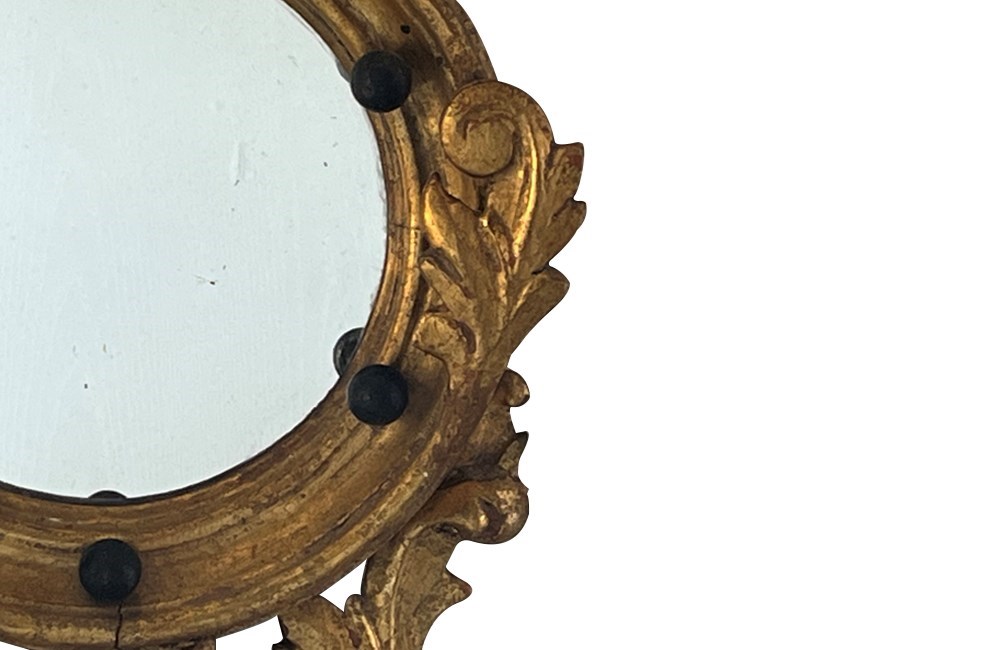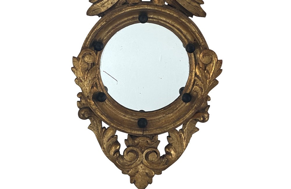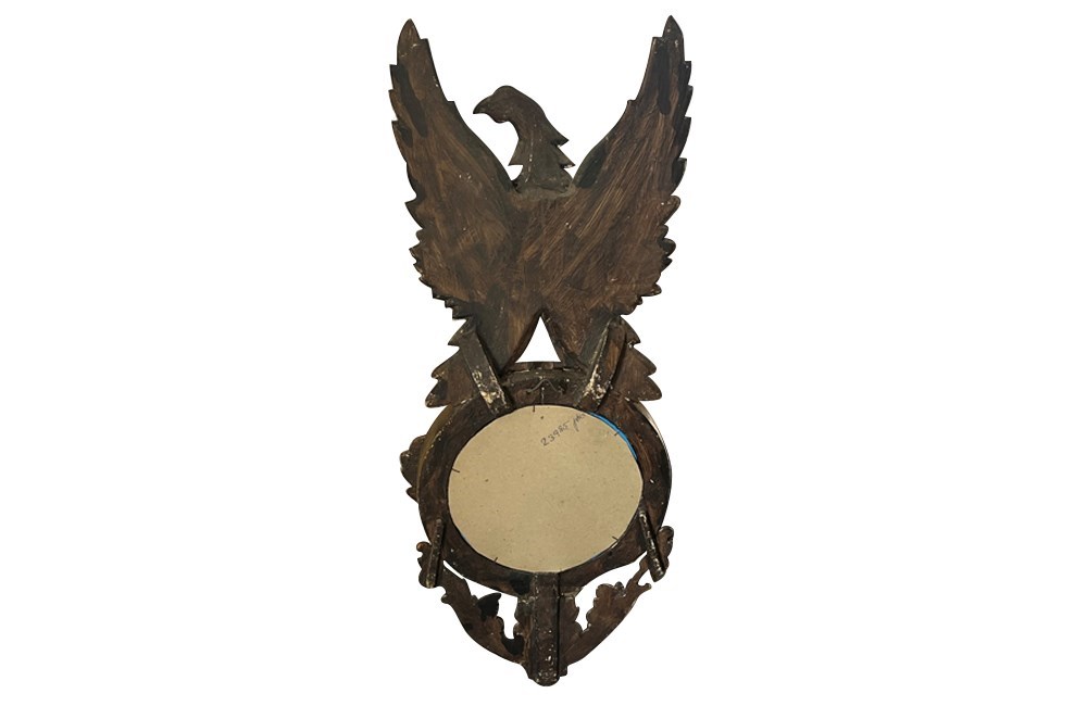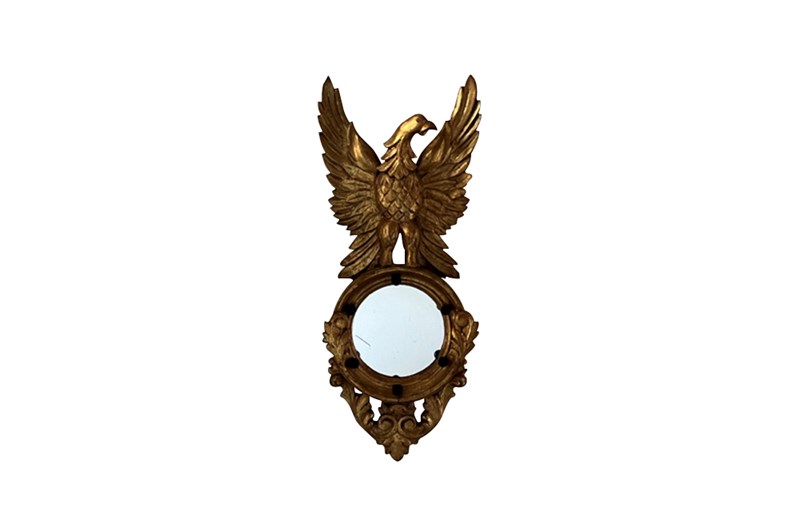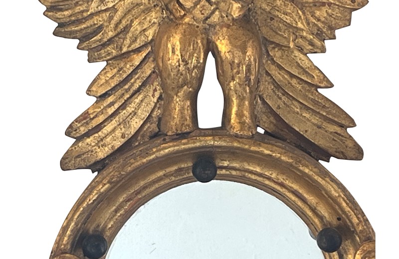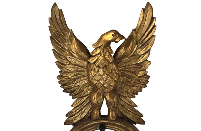 Decorative large carved gilt wooden open winged eagle framed mirror in the Regency style.
