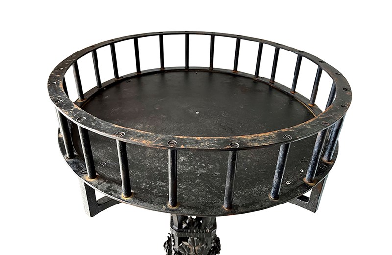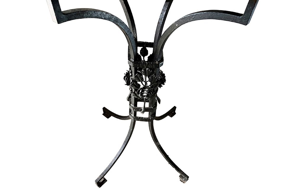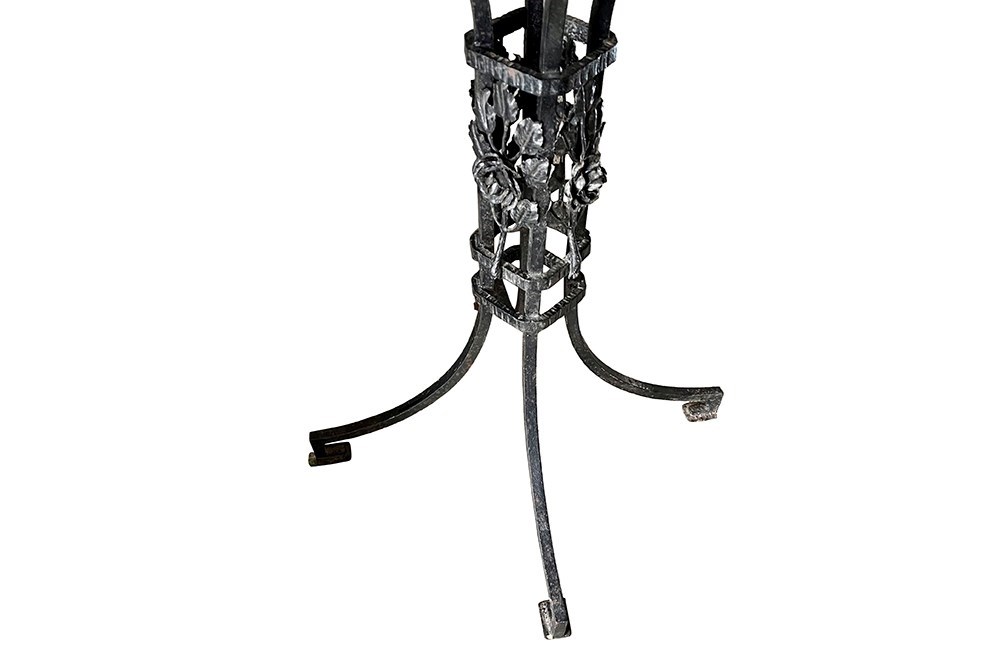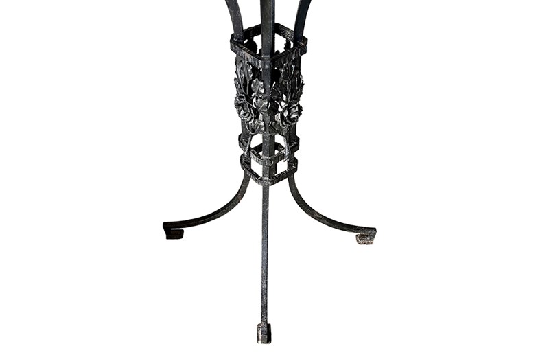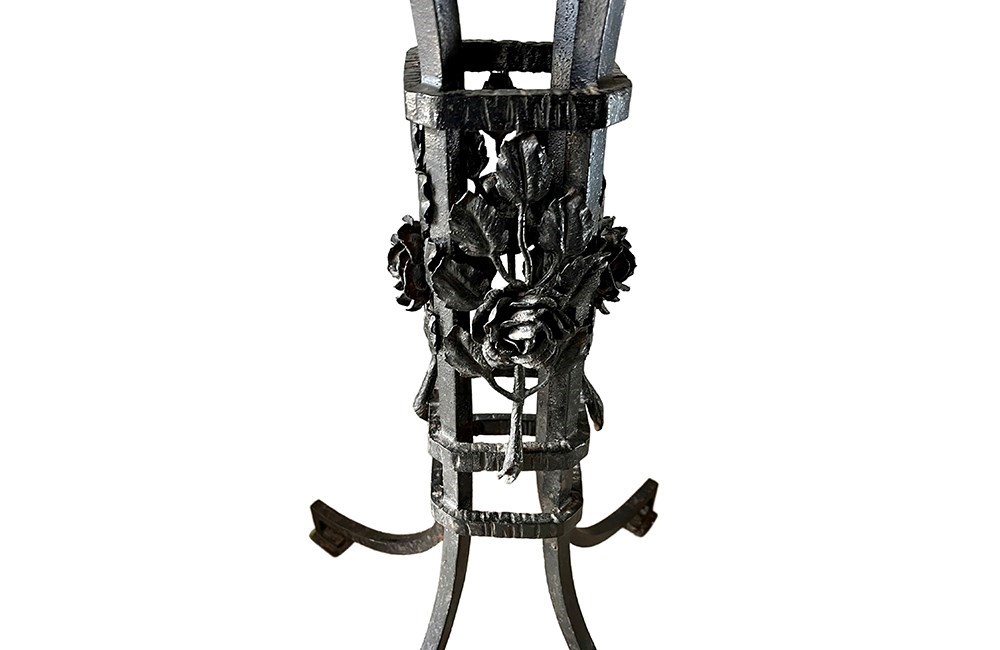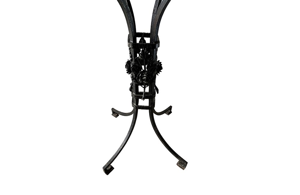 Tall black iron Art Deco plant stand in the manner of Edgar Brandt. Rose ornamentation to all sides of support. Circa 1930