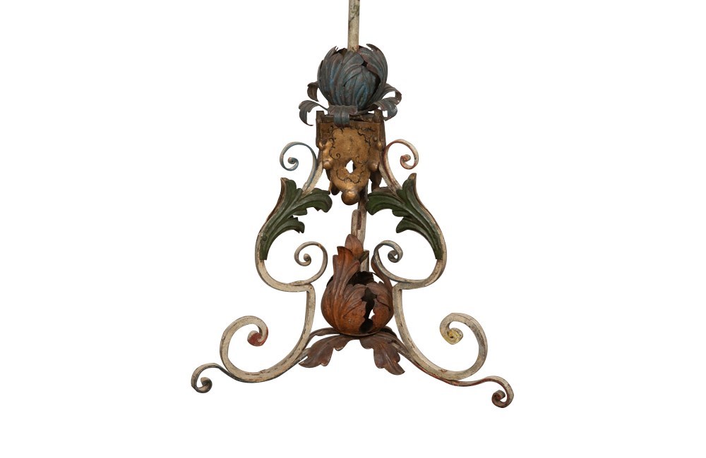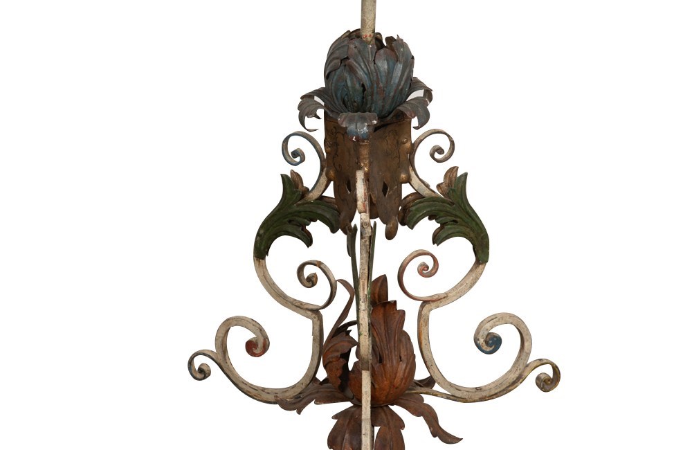 Fabulous Italian polychrome iron standard lamp. This unique and decorative piece was originally a tall candle holder that was later converted to a floor lamp in the 20th century .