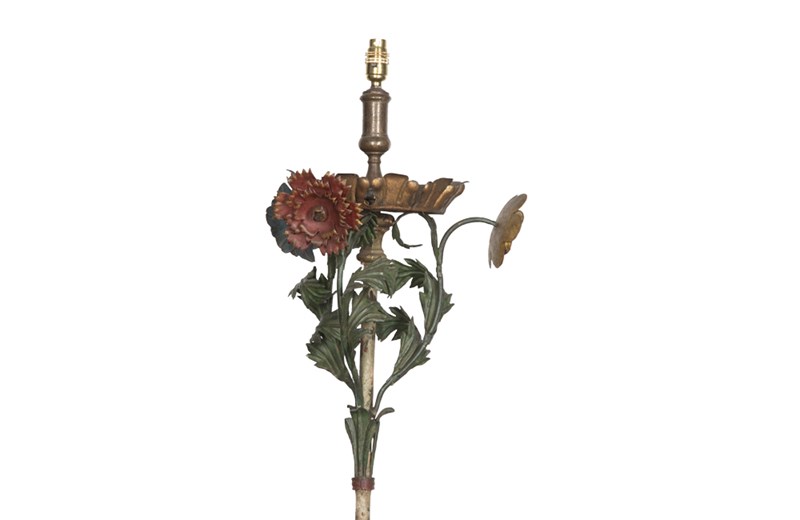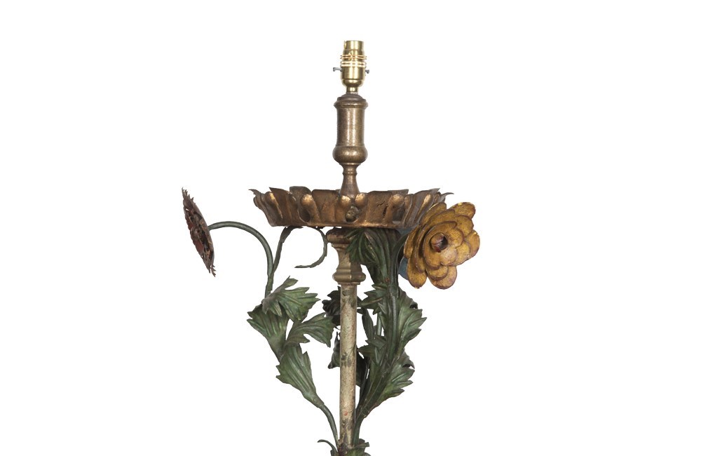Featuring 3 stylised flowers and foliage to the top and the stem has pretty painted floral and foliate decoration, it has a brass bulb/candle holder sitting in a gilt metal cup and central brass ornamentation. The stem leads down to a gilt metal surround and terminates on a beautifully scrolled foot with further foliate tole flourishes.