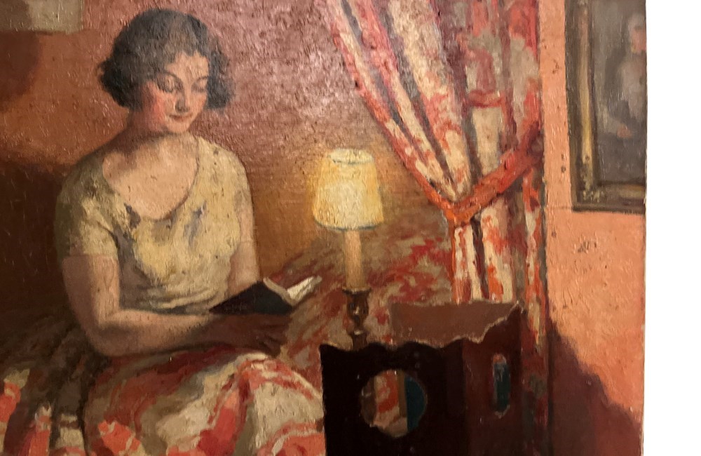 Beautiful, oil on canvas portrait of a woman reading. In a full skirt, she sits, book in hand, serenely reading on a canopied bed.