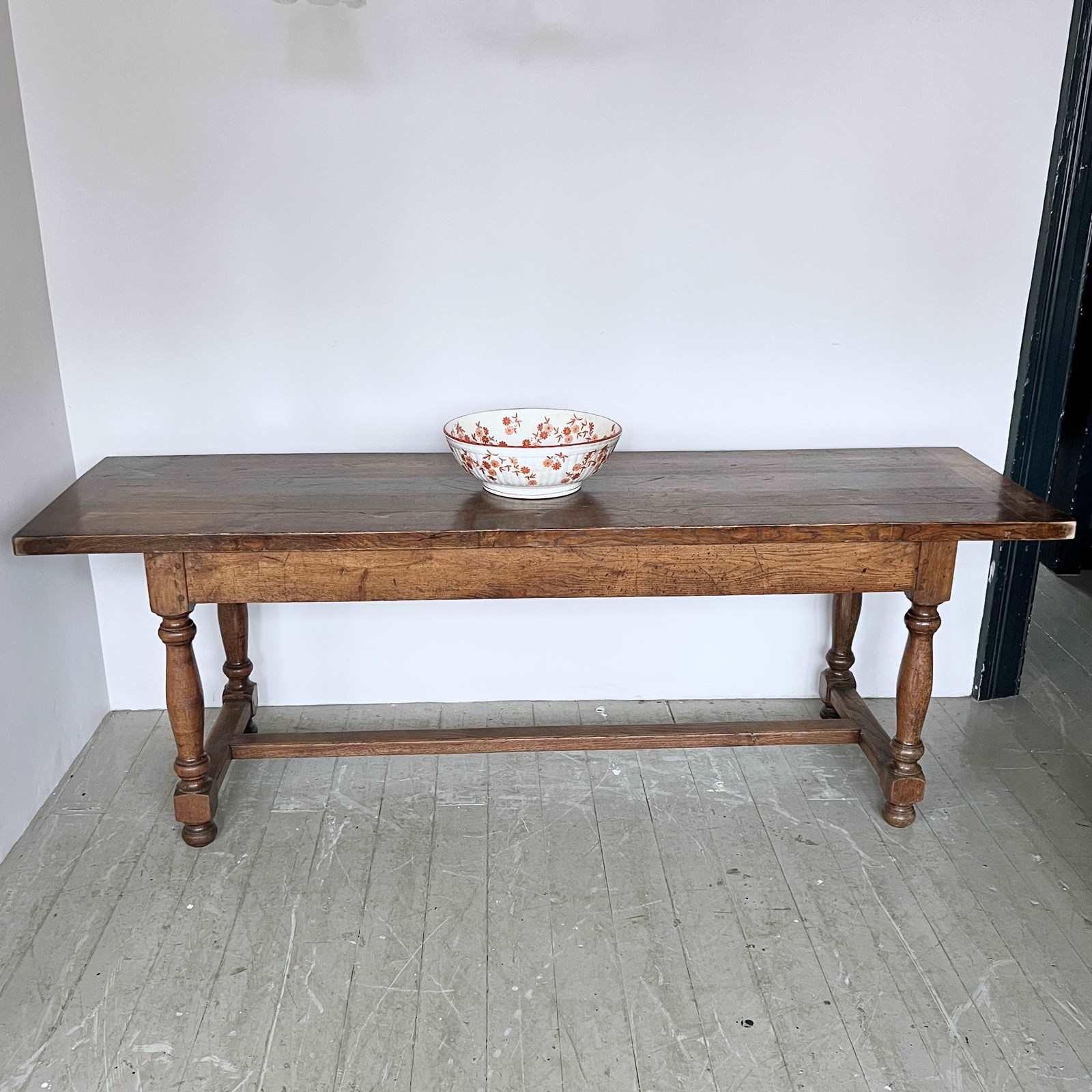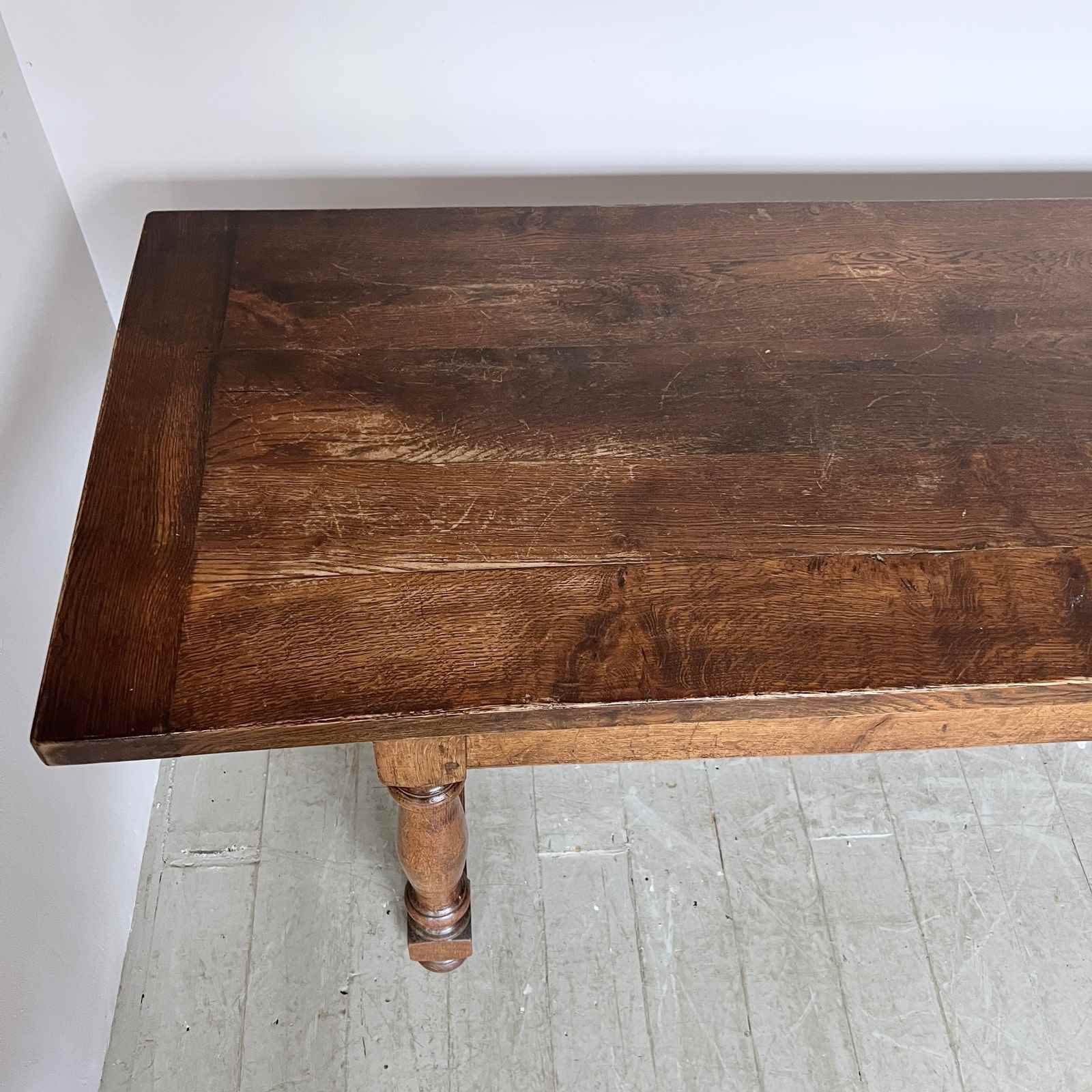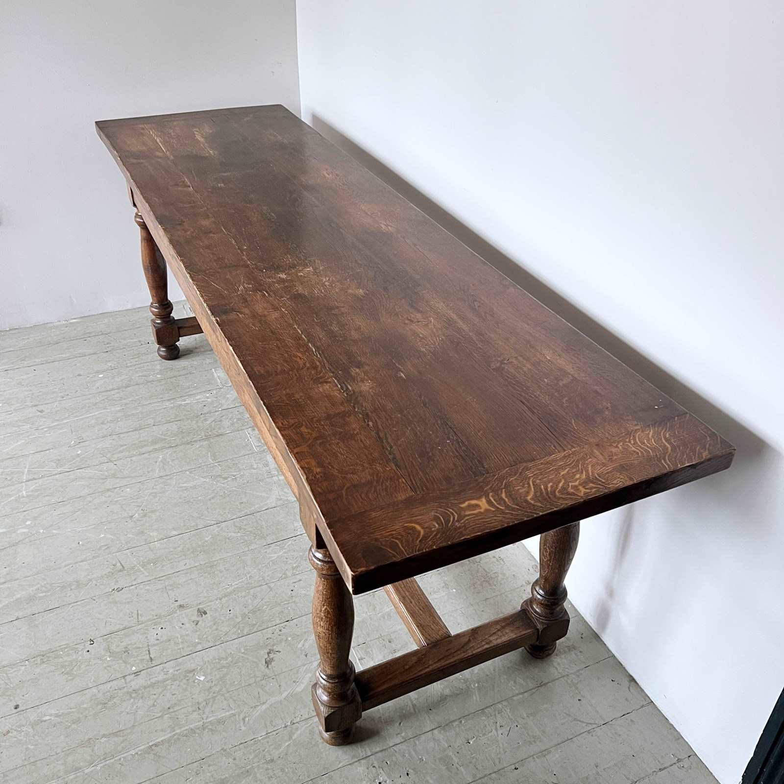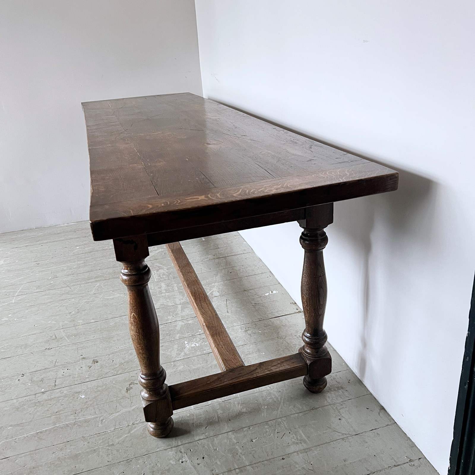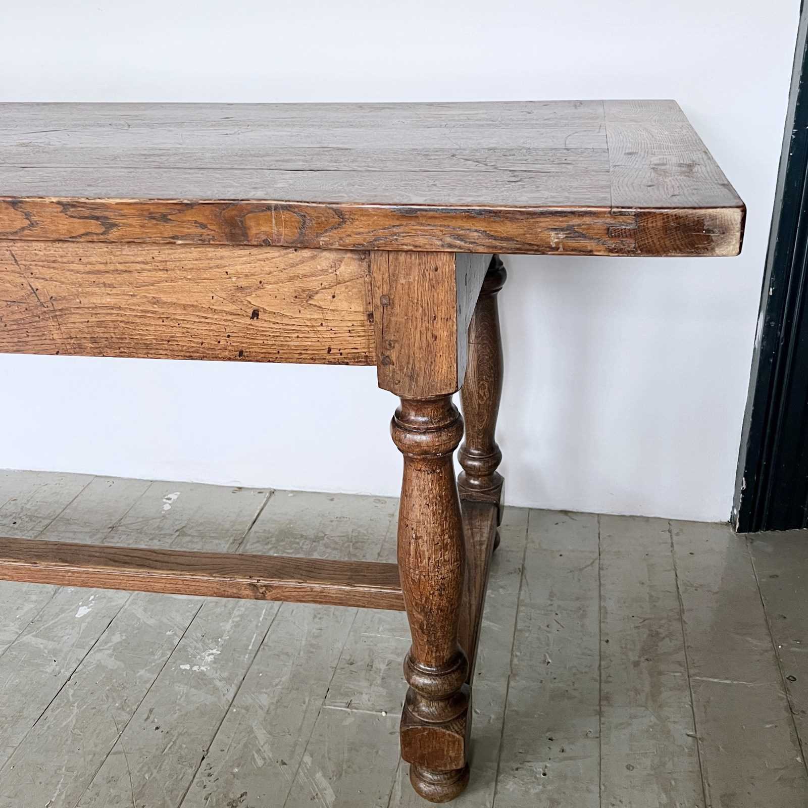 17th century style solid oak refectory table from The Merchant Taylors’ School, Liverpool. Founded in 1620. The piece is in great antique condition. The top does come apart from the base. Long and narrow piece.