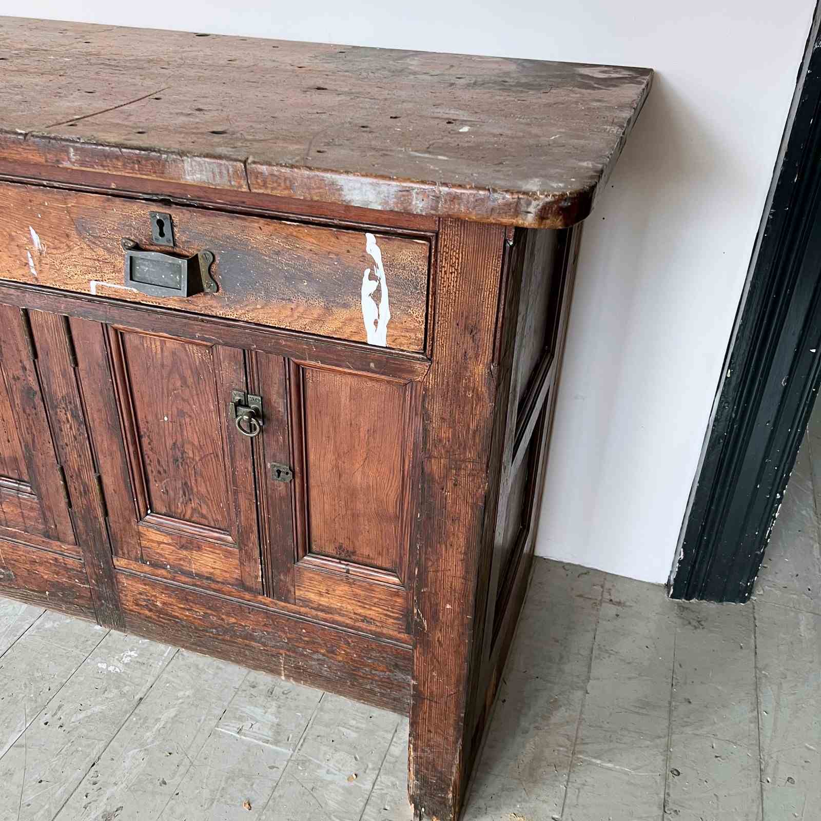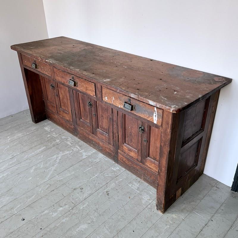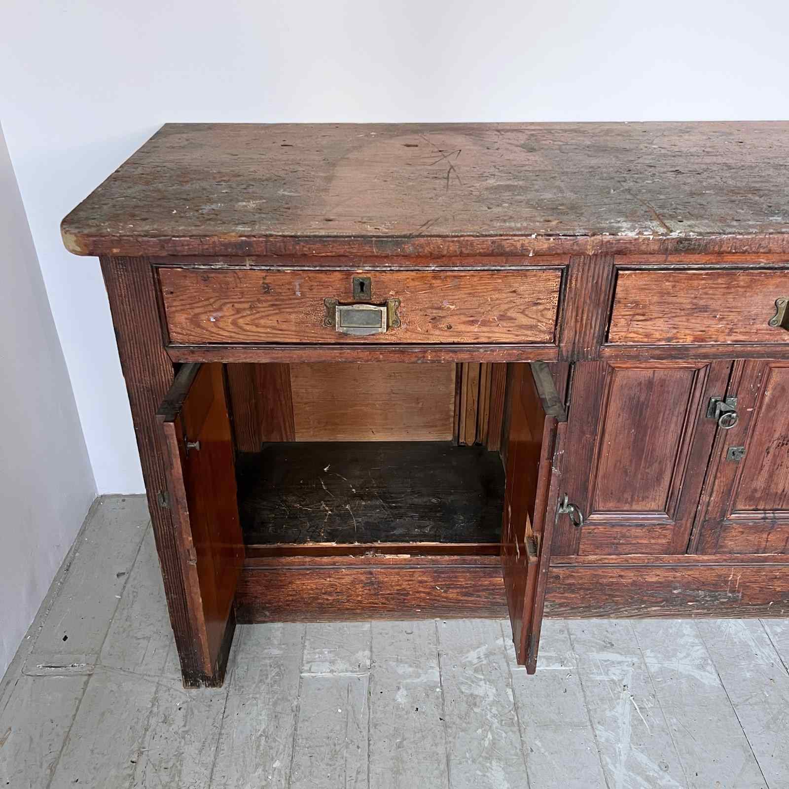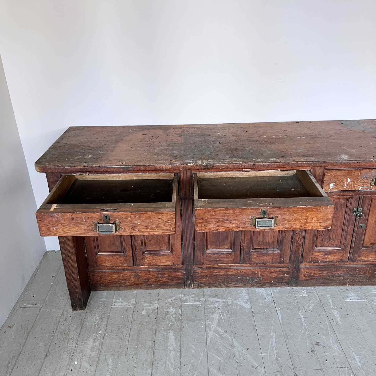 Large wooden scientific laboratory work station. Salvaged from The University of Manchester, dating from early 1900s. Well worn, authentic patina retained with our sympathetic restoration.
