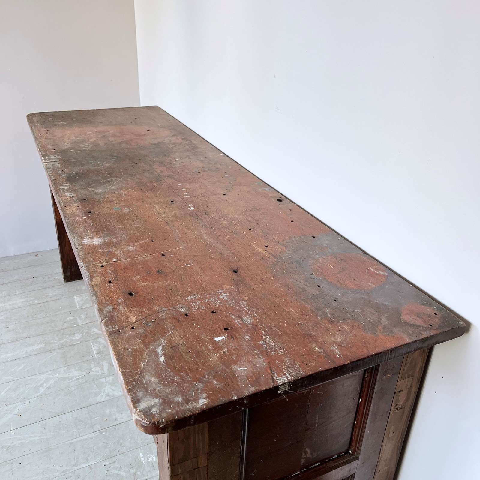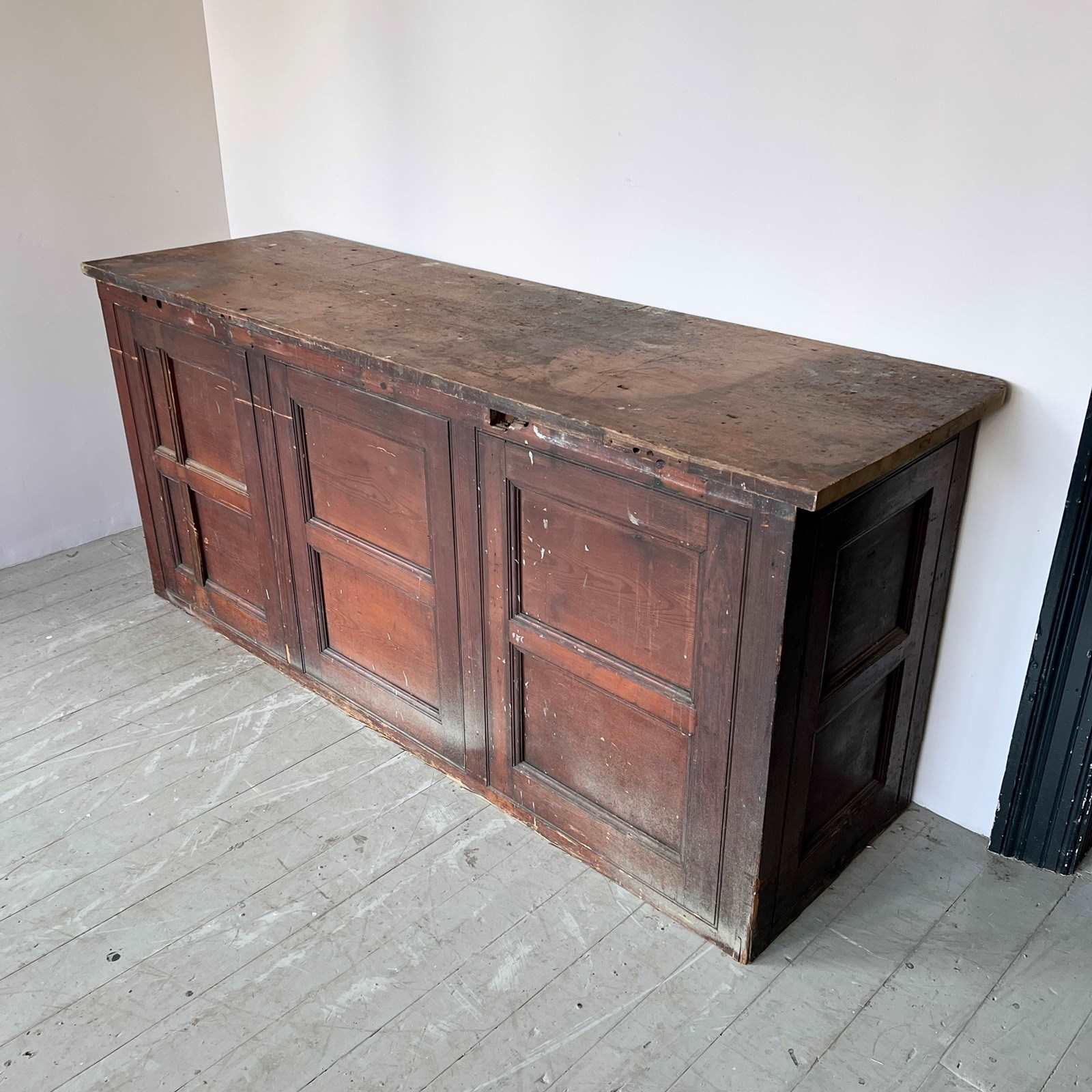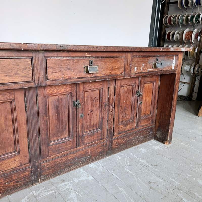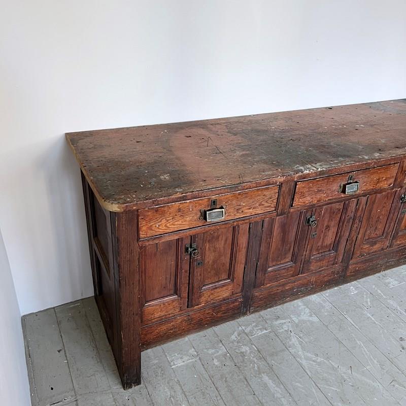 Large wooden scientific laboratory work station. Salvaged from The University of Manchester, dating from early 1900s. Well worn, authentic patina retained with our sympathetic restoration.
