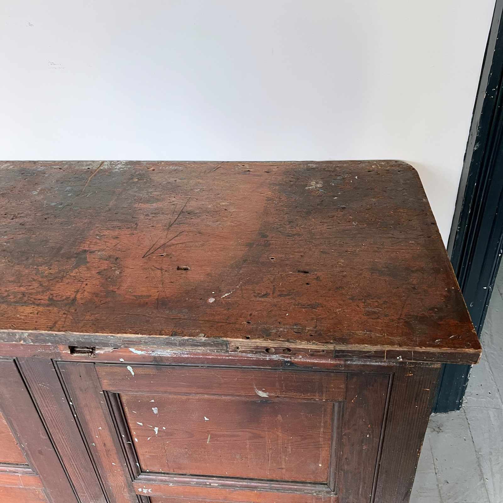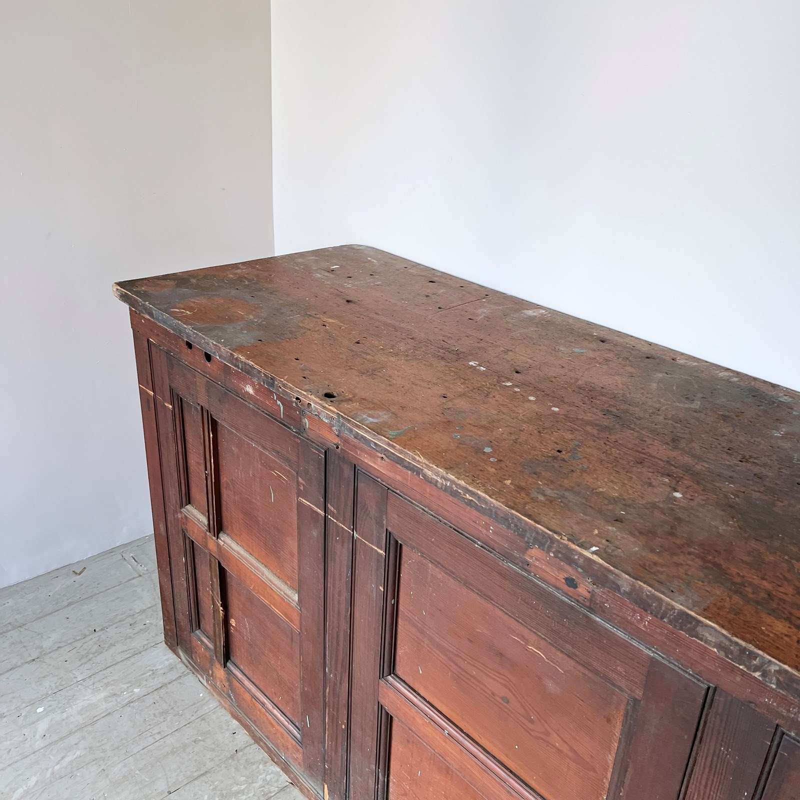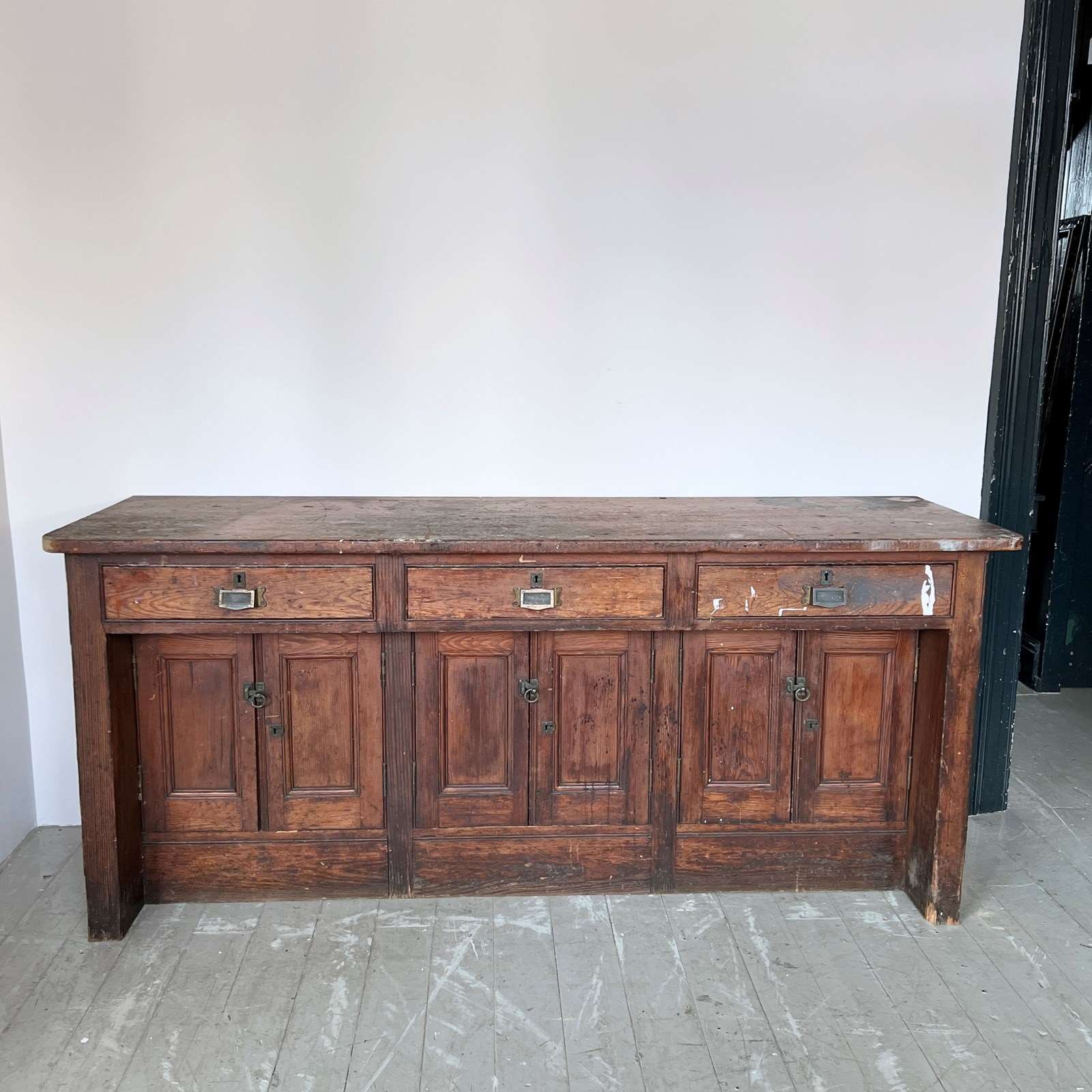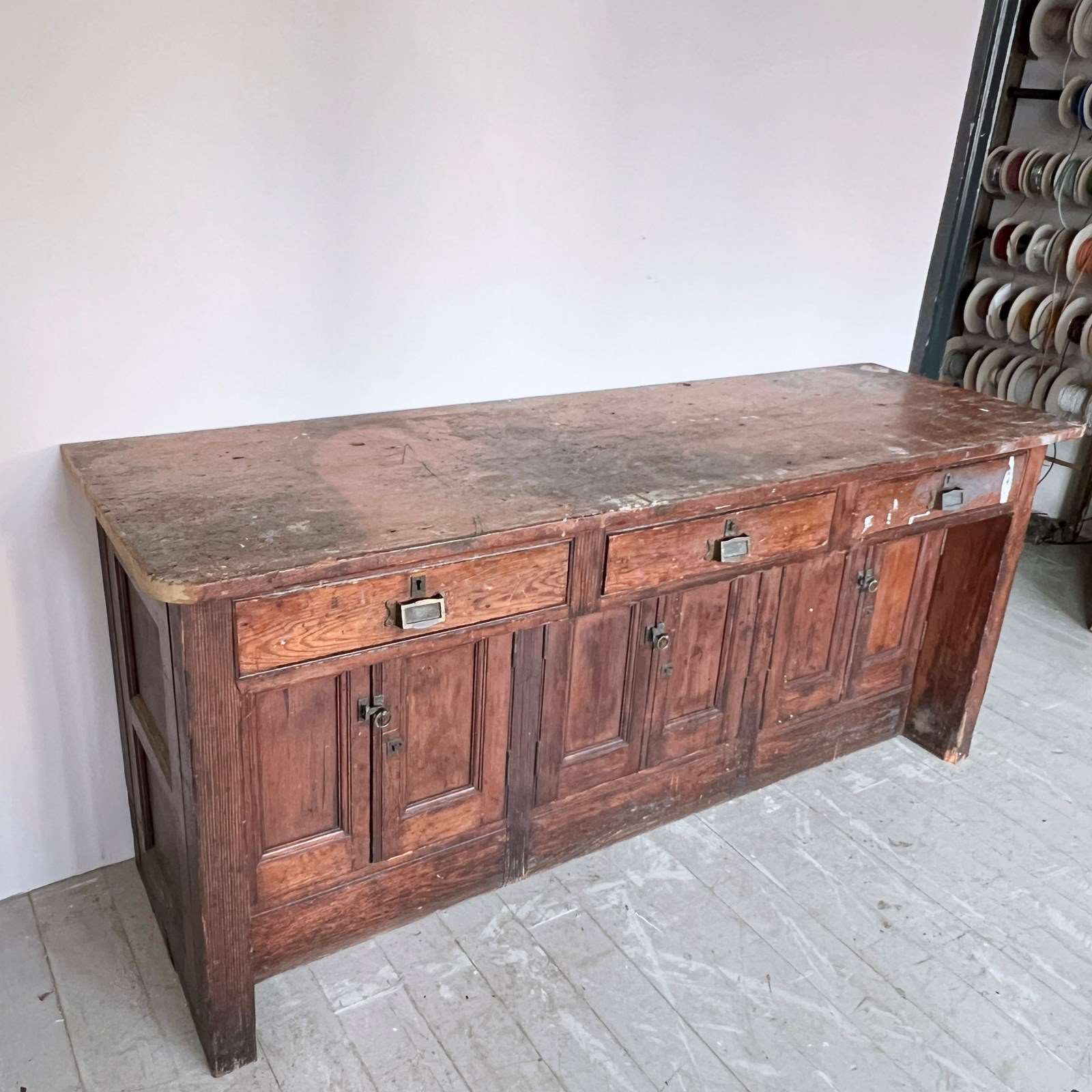Large wooden scientific laboratory work station. Salvaged from The University of Manchester, dating from early 1900s. Well worn, authentic patina retained with our sympathetic restoration.