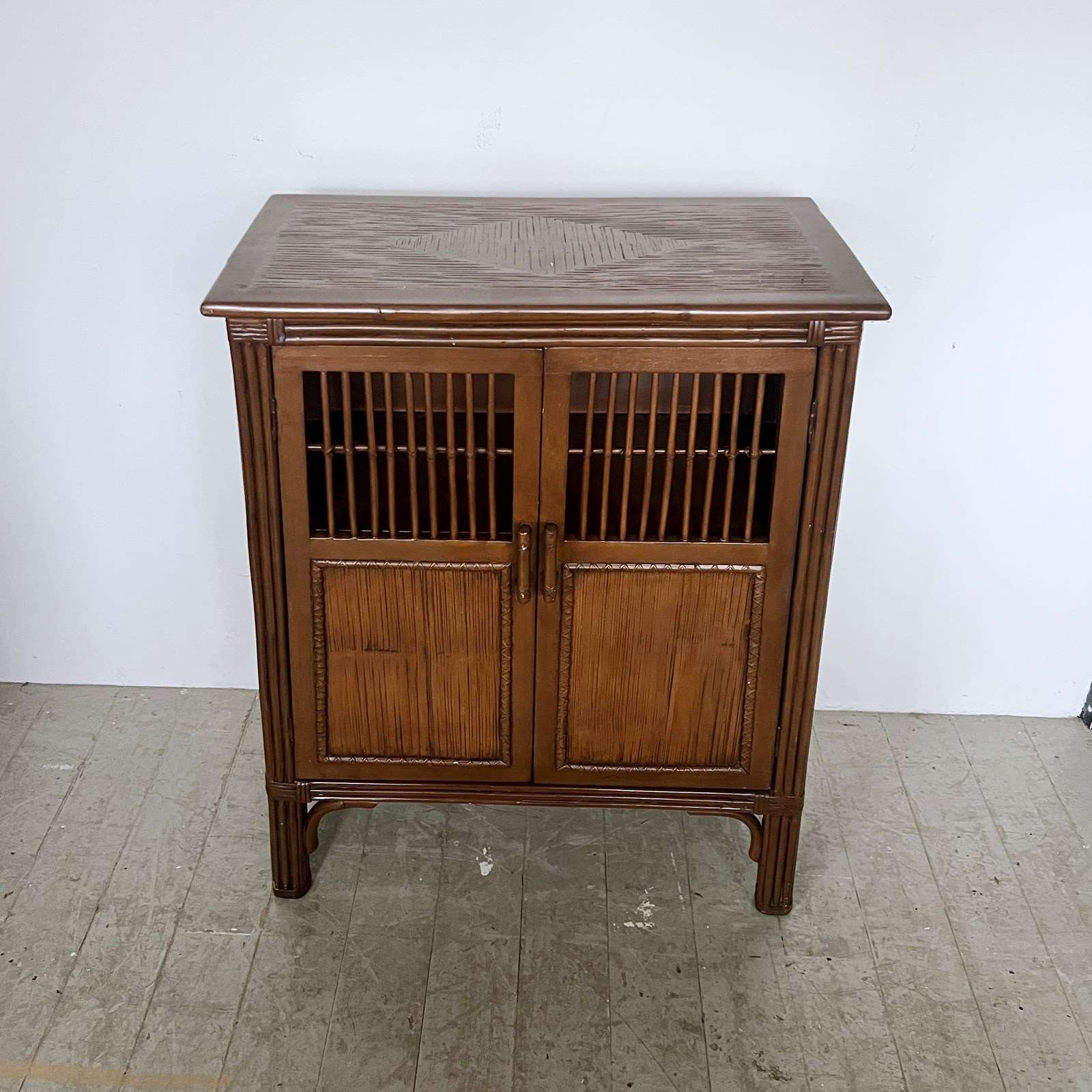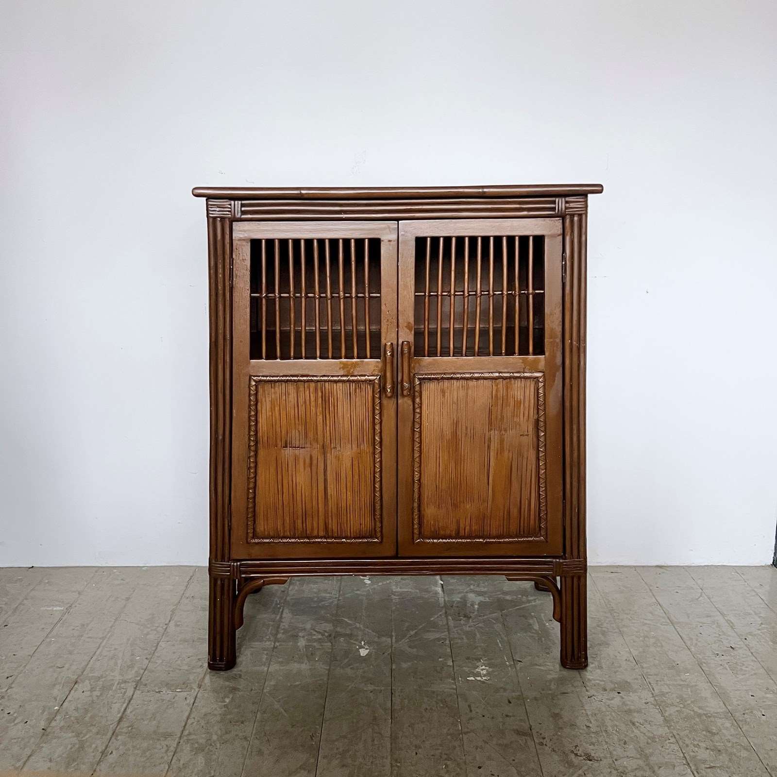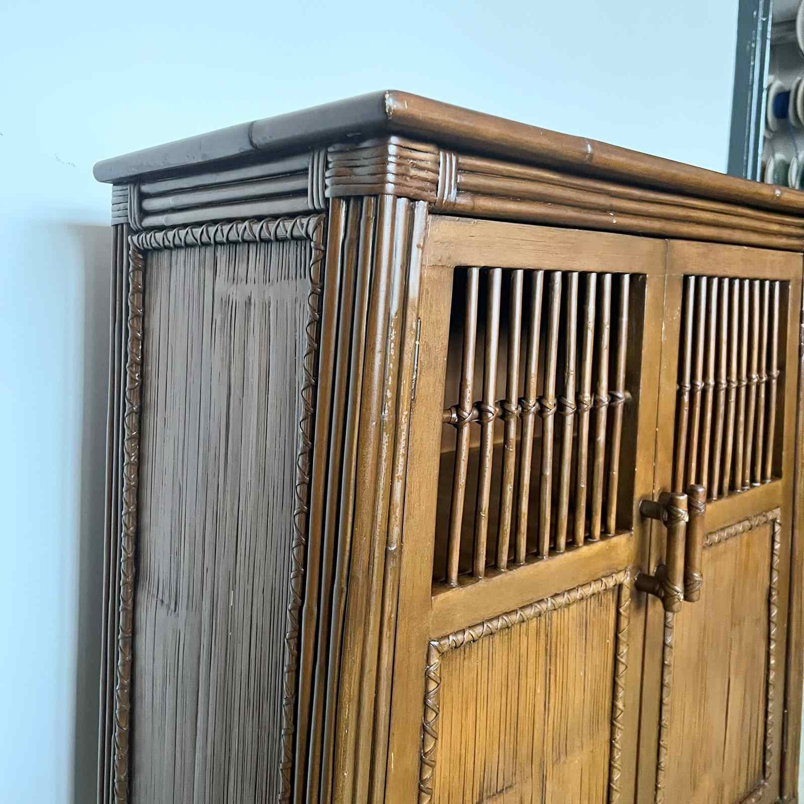 Antique bamboo and rattan cabinet. The piece features wood with stained bamboo for the frame and legs, with woven rattan or slatted bamboo panels on the doors with a traditional design with open slatted upper door sections for ventilation, which is a common characteristic of Chinese or Javanese furniture styles. The sides of the piece slope slightly meaning the legs are wider than the top of the piece.