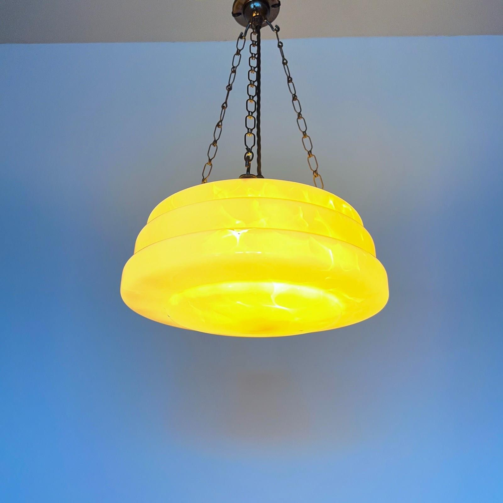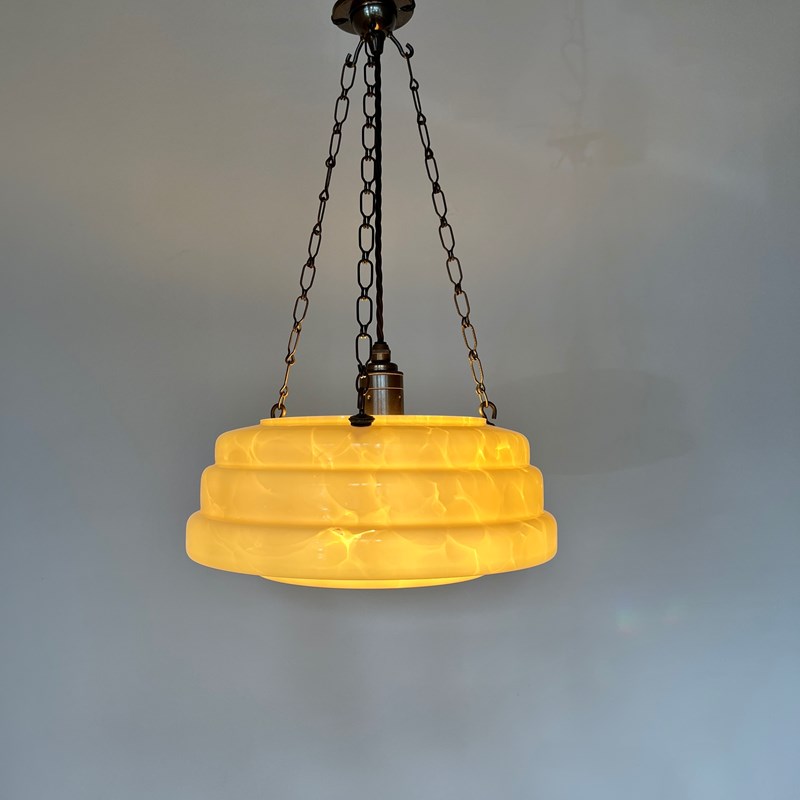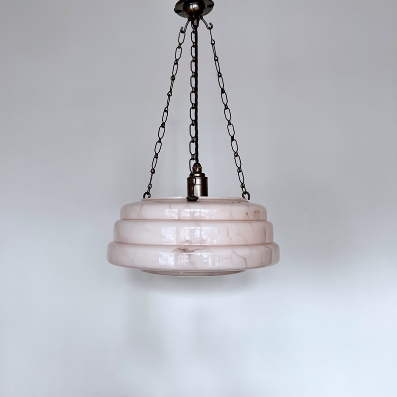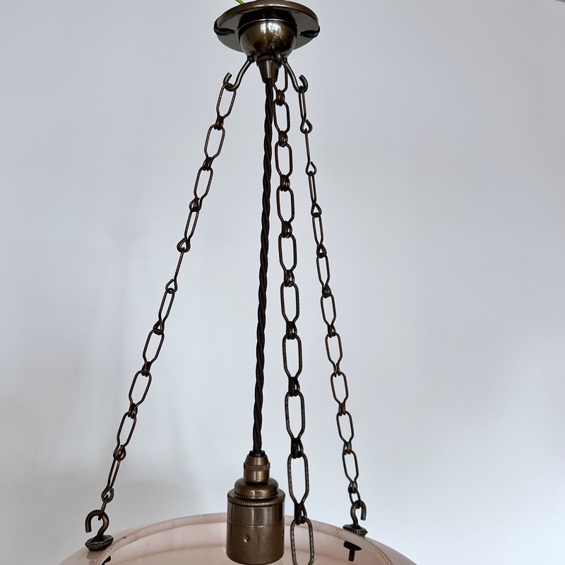 This pendant has been fully restored and rewired here, in Stockport, near Manchester by our small team of experts and is now ready to be installed. We recommend that this pendant is installed by an electrician into a joist or a supporting noggin. To clean dust the metal components regularly with a soft cloth. The glass shade can then be wiped with a glass wipe or a cloth that has been sprayed with glass cleaner. A final wipe with a paper towel will give a polished finish.