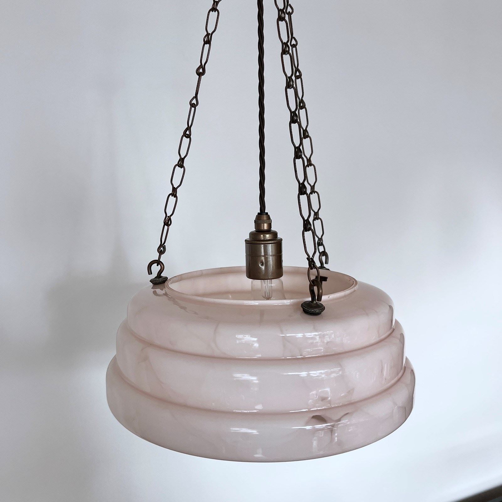 Art Deco Pink Clichy polished glass ‘Fly Catcher’ pendant with mottled glass details. Rewired with dark brown braided flex the pendant comes with delicate chain and a three hook ceiling fitting. E27 lamp required. This is not included but can be supplied. Total drop easily adjustable.