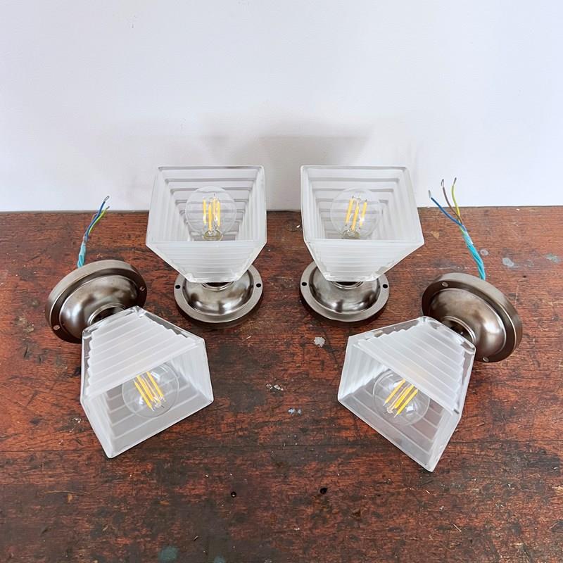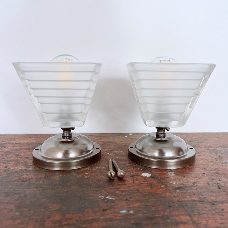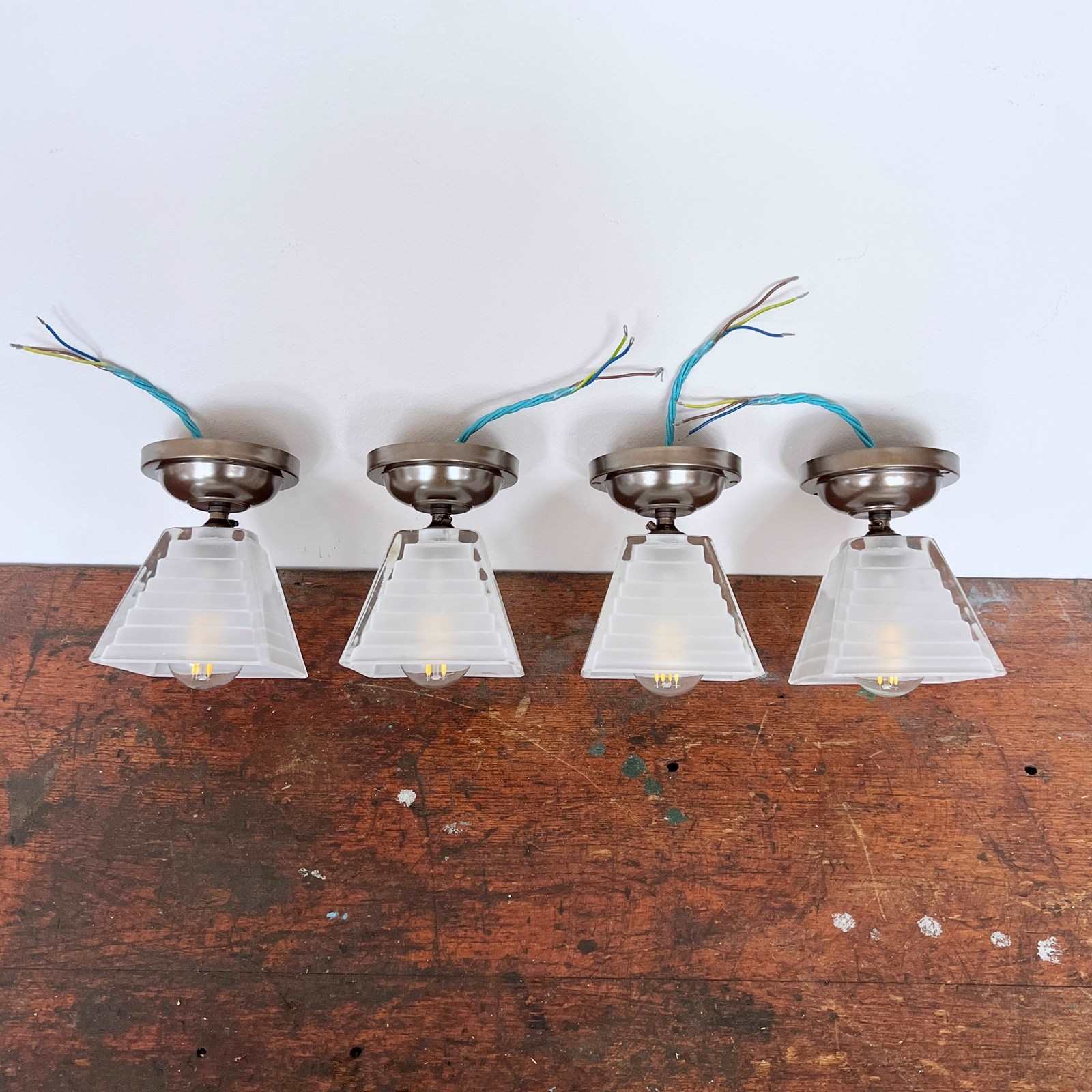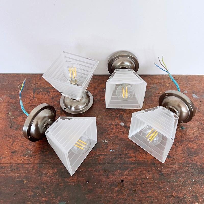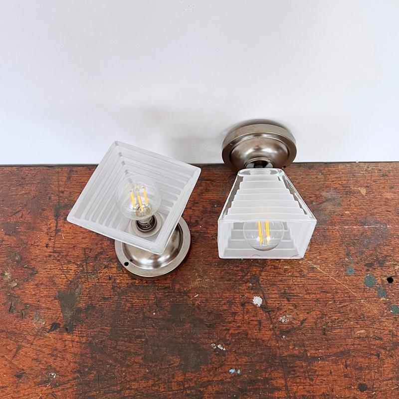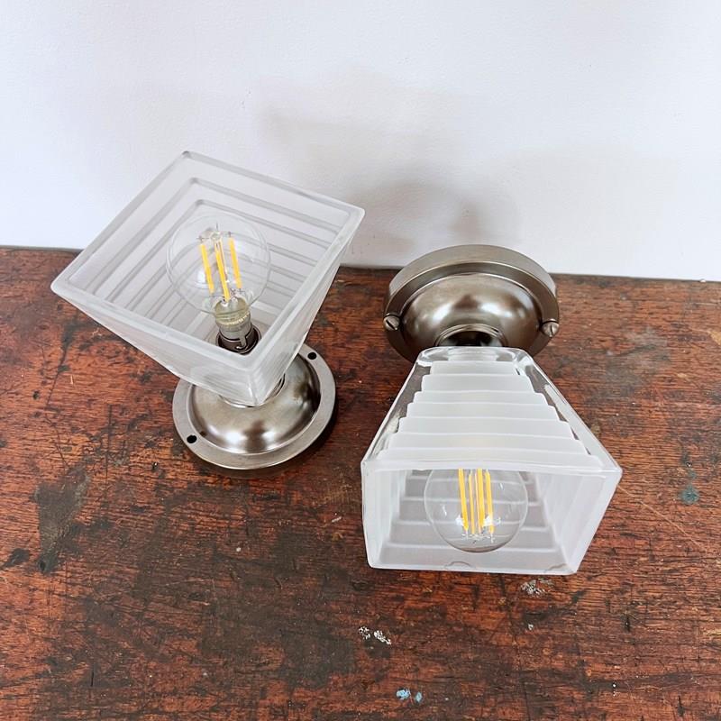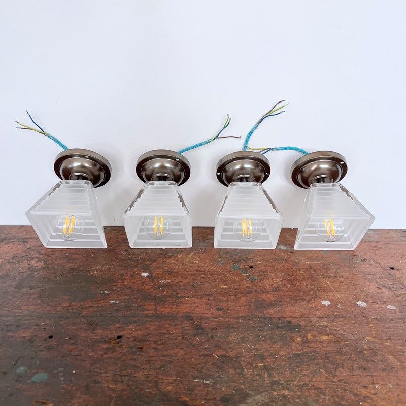 Art Deco frosted square shades with decorative tiered pattern. Rewired with an antique brass finish fitting. These shade have been wired to fit directly to the ceiling. Each shade requires one B15 bulb. These are not included but can be supplied.