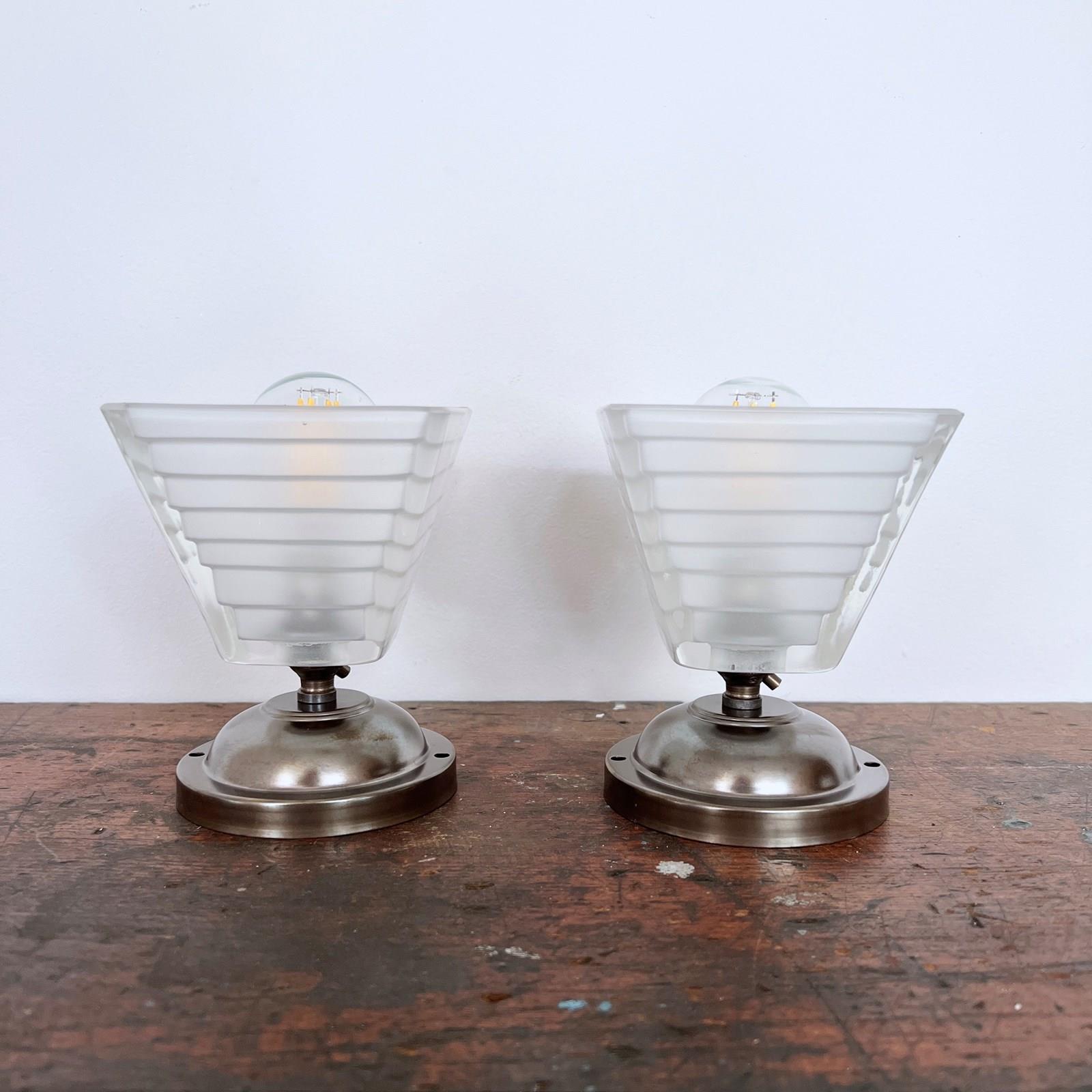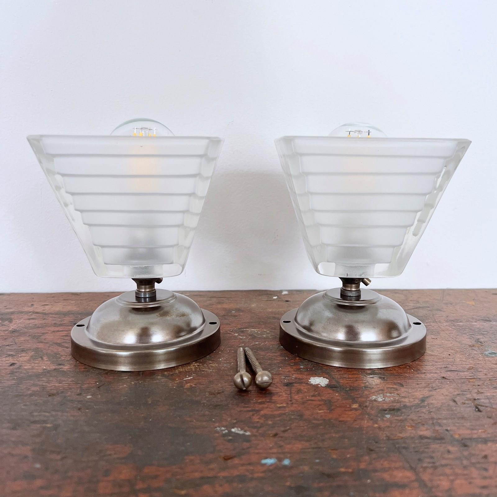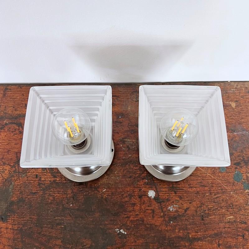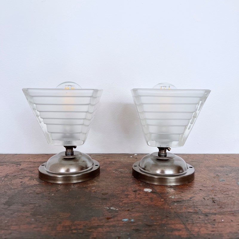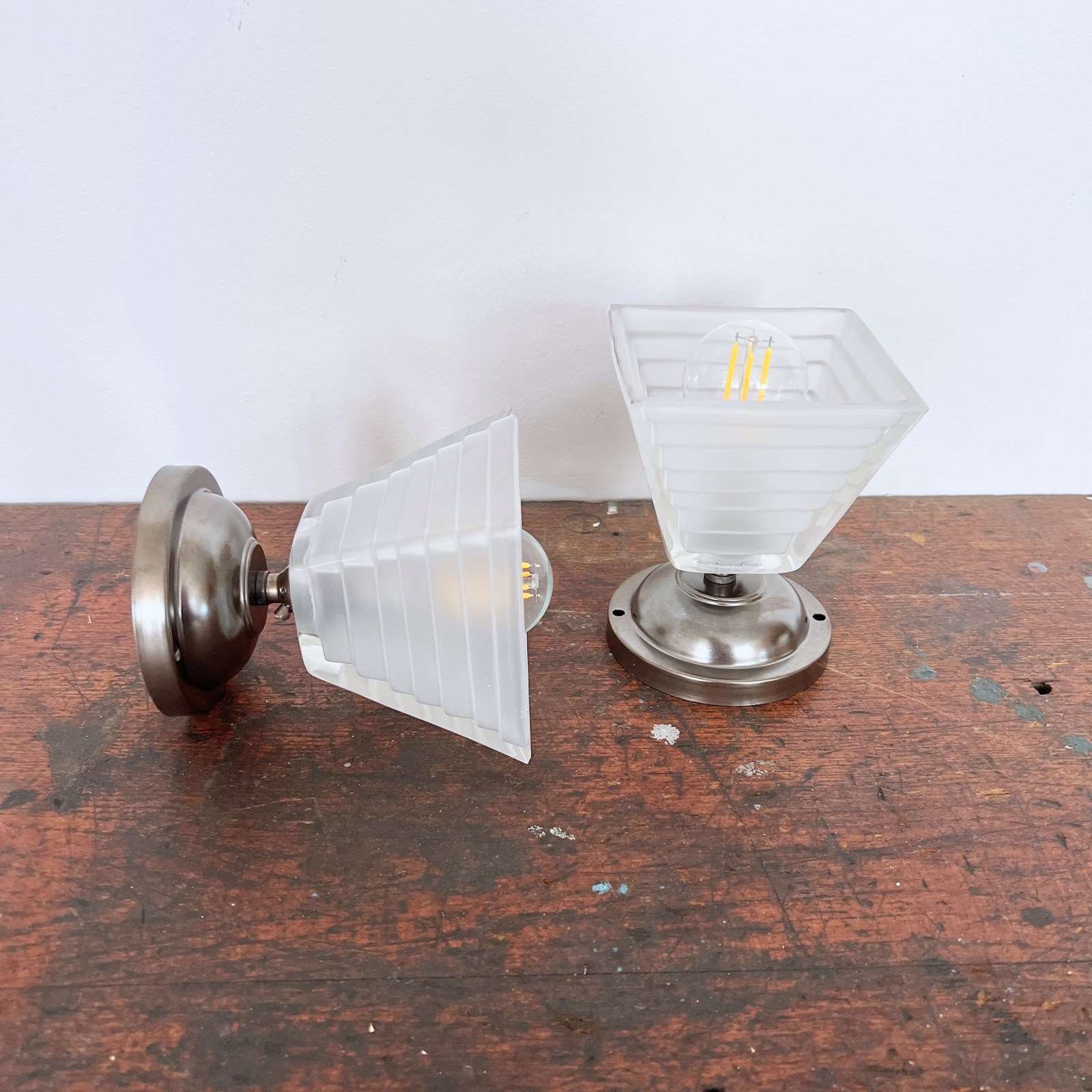 Art Deco frosted square shades with decorative tiered pattern. Rewired with an antique brass finish fitting. These shade have been wired to fit directly to the ceiling. Each shade requires one B15 bulb. These are not included but can be supplied.