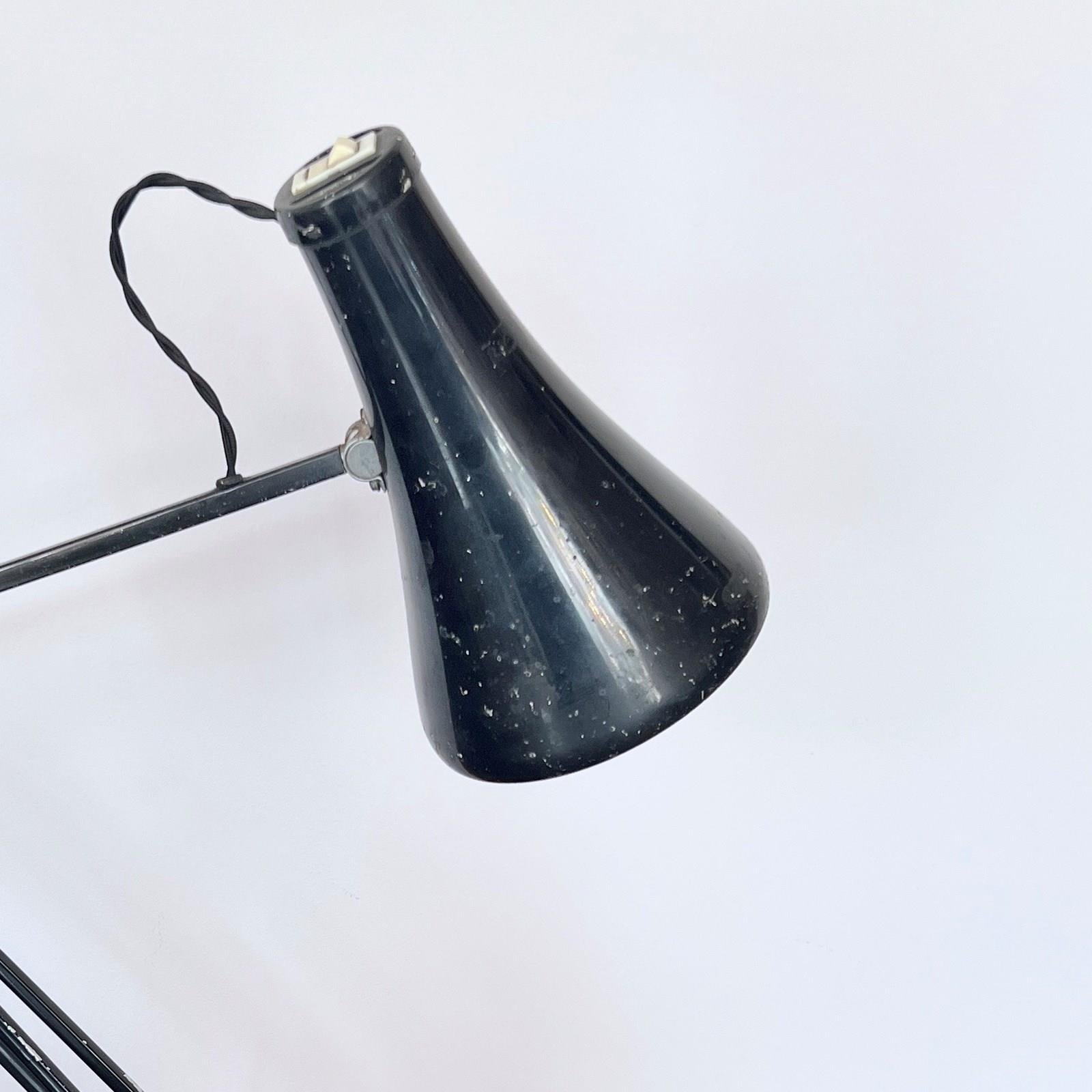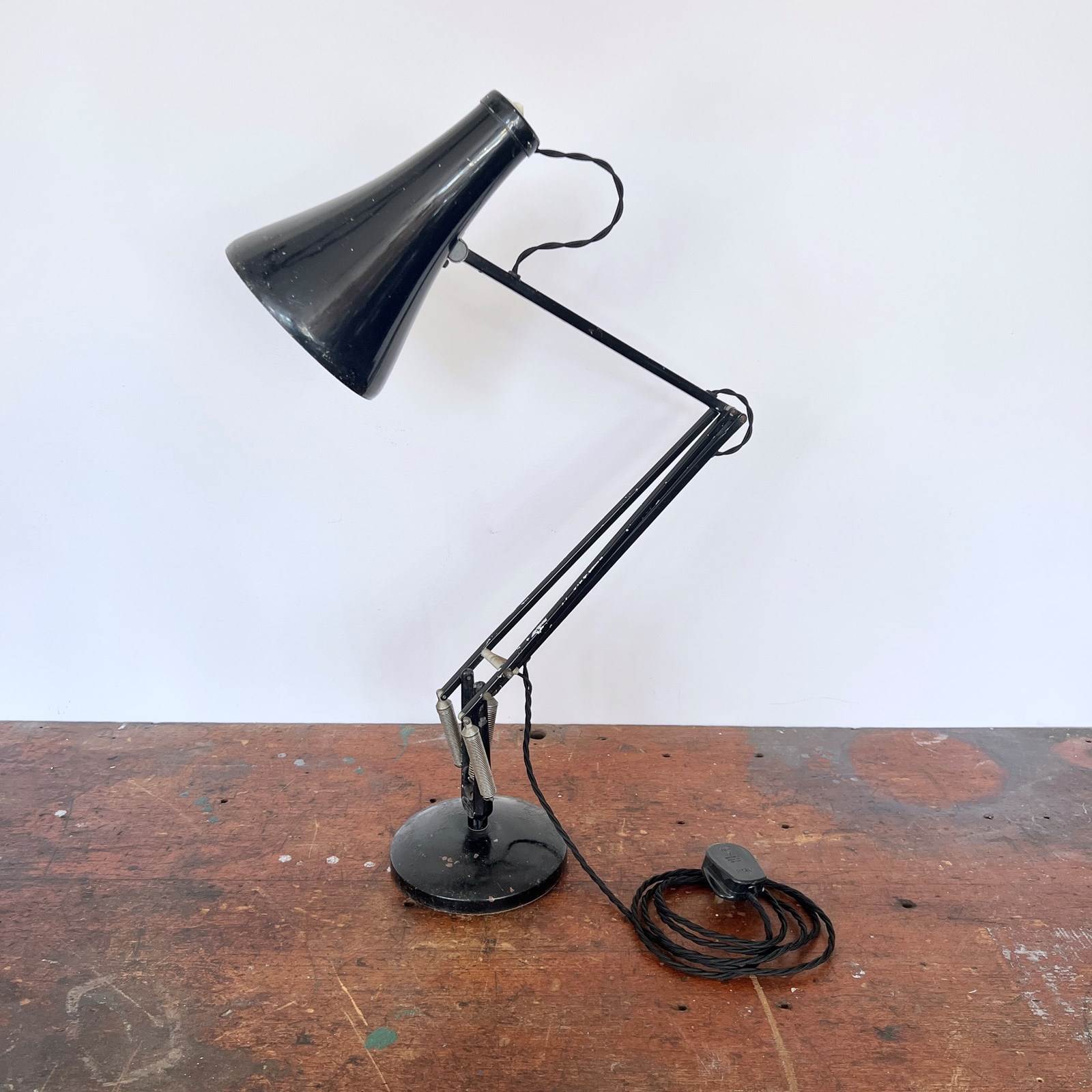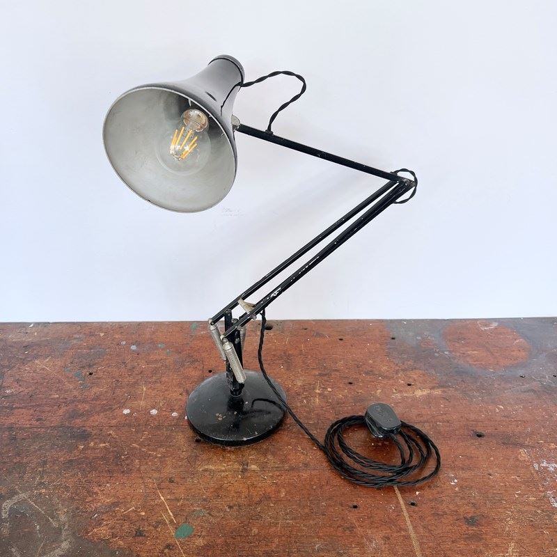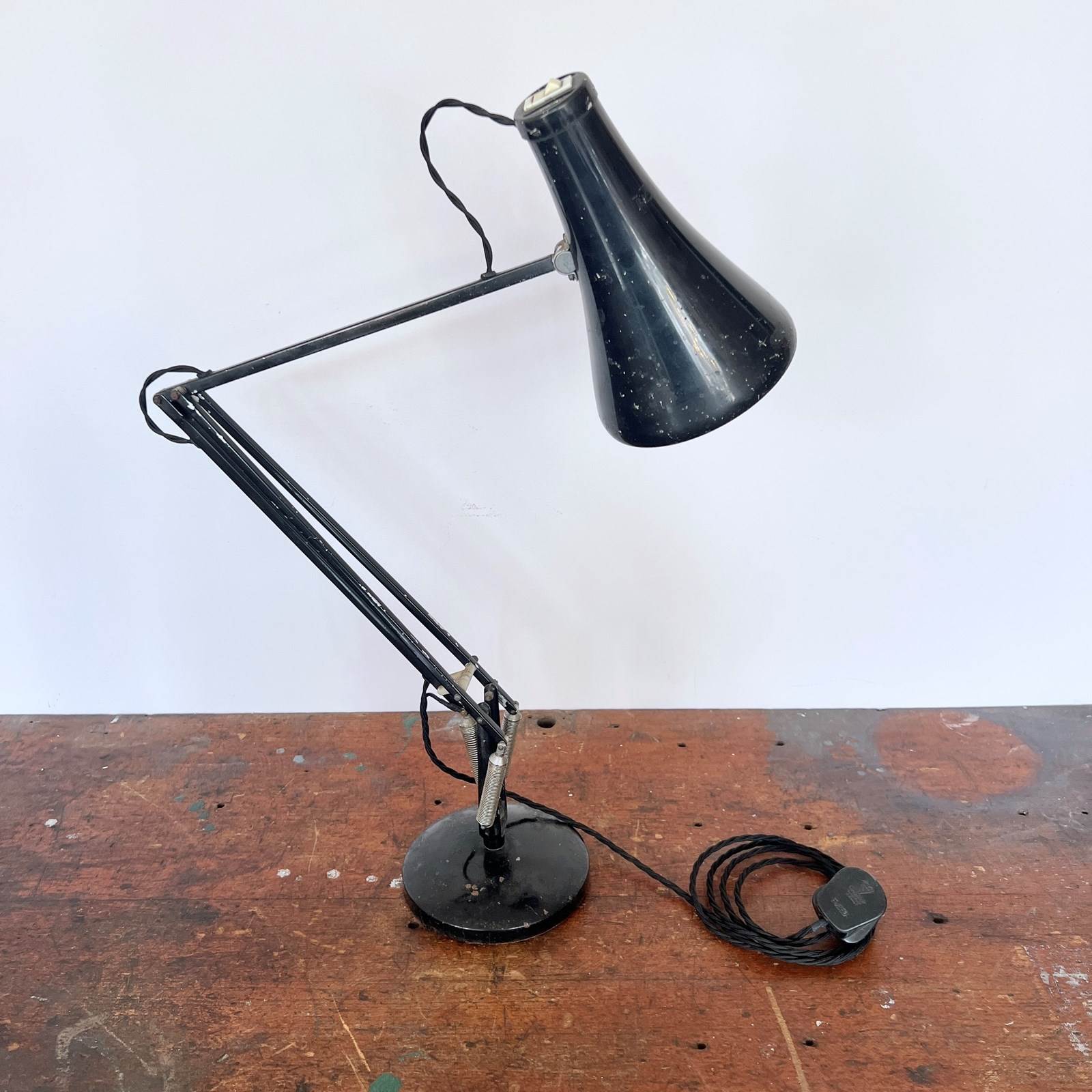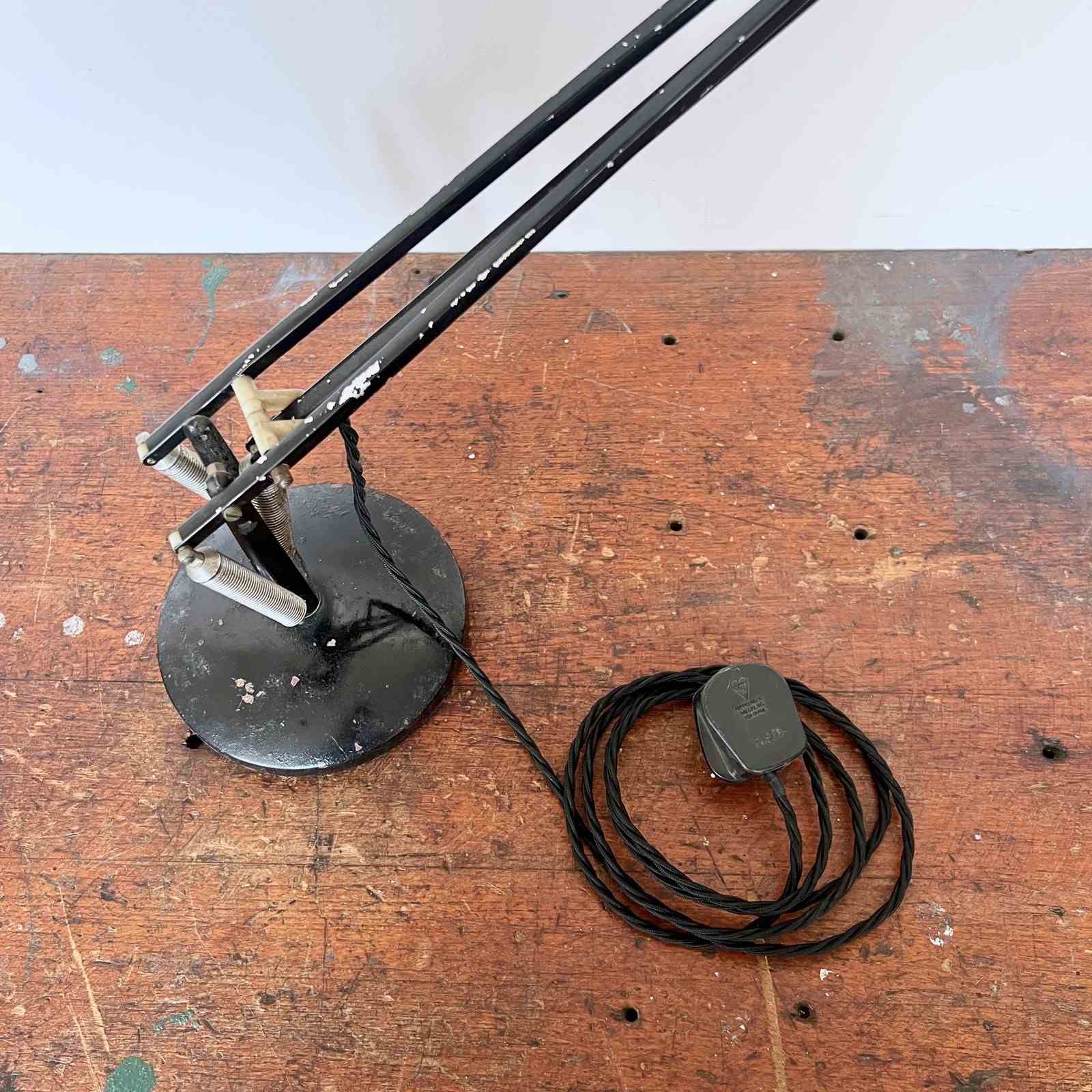 Black metal Anglepoise desk lamp. Rewired with black braided flex and a new three pin plug. The piece retains the original working switch. The lamp requires one B22 bulb, this is not included but can be supplied.