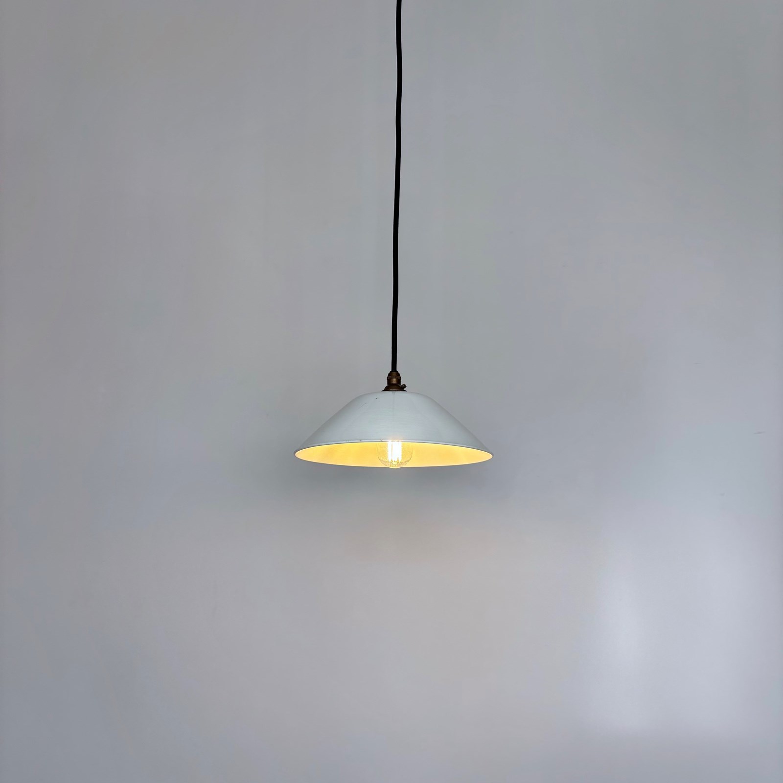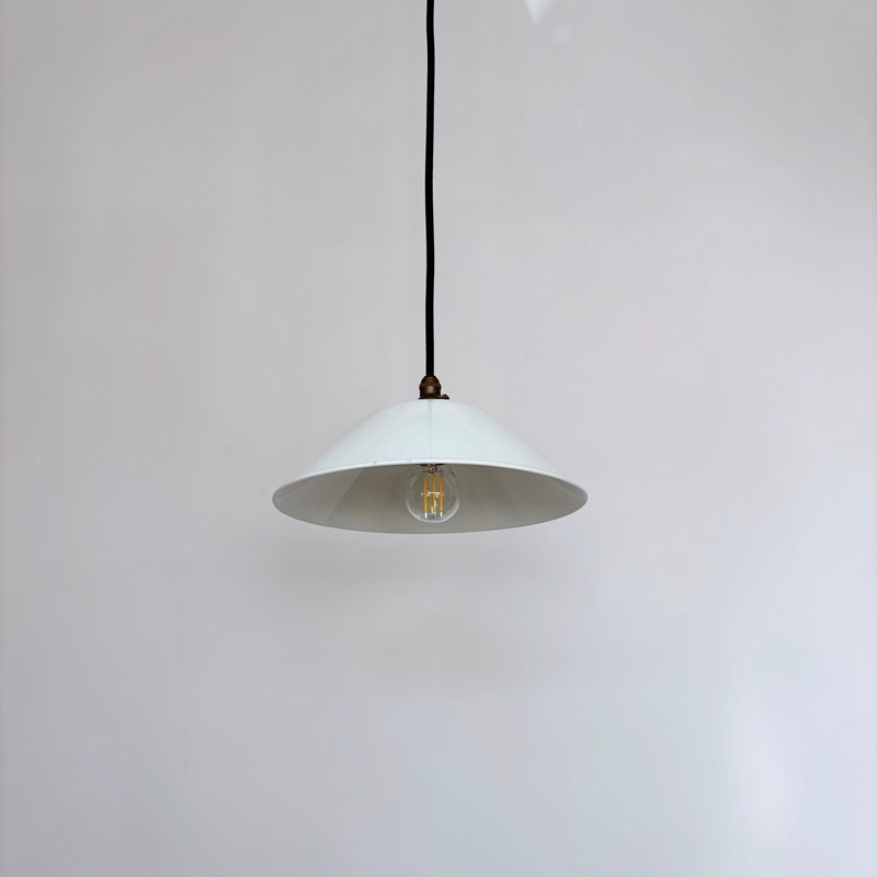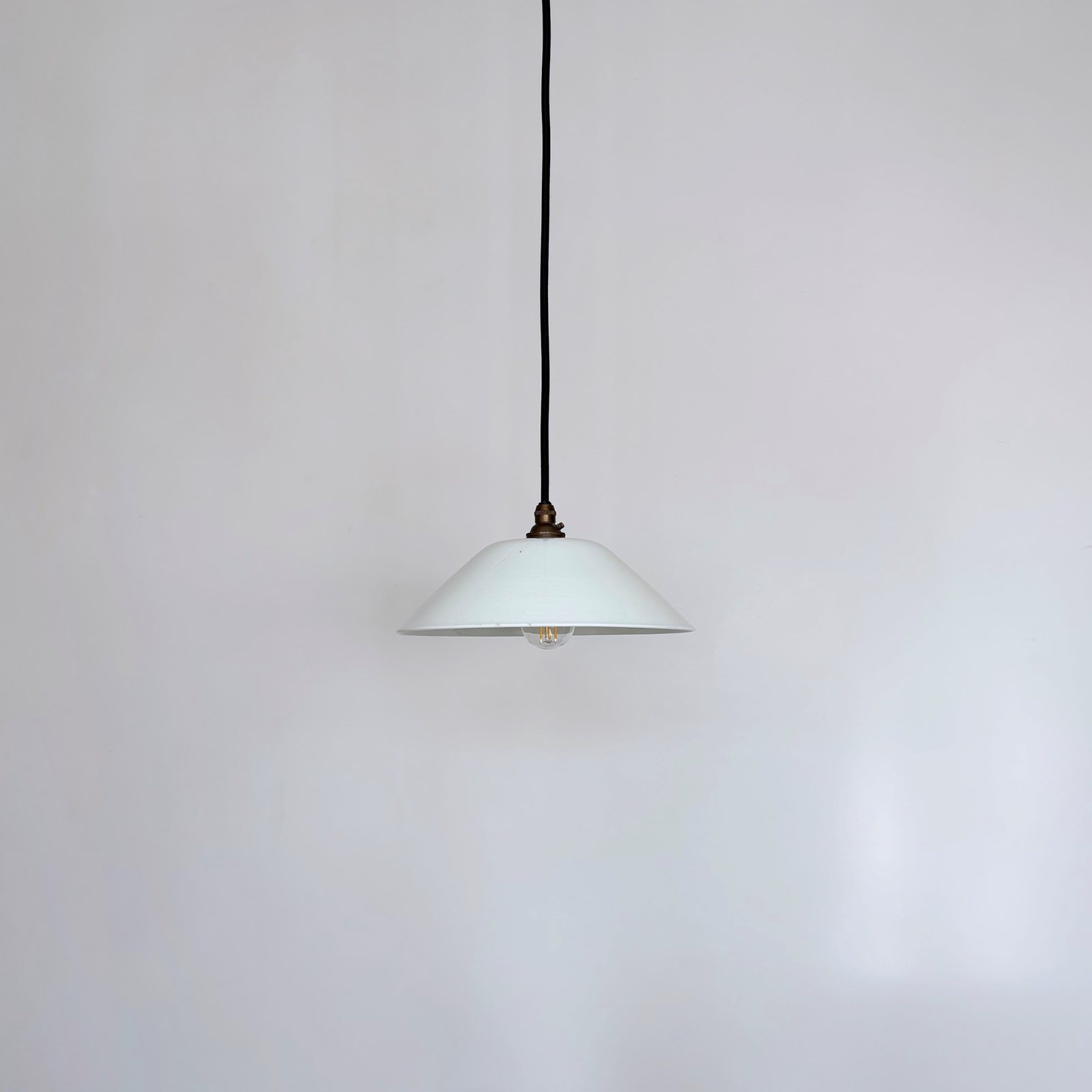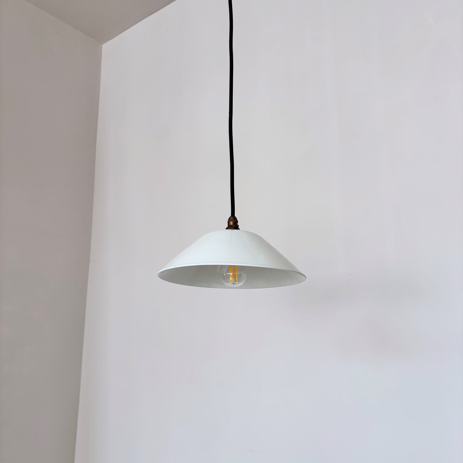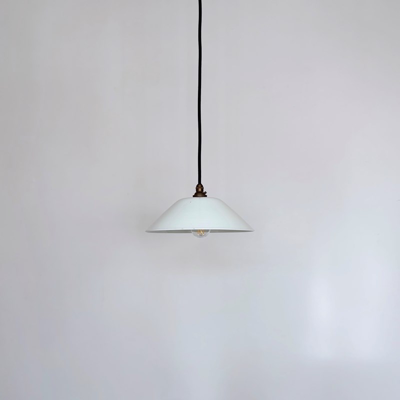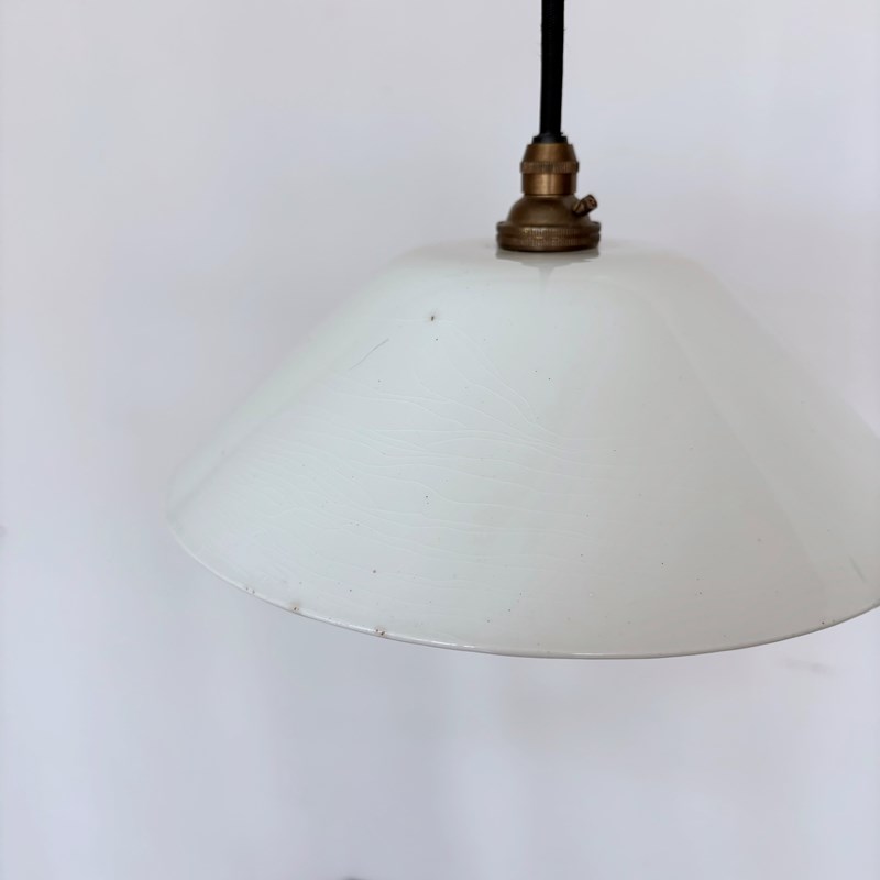 Cream ceramic coolie shade. Rewired with an antique brass fitting and black rounded flex. The shade requires one B22 lamp. The coloured flex can be changed to your preference and a matching ceiling fitting is supplied.