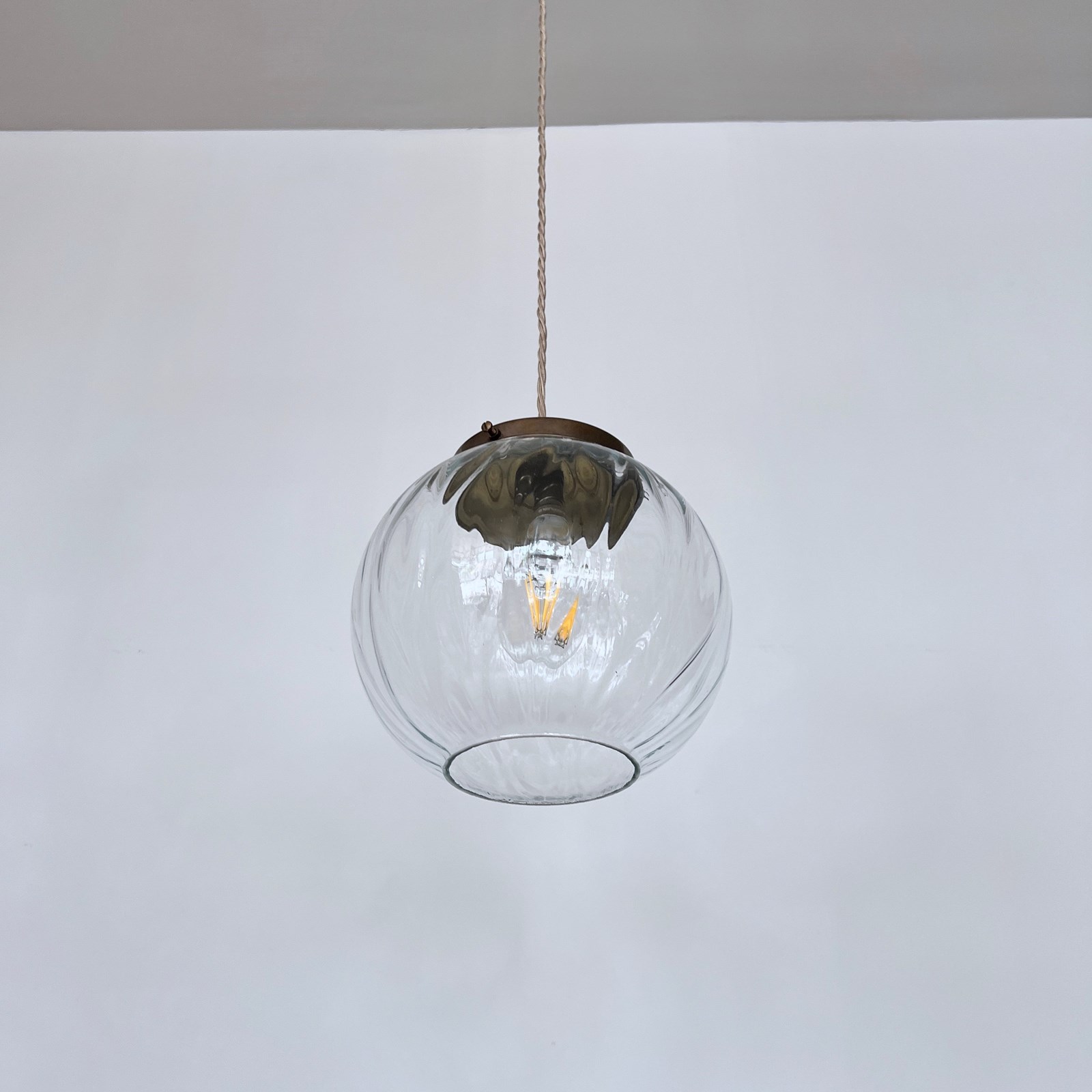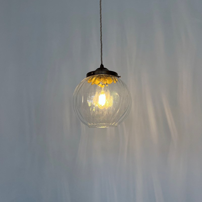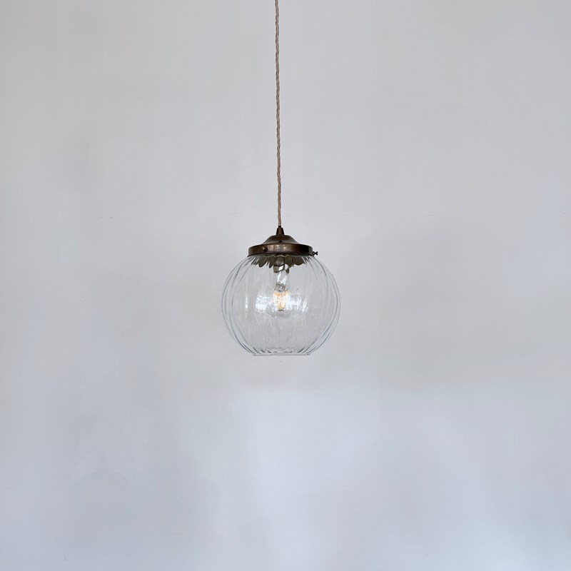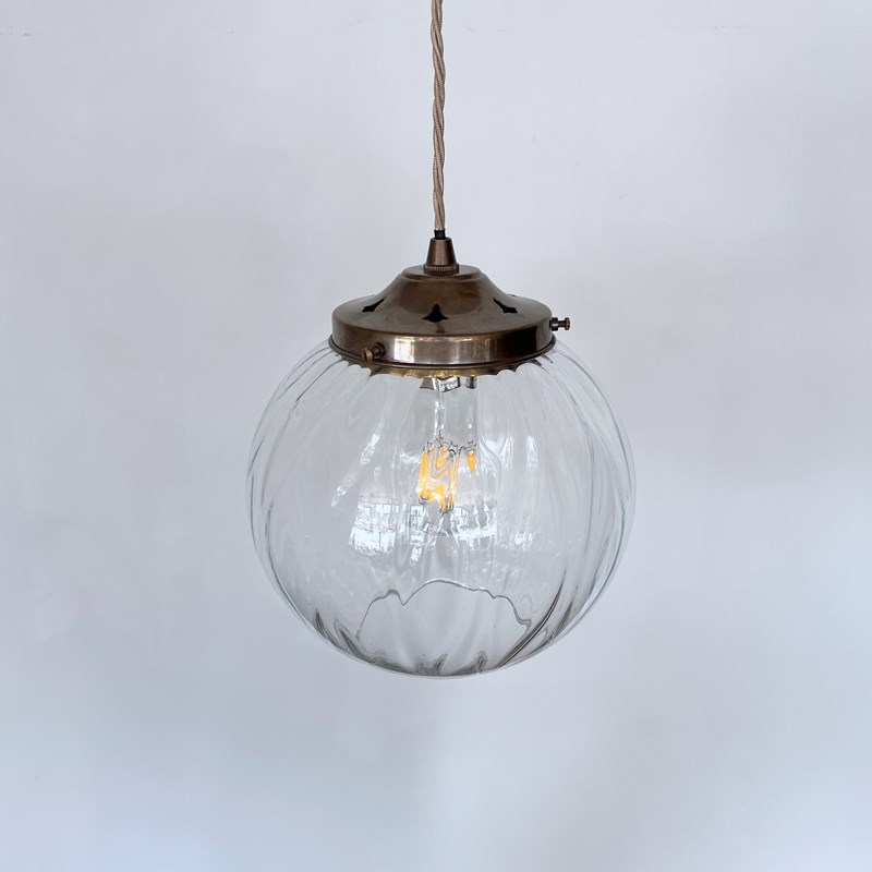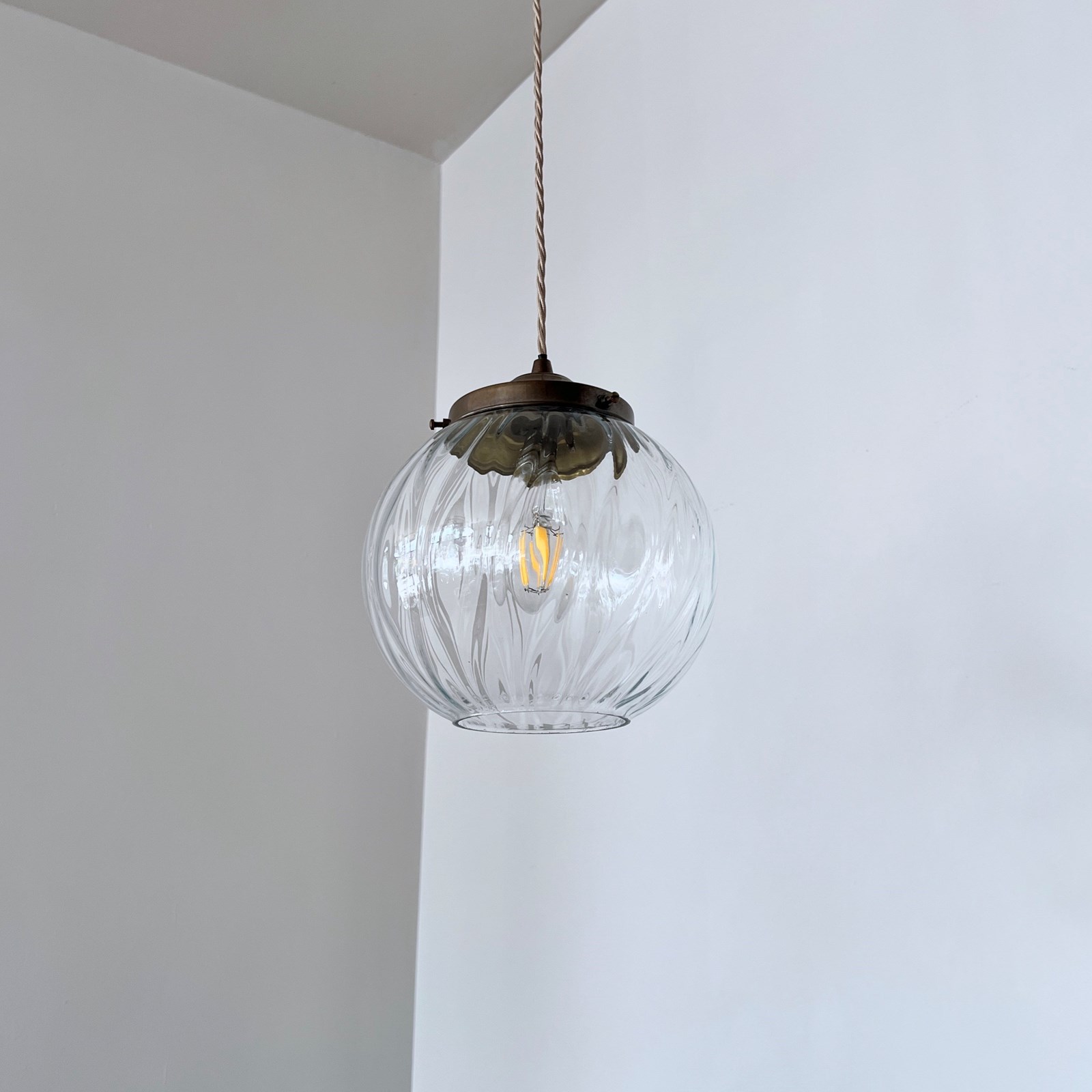 Clear globe shade with textured glass details. Finished with an antique brass finish fitting and pigeon braided cable. The coloured braided flex can be changed to your preference and a matching ceiling fitting is supplied. The shade requires one b22 bulb. This is not included but can be supplied.