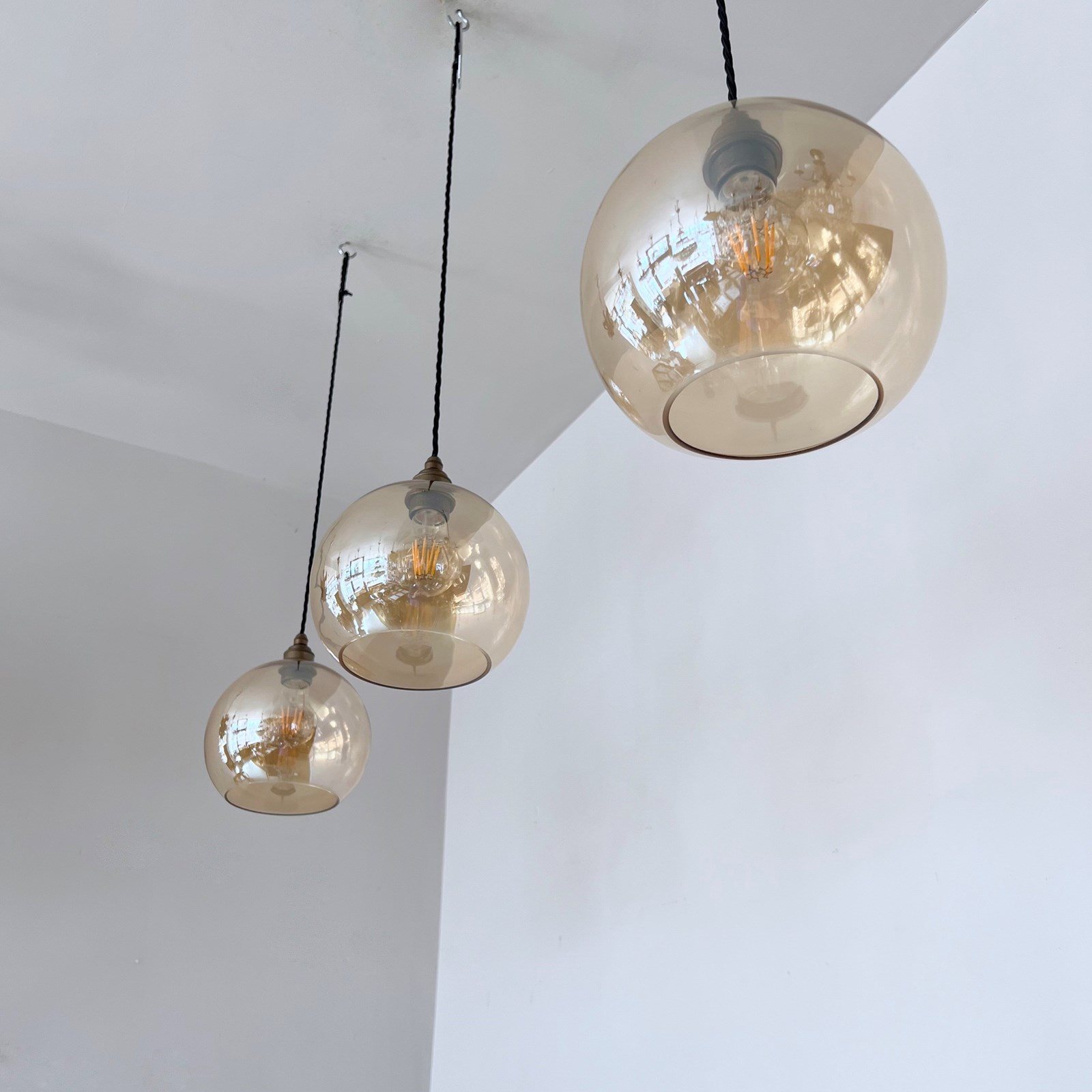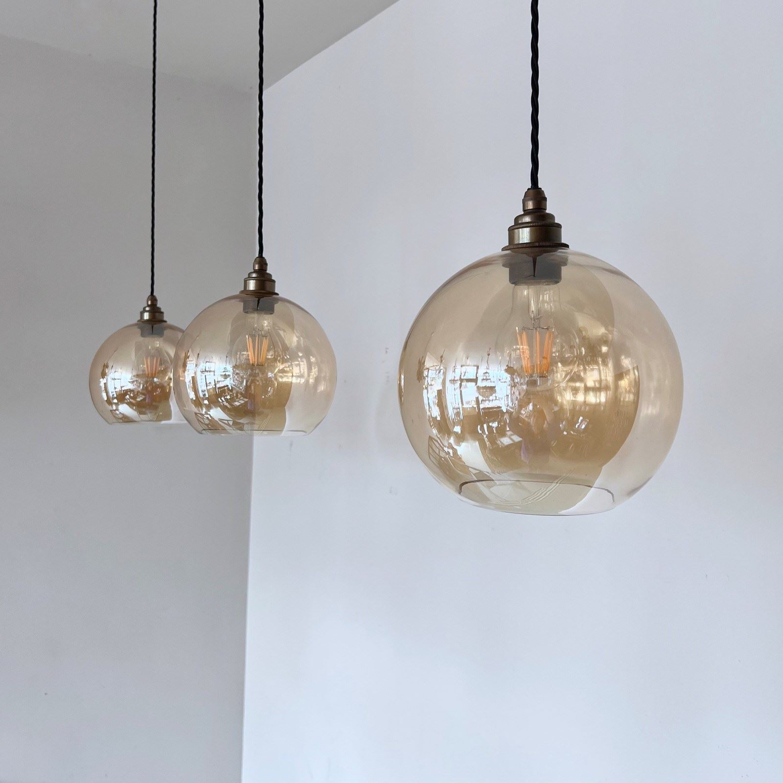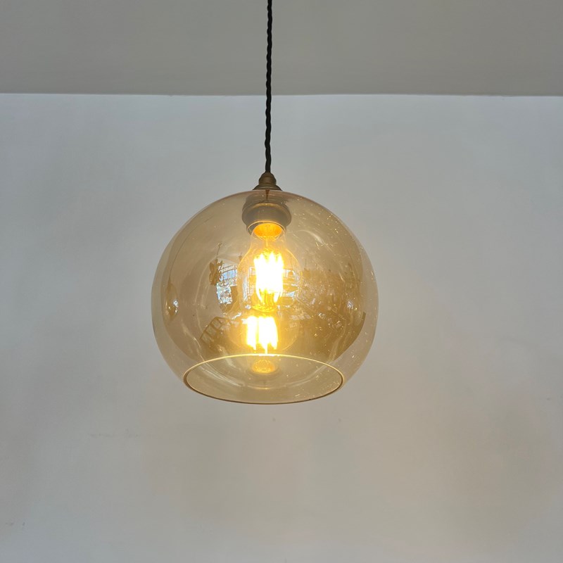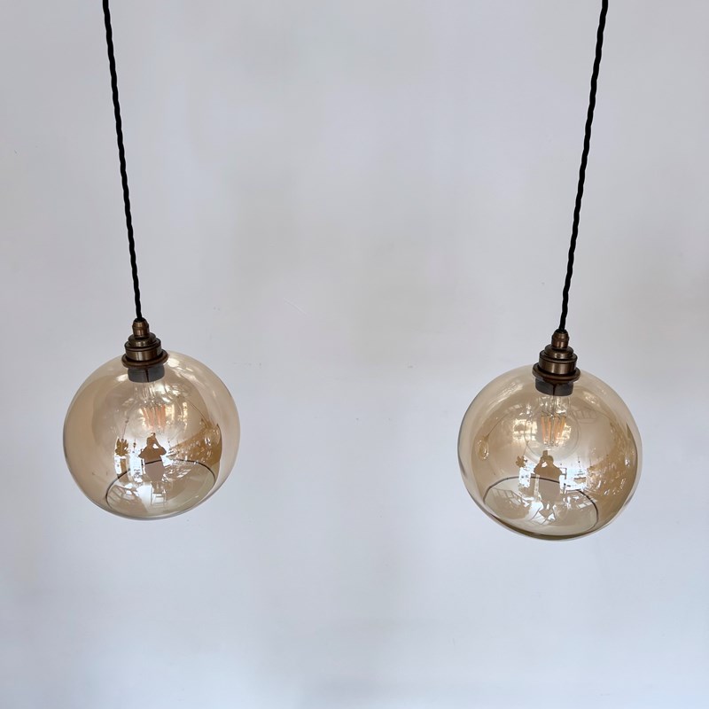 Newly made amber glass globe shades. Each shade has been wired with a new antique brass lamp holder. Braided flex shown in Black but other colours are available. Each shade requires one e27 bulb. These are not included. Multiples available. Please enquire for more information.