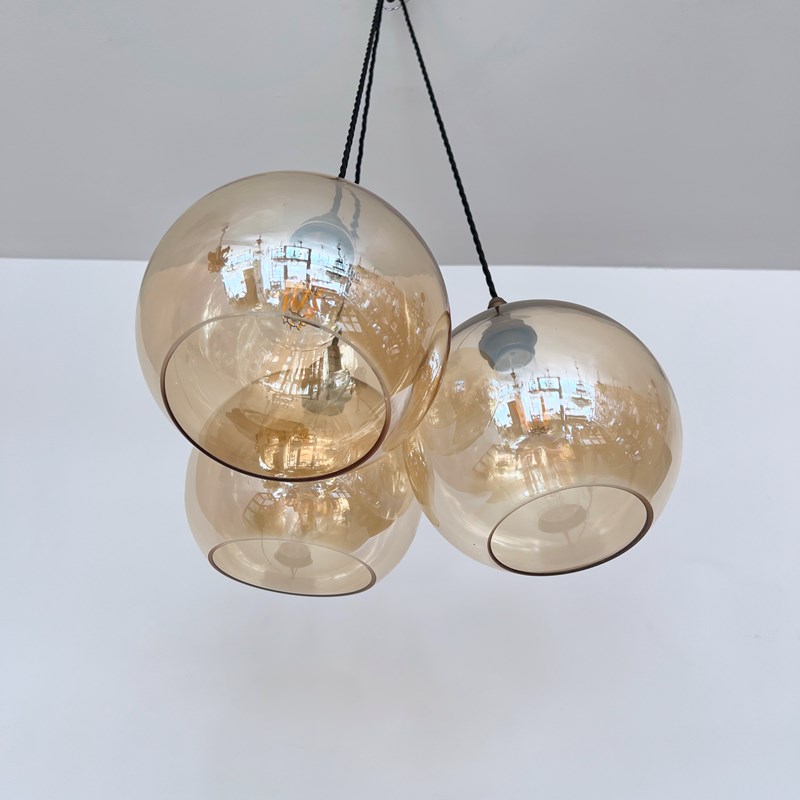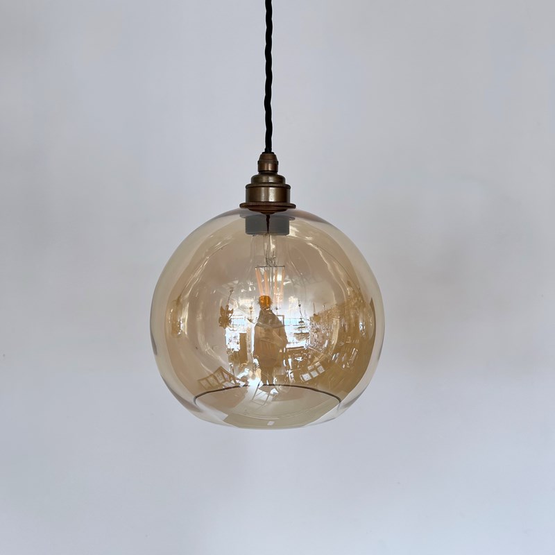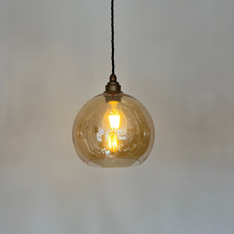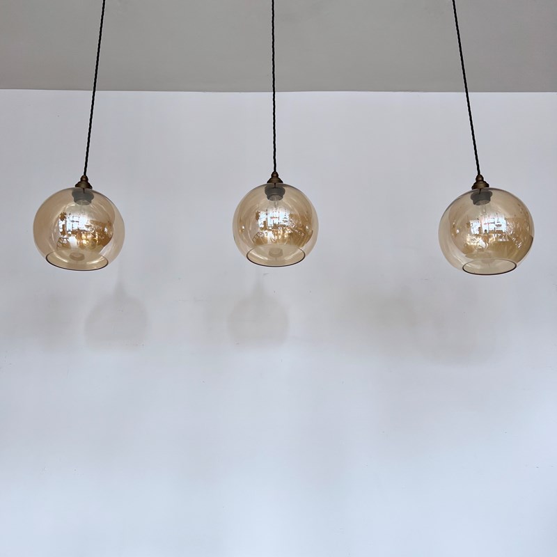 Newly made amber glass globe shades. Each shade has been wired with a new antique brass lamp holder. Braided flex shown in Black but other colours are available. Each shade requires one e27 bulb. These are not included. Multiples available. Please enquire for more information.