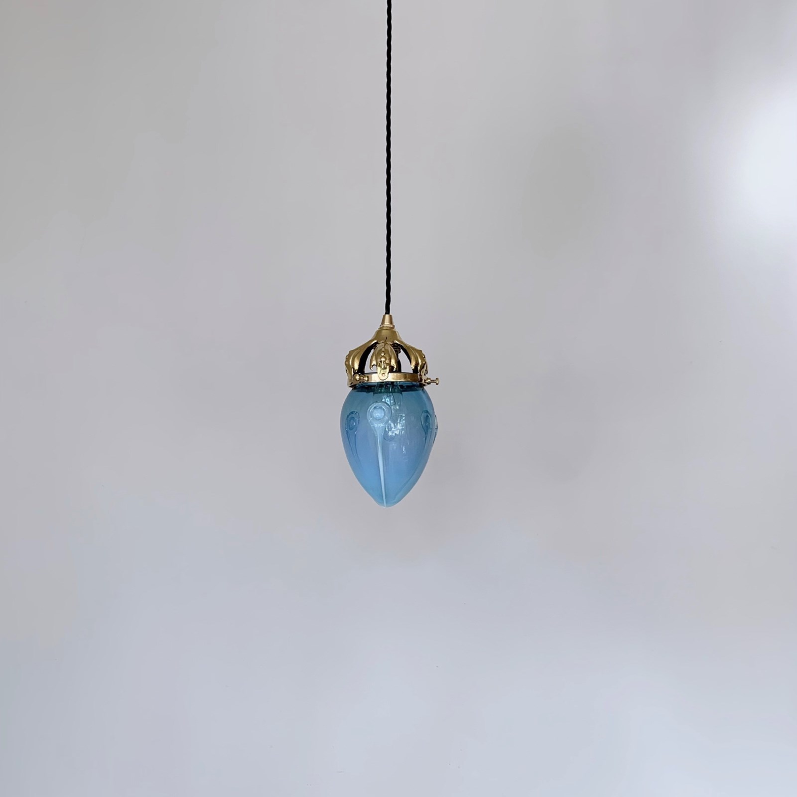 Newly made blue Vaseline Glass enclosed shade with newly made ornate polished brass gallery. Rewired with black braided flex. This shade requires one B22 lamp. A matching ceiling fitting is supplied.