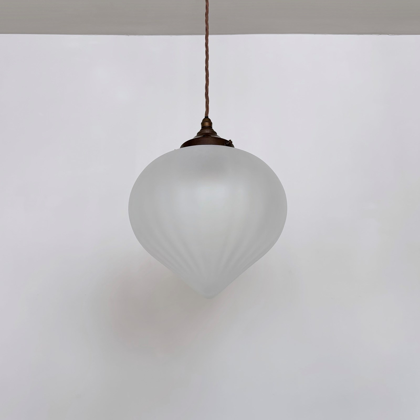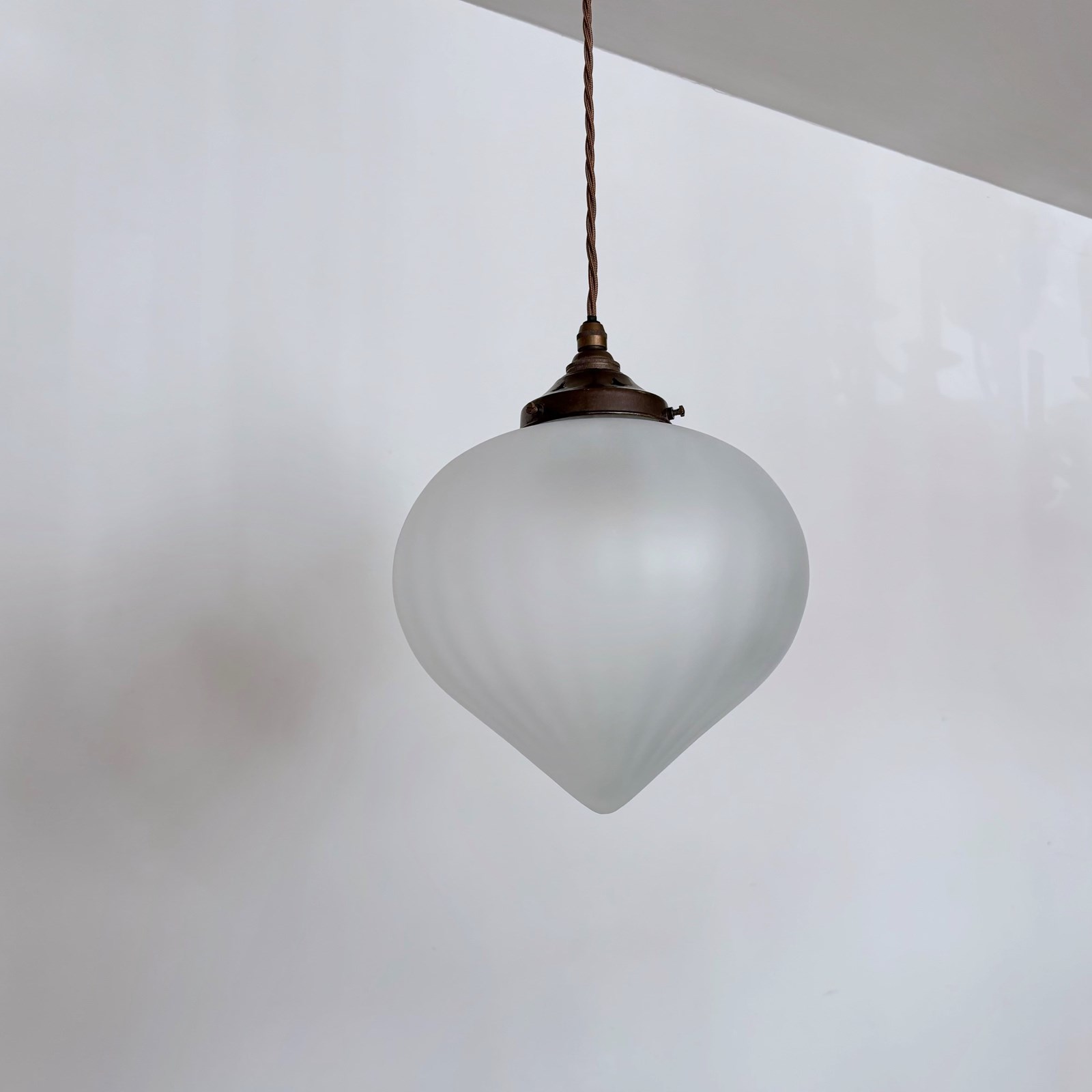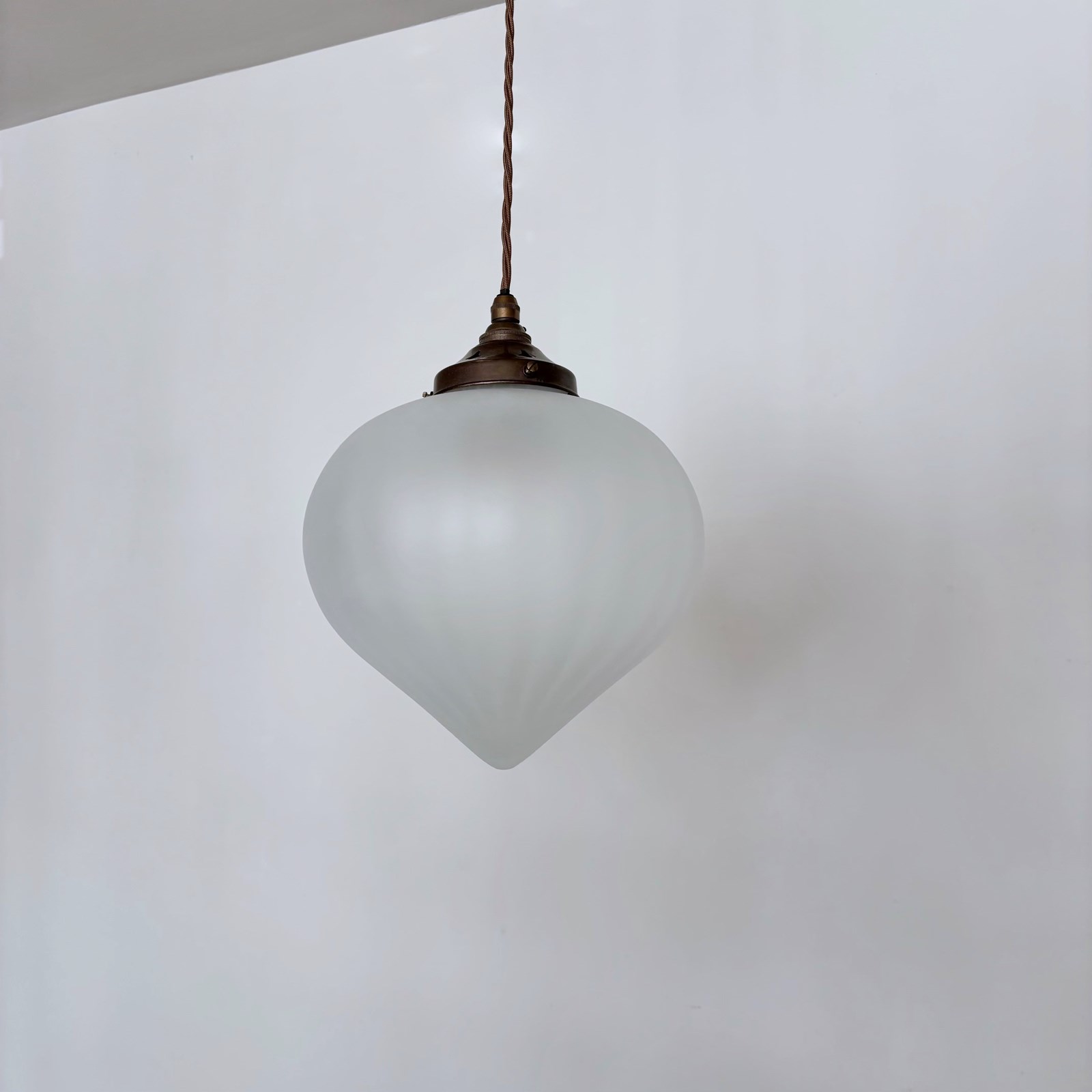 Newly made moulded frosted glass shades. Each newly wired with an antique brass finish fitting and light brown braided cable. Each shade requires one b22 lamp and a matching ceiling fitting is supplied.