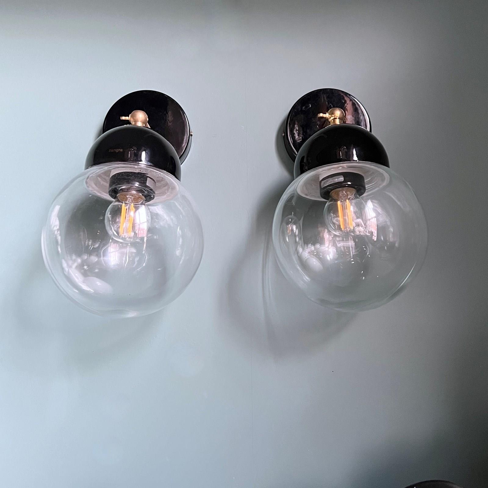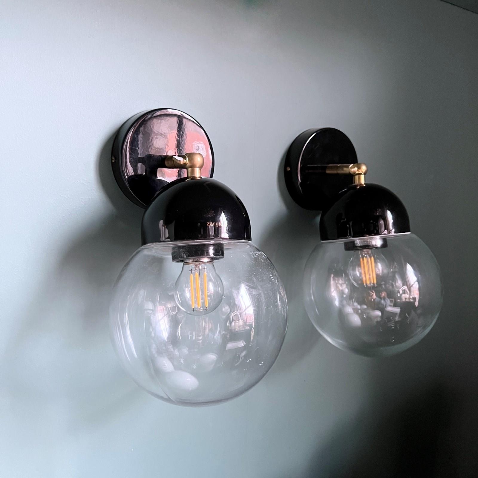 This contemporary wall light has a clear glass globe shade and black porcelain fitting. The brass bar fitting is adjustable and moves through 90 degrees.These pieces are IP21 rated. The light requires one E27 bulb. This is not included.