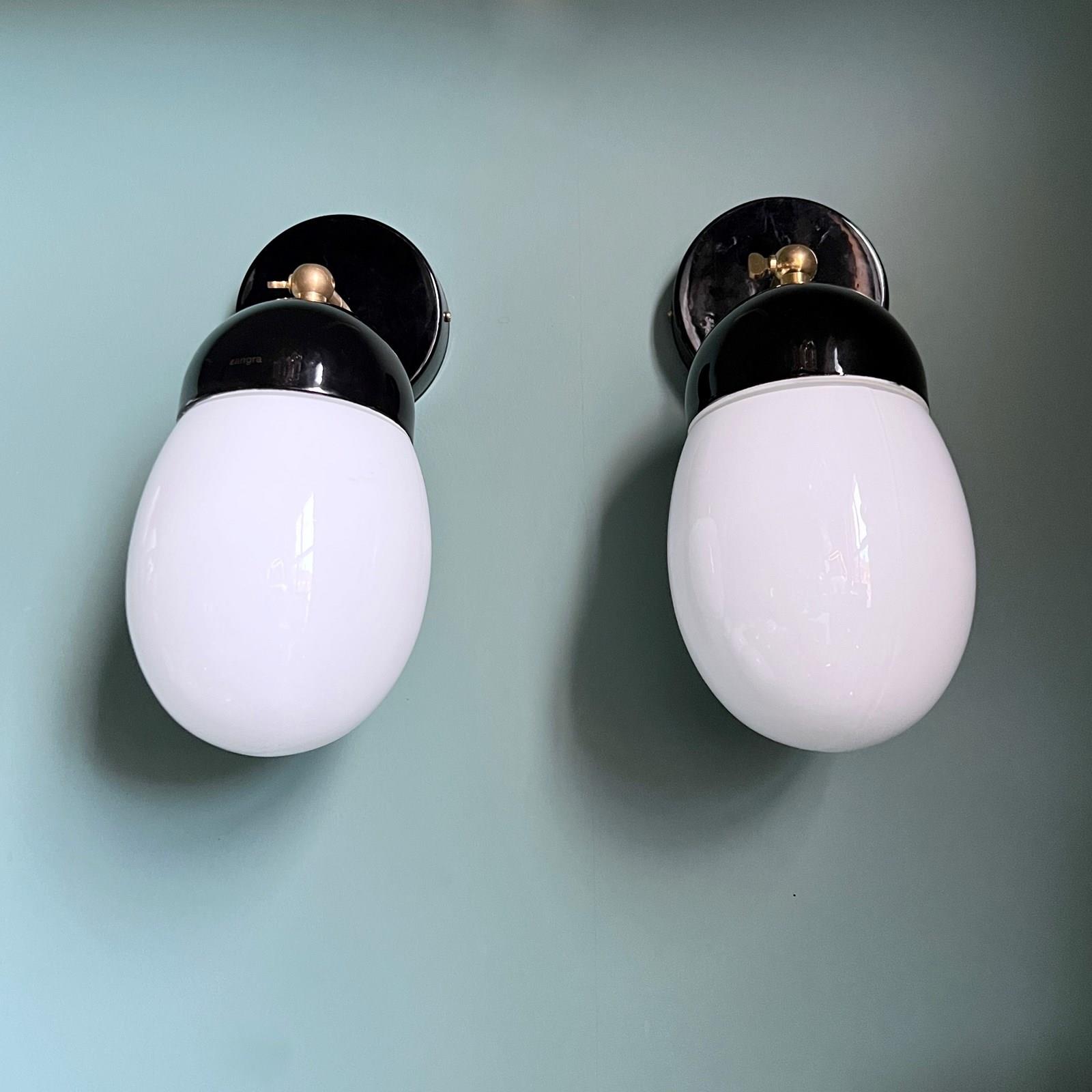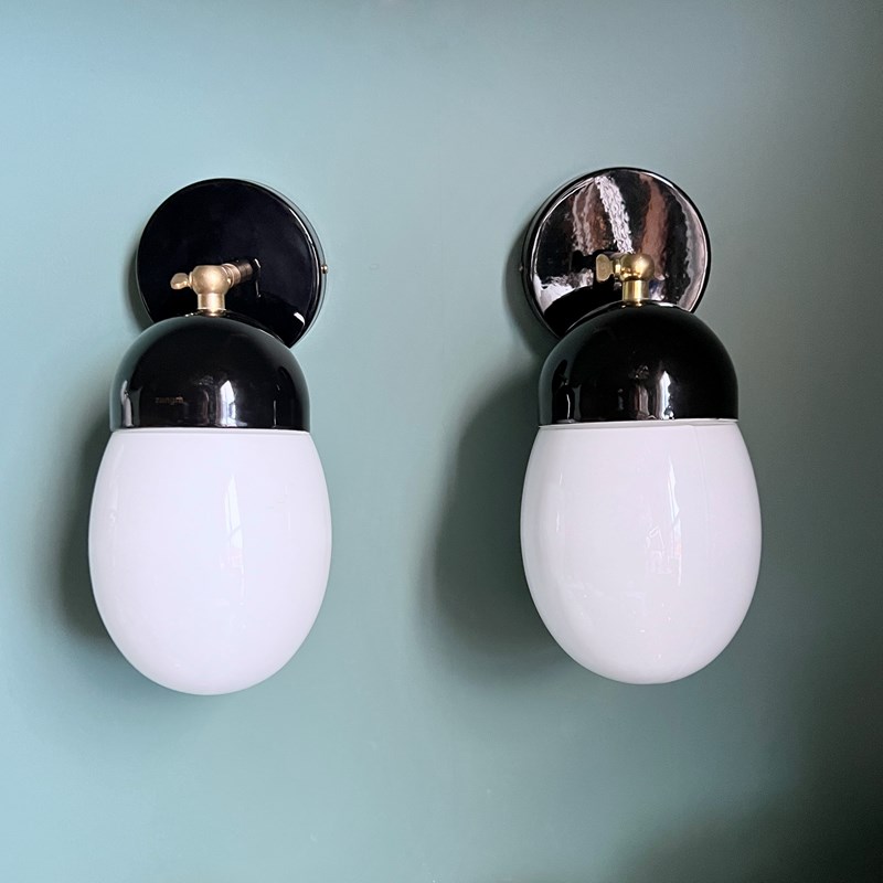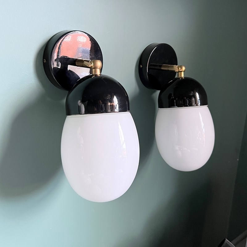 This contemporary wall light has a white enclosed polished glass shade and black porcelain fitting. The brass bar fitting is adjustable and moves through 90 degrees. These pieces are IP21 rated. The light requires one E27 bulb. This is not included.