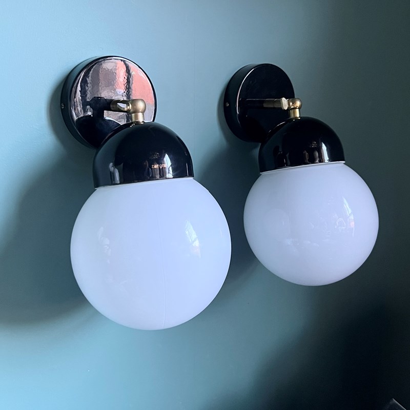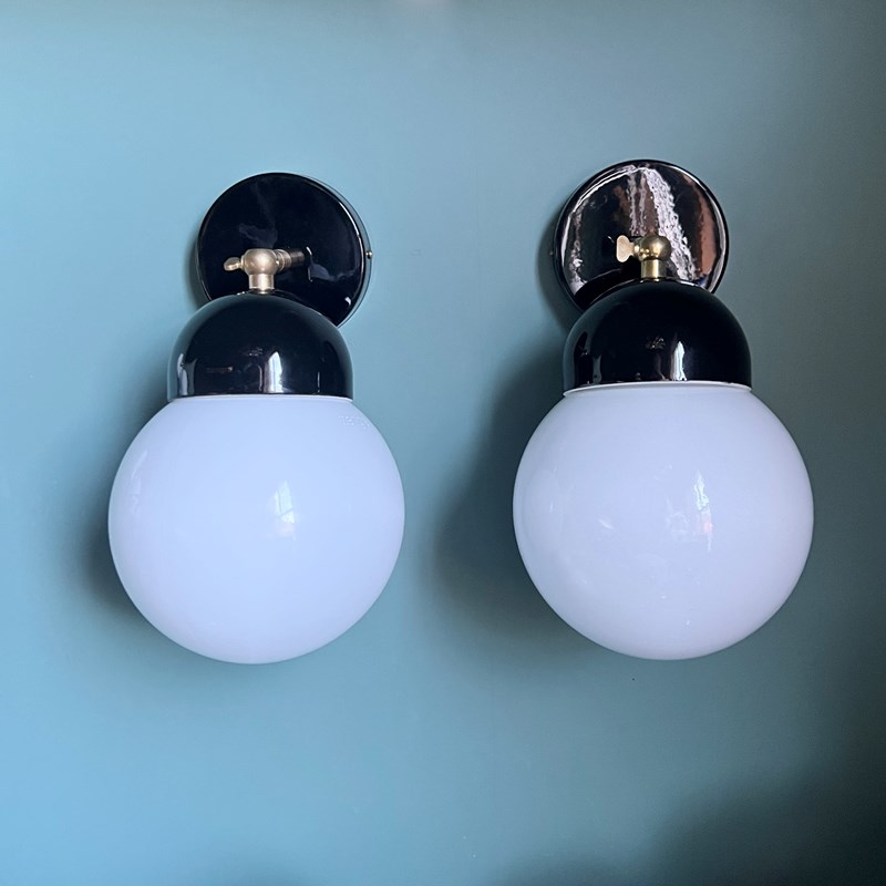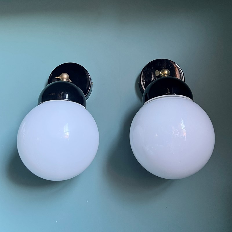 This contemporary wall light has a white polished glass globe shade and black porcelain fitting. The brass bar fitting is adjustable and moves through 90 degrees. These pieces are IP21 rated. The light requires one E27 bulb. This is not included.